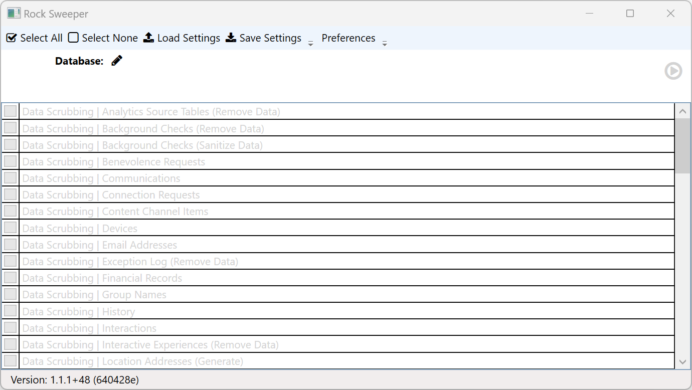 Installation To start with, you will need to download the latest version of the application from here. Download the binary .zip release and then extract it on your computer. Inside the folder you extracted it to you will find the RockSweeper.exe application. Run this. If you have used this application before, you can skip to the next section. Otherwise we'll explain a few things about the program. This program is designed to help you scrub your database of any personal, identifying or sensitive information. For example, changing people's names, addresses, e-mail addresses, etc. All these tasks are broken up into individual actions that can be performed, as seen in the list of checkbox items. Each action performs a fairly specific action. For example, the "History" action cleans up the history table and nothing else. A few actions, such as "Names" branches out into other areas. This action gives all the people in your database random names and then also looks at various related tables and updates those as well. For example, it will look at Prayer Requests and either update the first and last names to match the person record if there is one. If not it will generate a random name. To run the scrubbing process, you click the pencil and enter the information required to connect to your database (the one to be scrubbed, not your production database). Then you turn on/off any actions you want and click the run button. ImportantThis tool should not be treated as a magic eraser. Nothing magic is going on here. This is simply a collection of actions that were created based on looking at real data and deciding what needs to be cleaned up. Never send your database to someone you do not explicitly trust even if it has been scrubbed with this tool. Usage The first step is to click on the pencil and enter the connection string to your database. Next, copy the JSON below and save it to a file called standard-settings.json. It contains the recommended actions to be performed. { "Actions": [ "8b6a47eb-006a-4734-a876-94f20b43b994", "705c42d1-5600-418c-b0bd-7c3a3ac9c982", "9083a514-b9bc-418c-b48f-86355399c37a", "944fea3a-7826-4e9b-9539-eae3f26fa2ac", "1e7dac9c-3002-4896-9dd3-fa2e4964e241", "f489a377-d4a5-4737-9657-53a7b3b7374f", "6ecb7b00-e1ed-44e9-b24e-e4beffbac9f3", "d23bfc10-7c58-4f9c-8497-553a6a5c7c1c", "7d14924a-b367-4495-b480-96b86bcf712b", "89b28ddd-a138-4b59-91e4-ebf8019c1cad", "73a6169f-6552-4dfd-b759-774573280cad", "f6a44b98-2eb0-4e0e-a821-ee5997b9a56d", "02c2d628-ac02-4a36-9f0a-1f4b34c72036", "5cdcf31e-382f-4663-ad26-122814990187", "31200ef0-cad7-4775-8be8-c1a06a591e3f", "dad894c1-933b-4072-84e3-f6ae3320aa74", "8b164228-50a7-4abe-8769-096ea5157a88", "304cf8ff-a70d-4de1-95d0-e4262cf1bfeb", "811a270f-f655-4332-8737-367acf88b496", "d000b0a2-c318-4d72-93df-ed60dd3a015c", "756343a6-3473-4c3b-8ad9-f16ff604ae07", "664802e9-acc4-4257-9585-4a463b706b6b", "7a047807-1a42-413e-899a-b2a1fc90a889", "4f7df3ed-3797-49a5-995c-acd1463458c4", "50b87e79-f539-4fa5-b848-1b7a9fd00cc9", "c81ff0e1-f605-402a-9881-251dbf84c853", "46f34fe1-4577-425d-9cdf-cf54da349365", "f6a44b98-2eb0-4e0e-a821-ee5997b9a56d", "f81ab6fa-a219-40d1-9455-ea66c0d7aef4", "a46a95e5-d2c4-46fc-bffc-225ccc1a3987", "d6a36aad-f7ba-4ada-b018-f6aa4065f6bf", "24ea3e6e-04ab-4896-9174-bc275f67f766", "48f41eef-d394-49b8-a214-27c9f2a2abd0", "8c1155d0-6319-4750-a7ca-0d713740bfde", "d5e352c6-b1bf-405a-9934-6f875725a5c1", "dcb7cde1-7764-4ce4-bbb8-13001c4cc9dd", "ff2e4638-87ba-40eb-bda9-039d8277be8b", "da03b960-1bec-4c55-b966-537970cd6dcd", "e357c385-00bb-499b-b19e-f9438dba5f86", "a68b25fb-6ec2-4d3d-b1de-16aae76c47d6", "4d9f9857-429b-4e1b-8833-8e702bbc7952", "c1770744-9498-4b35-a172-f64ad00f74c0", "4e60e8cf-38aa-4cbd-9fd2-013ae2aab95a", "405bb345-d1a4-4bc3-861c-9fab90c0c2da", "57da3ba1-4166-446a-a998-be7229a32b52", "5e27c631-3681-4d1b-b50c-0e5f3898e541", "afee211e-2a2d-4d85-a428-81ac95637ed6", "59fd05b1-0263-4442-9d63-7491e254bcd1", "6be04438-0725-4ec6-b5be-adc2a03ab028" ] } Click the "Load Settings" button and then select the file, you should see the various selected actions get checked. Next, click the Run button. A new window will come up that shows you the progress of each action and the entire process. NoteWhile the operation is running, the sleep mode on your computer is disabled. Manually putting the computer to sleep will still work, but the idle timeout will not. If everything worked correctly, you can close the application and move on to the task of transporting the database.