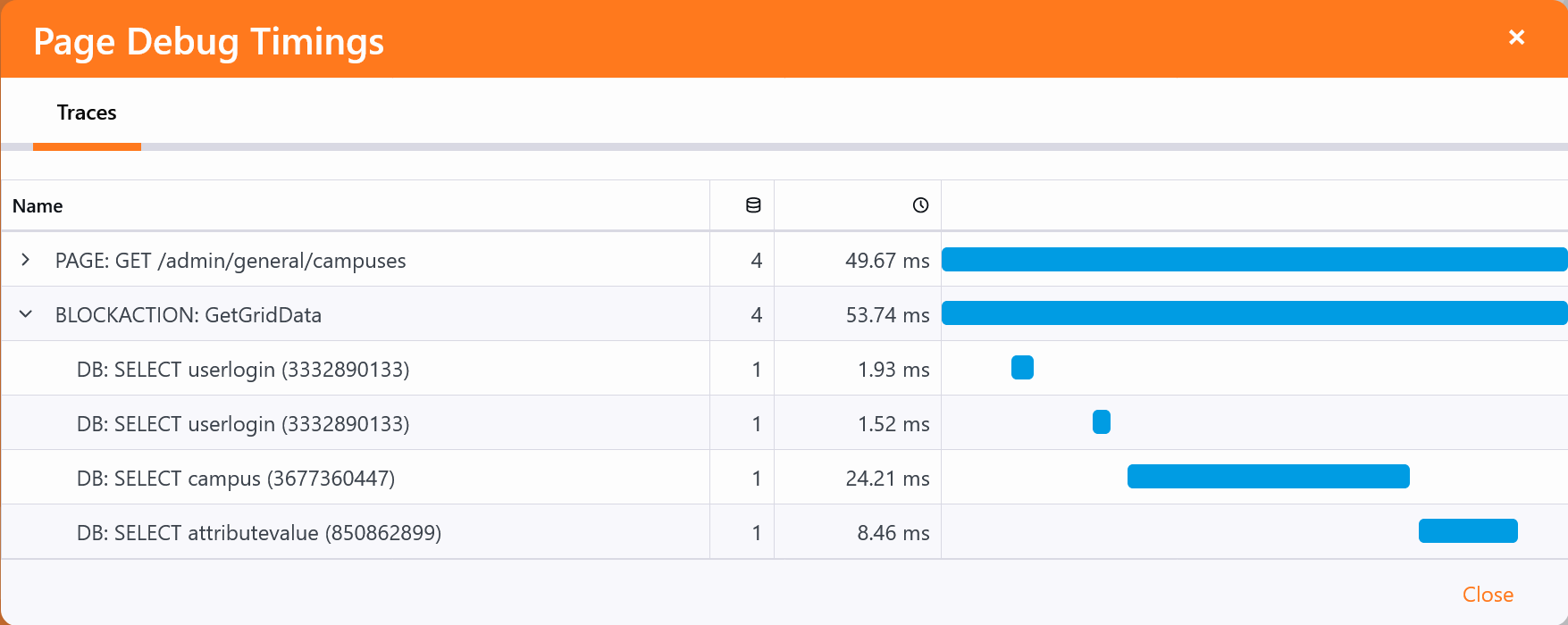 Overview Performance should be at the forefront of our minds whenever we are writing code. Rock is used by churches of all sizes. Some with congregations as small as a hundred, and some as large as hundreds of thousands. So just because something is fast on your small test database; does not mean it will be fast on a database of 50GB. Observability One of the ways we can do performance testing is with Observability. This is a feature of Rock that is built on top of the standard Open Telemetry system. This allows you as a developer to both add "spans" to wrap sections of code that you think might take a long time to run as well as view the data. In Rock and C# these are called activities, though most reporting tools will refer to them as spans with the root span of a request being referred to as an activity. External Tool The core team uses Microsoft's Aspire tool during development. There is a private repository that has some bat files to quickly get Aspire started in Docker, but there is nothing magic so non-core teams can launch Aspire any way they prefer. Installing Aspire requires three general steps. Once these steps are done you can start and stop Aspire from inside the Docker Desktop GUI. Enable WSL if you haven't already by running this from an Administrator PowerShell: wsl --installInstall Docker Desktop. During installation make sure to use the WSL backend.Start up Aspire in Docker using either the above repository file or by manually entering the command: docker run --name aspire --detach --env DOTNET_DASHBOARD_UNSECURED_ALLOW_ANONYMOUS=true -p 18888:18888 -p 4317:18889 -p 4318:18890 mcr.microsoft.com/dotnet/aspire-dashboard:latest Rock should then be configured to use Aspire by going to the System Configuration page. In the Observability panel, set the URL to http://localhost:4317/ and the Endpoint Protocol to Grpc. Finally enable the all features: Traces, Metrics, Logs. Internal Tracing Starting in Rock v19 you can also show much of the same information without configuring any external tool. To do this, click the "Page Load Time" message in the admin footer bar. This will reload the page and then open a modal that shows you the Observability data of the page load. The request for the initial page load will be displayed along with any additional requests from API calls or block actions that were executed by the page. If you need to test a block action or API call triggered by a user interaction, you can close the modal and perform the action. Then back in the admin footer bar, next to the Page Load Time there will be an "open external" icon. You can click this to open the modal again to view the additional requests. The column with the database icon will tell you how many database queries were executed by that span, including all descendant spans.