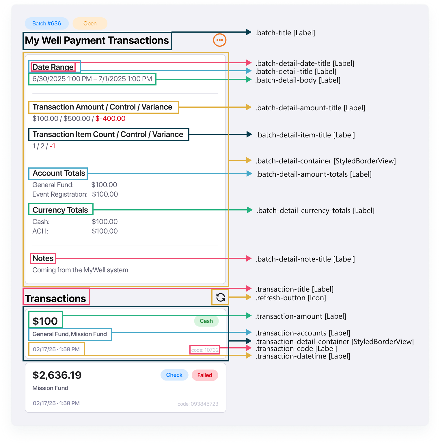 Display the batch detail. Overview This block provides functionality for managing financial batches. It allows you to view and edit the details of existing batches. In addition, it integrates with Azure Document Intelligence, enabling you to scan checks, automatically extract MICR (Magnetic Ink Character Recognition) data, and allocate funds to the appropriate financial accounts. This reduces manual data entry, improves accuracy, and streamlines the batch processing workflow. M v7.0C v18 Block Configuration Transaction Detail Page The page to navigate to when a batch transaction is clicked. Accounts The list of accounts that can be selected for fund allocation. Document Intelligence API Key The API key for Azure Document Intelligence. Required for check processing. Document Intelligence Endpoint The endpoint for Azure Document Intelligence. Required for check processing. Accounts Allocation Required Specifies whether fund allocation to accounts is required. Required Control Amount Specifies whether a control amount is required when adding batches. Required Control Item Count Specifies whether a control item count is required when adding batches. Styling