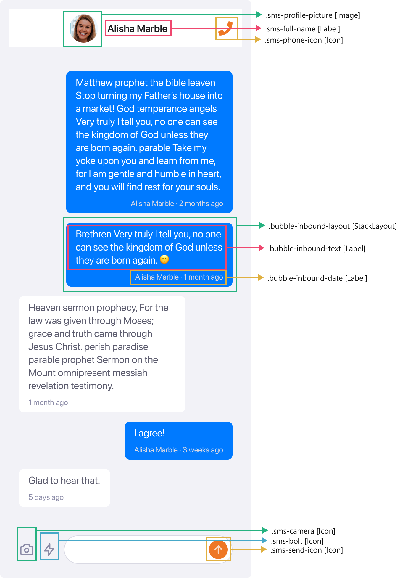 Manage an SMS message conversation with a modern UI. M v5.0 C v15.0 Configuration Snippet Type The type of snippets that will be made available via the snippet keyboard button. Message Count The number of messages to be returned each time more messages are requested. Database Timeout The number of seconds to wait before reporting a database timeout. Page Parameters The following query string parameters are recognized and utilized by this block. NameTypeDescription PhoneNumberGuidGuidThe Rock phone number that should be used for this conversation. PersonGuidGuidThe Guid of the Person to be communicated with. Styling Message Bubbles To style message bubbles, we introduced the following custom CSS classes. ValueTypeDescription -rock-inbound-background-colorColorThe color of the inbound messages background. -rock-inbound-text-colorColorThe color of the inbound messages text. -rock-outbound-background-colorColorThe color of the outbound messages background. -rock-outbound-text-colorColorThe color of the outbound messages text. You can target these elements by using the ^MessageBubble selector. ^MessageBubble { -rock-inbound-background-color: orange; } Styling