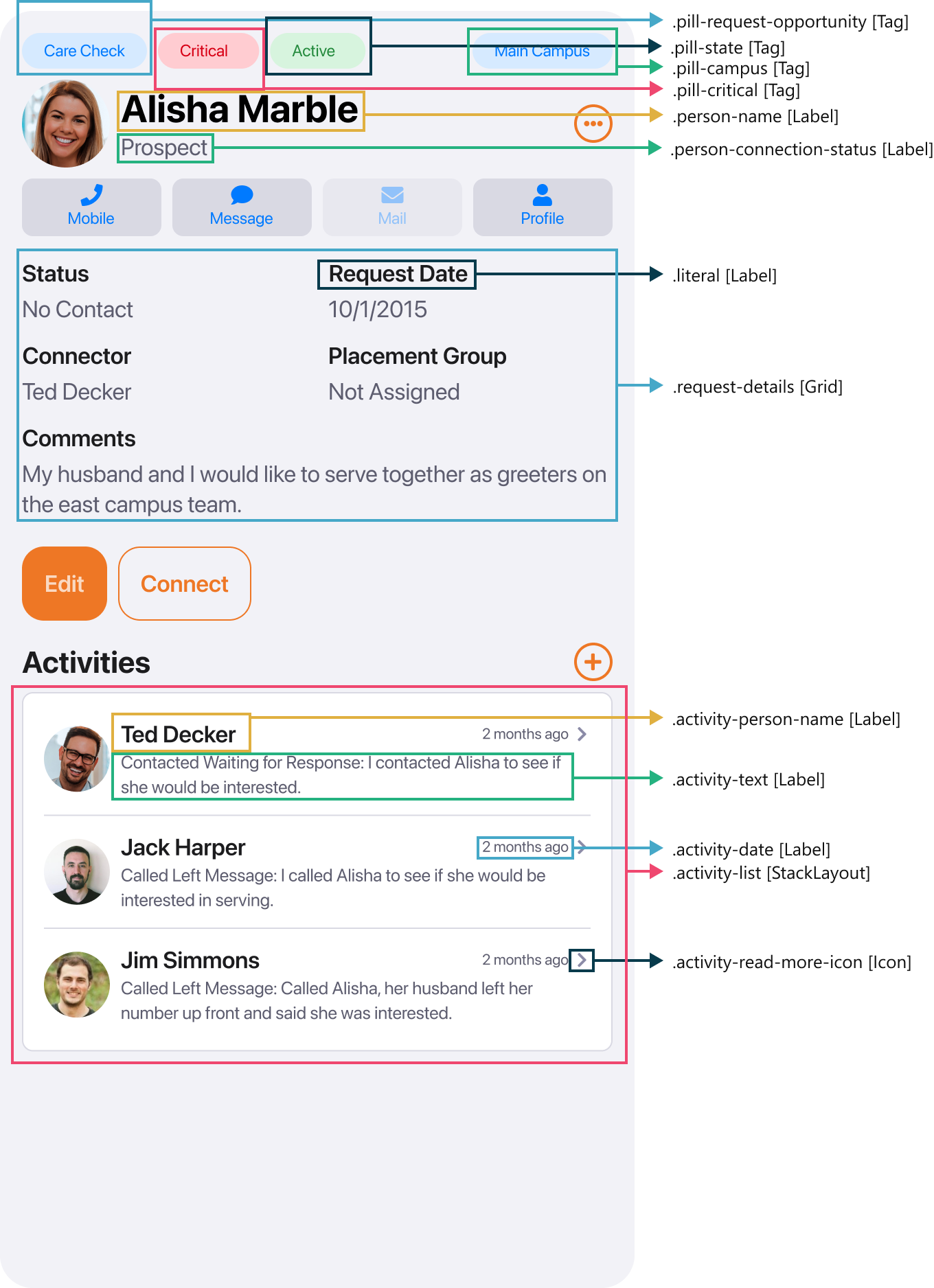 M v3.0C v13.3 This block is used to display details for a particular connection request. If you are unfamiliar with Connections in Rock, please refer to the connections manual. Style Classes ClassElementDescription connection-request-detail-layoutScroll ViewOuter content wrapper connection-request-detail-frameFrameMain content wrapper connection-request-detail-contentStackLayoutContent within frame wrapper status-pill-layoutFlexLayoutPill content wrapper contact-button-[xxx]Button[Name of action] (Ex: Mobile) request-activities-frameFrameWrapper around activities section request-activitiesStackLayoutWrapper of activity content add-activity-sheetStackLayoutWrapper of content in CoverSheet activity-containerGridIndividual activity wrapper Block Configuration Parameters KeyType ConnectionRequestGuidGuid ConnectionRequestId Cv16.1Id Header Template This is the content that is rendered above the lists of your requests. This allows you to put a logo, header, or do whatever you like to style the top of this block. Merge Fields Merge fields are fields that are available to use within the template. So in the header template, you have access to these objects: FieldTypeProperty ConnectionRequestConnectionRequestThe specific connection request, as retrieved by the corresponding Guid. Activity Template This is the main template that is used to display the details of the request/activity. You can fully customize this template to style and provide the exact functionality you want. Merge Fields In the opportunity template, you have access to these objects: FieldTypeDescription ConnectionRequestConnectionRequestThe specific connection request, as retrieved by the corresponding Guid. ActivitiesList<ConnectionRequestActivity>A list of all the corresponding activities for the particular request. No Activities Content You may have noticed in some other blocks, there is a block setting to provide content when there is nothing to display. Often seen as something like a: <NotificationBox Text="There are no corresponding activities." /> We have decided to make this an even easier piece of the puzzle to set, by including it in the template itself. If you wish to customize this content, the piece you are looking for is: {% if ConnectionOpportunities == empty %} //- Put your content here! {% endif %} Page Settings Person Profile Page M v5.0 When the profile button is pressed, this is the page that will be pushed. Out of the box, the profile button provides the PersonGuid through a query string parameter upon navigating to this page. If this setting is left blank, the Profile action button will not be shown. Group Detail Page When the group button is pressed, this is the page that will be pushed. The group button passes the GroupGuid through a query string parameter. Workflow Page When the workflow button is pressed, this is the page that will be pushed. This button passes the WorkflowGuid through a query string parameter. Reminder Page If supplied, a Reminder button will be shown that will display the selected page within a cover sheet. Styling