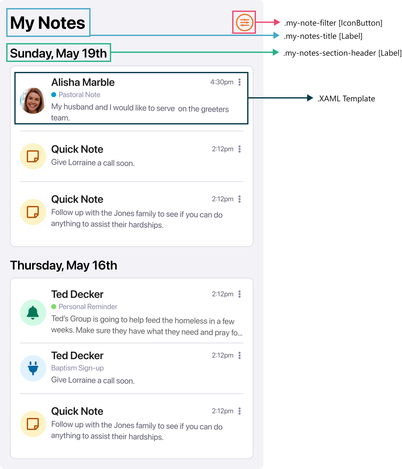 View and comprehensively manage any note you have created. Mv6.1 Cv16.7 Integrated Scroll WarningFluid is the required Lava Engine Liquid Framework Block Configuration Note Item Template This template is pretty complicated. It is what is displayed for each note item in the list. There are a handful of merge fields and commands that you can use to customize this template. Merge Fields PropertyDescription Note A custom object containing useful information about the note. You can all of the properties available here. PersonEntityTypeIdThe ID of the system Person entity type. PersonAliasEntityTypeIdThe ID of the system Person Alias entity type. PersonAliasEntityTypeGuidThe GUID of the system Person Alias entity type. ReminderEntityTypeIdThe ID of the system Reminder entity type. ConnectionEntityTypeIdThe ID of the system Connection Request entity type. ReminderNoteTypeGuidThe GUID of the configured Reminder Note Type (to use for new reminders). ConnectionNoteTypeGuidThe GUID of the configured Connection Request Note Type (to use for new connections). PersonDetailPageThe GUID of the configured person detail page. ReminderDetailPageThe GUID of the configured reminder detail page. ConnectionDetailPageThe GUID of the configured Connection Request detail page. AddConnectionPageThe GUID of the configured Add Connection Page. GroupNotesByDateWhether or not you have configured this block to group the notes by the date they were left. Commands Commands DeleteNoteTriggers a deletion of the note. If this note has a linked reminder or connection, it will prompt the individual to ask if they want to delete the note or both the note and linked entity. ShowNoteDetailPushes to an edit view of the note. EditNoteShows a cover sheet allowing someone to edit a note. LinkToPersonShows UI to link the note to a person. Only works on notes that are not currently linked to an entity. Enable Swipe for Options If enabled, the note will be both left and right swipe-able with options to add a reminder, connection, link to person, edit or delete. Person Note Types The note types to allow when linking a note to a person. If none are checked, all of the note types will be included. Reminder Note Types The note type to update the note to when adding a reminder from the note. Connection Note Type The note type to update the note to when adding a connection request from the note. Person Profile Detail Page The page to use to view the details of a person. Reminder Detail Page The page to use to edit or add a reminder. Add Connection Page The page to use when adding a new connection from the note. Connection Detail Page The page to use when viewing the details of a connection request. Group Notes by Date Whether or not the notes should be grouped by the date they were left. Note Items The Note item you have access to in the Note Item Template has the following properties available to you. PropertyTypeDescription IdintThe ID of the Note. GuidGuidThe GUID of the note. EntityIdintThe ID of the entity associated with this note. EntityGuidGuidThe GUID of the entity associated with this note. NoteTypeIdintThe ID of the note type. NoteTypeGuidGuidThe GUID of the note type. NoteTypeEntityTypeIdintThe ID of the Entity Type associated with the Note Type. EntityNamestringThe friendly name of the linked entity. NoteTextstringThe text of the note. NoteDateDateTimeThe date that the note was created. NoteTypeNamestringThe friendly name of the Note Type. PhotoUrlstringIf this is a person note, this value will be the PhotoUrl of the person. IsPrivateNoteboolWhether or not this note is private. IsAlertboolWhether or not this is an alert note. Styling