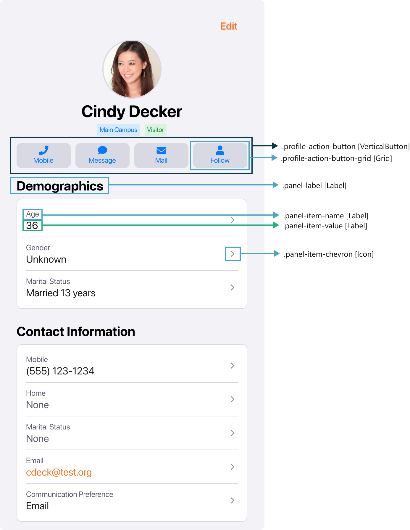 M v5.0C v15.2 Display and edit information about a Person. Getting Started This block is pretty straightforward to get working. The only thing really required is a Person context, which can be configured through the page settings. Navigate to Mobile Applications > Person Profile Page > Edit. Under Advanced Settings, set the Person Parameter Name of the Context Parameters. Block Configuration Phone Types The phone number types to display. Header Template The template that displays at the very top of the block. Commands The header template has access to the following specialized commands. CommandParameter TypeDescription ShowEditn/aIf allowed (through security authorization checks), displays a cover sheet containing the Person Profile edit information. Merge Fields The header template gets supplied the following merge fields. FieldTypeDescription PersonRock.Model.PersonThe Person retrieved from context. CanEditboolA value depicting whether or not the CurrentPerson has authorization to edit the Person retrieved from context. Custom Actions Template The template that displays underneath the contact buttons supplied by the block. Merge Fields FieldTypeDescription PersonRock.Model.PersonThe Person retrieved from context. Badge Bar Template The template that displays underneath the Custom Actions Template. Merge Fields FieldTypeDescription PersonRock.Model.PersonThe Person retrieved from context. Show Demographics Panel A boolean value depicting whether or not the demographics panel should be shown. Show Contact Information Panel A boolean value depicting whether or not the contact information panel should be shown. Reminder Page If selected (and there is a valid reminder type), a 'Reminder' button will be shown that shows this page in a cover sheet. Styling