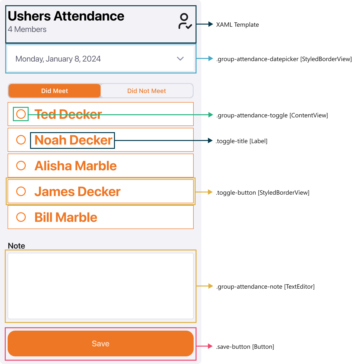 This block displays a list of group members that can be selected to mark attendance for a specified date. You can read more about group attendance here in the Rock Your Groups manual. ImportantUnlike the web, groups must have a schedule configured in order to use this block. Parameters NameTypeDescription GroupGuidGuidThe guid of the group you wish to mark attendance for. Settings PropertyDescription Number of Days Forward to AllowThe number of days forward to allow attendance to be entered for. Number of Days Back to AllowThe number of days back to allow attendance to be entered for. Save Redirect PageWhen the 'Save' button is pressed, this is the page that is navigated back to. If Show Save Button is disabled, this will be irrelevant. Show Save ButtonWhether or not you want to display the save button. Allow Any Date SelectionWhether or not any custom date can be selected. Show Attendance NotesWhether or not the text field for note entry will be visible. Attendance Note LabelThe attendance label that appears above the notes field. If Show Attendance Notes is disabled, this will be irrelevant. Styles ClassElementDescription group-attendance-entry-layoutStackLayoutOuter content wrapper headerContentViewHeader content wrapper dividerDividerApplies to all dividers notesText EditorThe conditional notes editor save-buttonButtonThe conditional save button