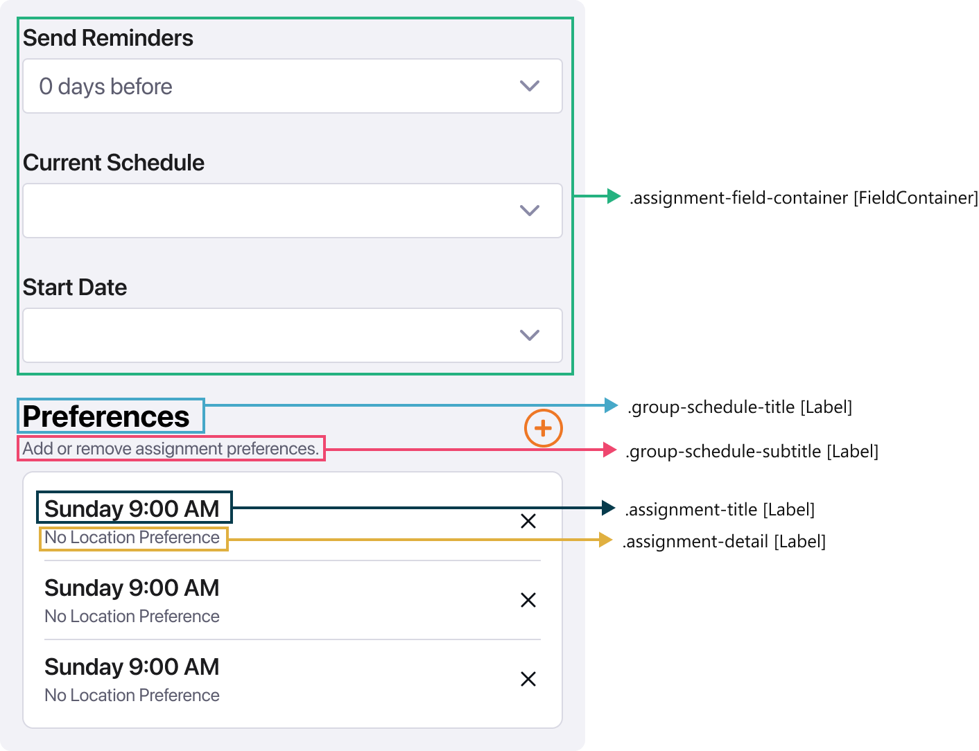 Set your preferences for group scheduling. M v4.0C v13.3 This allows an individual to set their scheduling preferences, so an administrator (and auto-scheduling) knows their preferred dates, times, and locations. If you are unfamiliar with group scheduling in Rock, please refer to the Rock Your Groups - Group Scheduling manual. Group Selection If a user is enrolled in more than one group that has group scheduling enabled, it will first prompt them with a group selection page, provided in the screenshot below. If an individual is not enrolled in any groups, a friendly message is displayed to reach out to the church if they are interested in volunteering. With "Children's" and "Greeters" being the groups that the individual is enrolled in. This allows a user to set their preferences on a per-group basis. Preferences This is the screen that an individual can update their preferences on. It will automatically update when the user changes the value, with a friendly ShowToast to notify them that it was successful. Add Assignment The 'Add Assignment' button will prompt them with a modal to allow an individual to request exact group scheduling opportunities, as exampled below: When this form is submitted, it is reflected in the Preferences page with a friendly ShowToast stating it was successful. Styling
