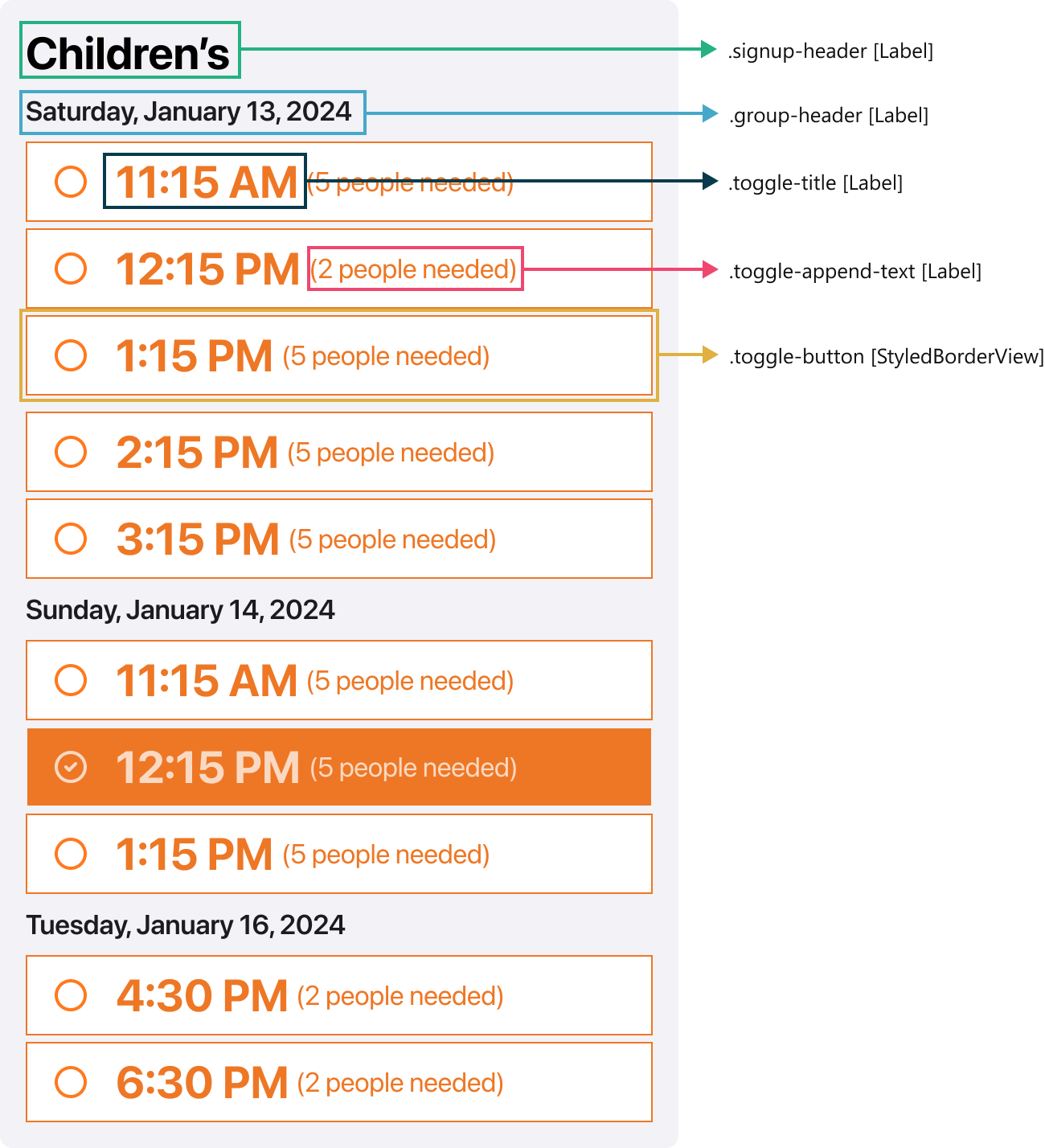 M v4.0 C v13.3 Integrated Scroll This allows an individual to sign up for additional scheduling opportunities, instead of having to be scheduled for a particular location and time through an administrator. This block is heavily dependent on group configuration for scheduling so if you are unfamiliar with group scheduling in Rock, please refer to Rock Your Groups - Group Scheduling. Future Weeks to Show This block setting sets how many weeks into the future you would like an individual to be able to sign-up for. For instance, if today is 6/1/2022, and I have this block setting set to '6', I will be able to sign up for dates and times through 7/15/2022. Group Selection If a user is enrolled in more than one group that has group scheduling enabled, it will first prompt them with a group selection page, provided in the screenshot below. If an individual is not enrolled in any groups, a friendly message is displayed to reach out to the church if they are interested in volunteering. Schedule Sign-Up When there are available schedules, a user can easily scroll through and click the dates and times that work for them. If there are multiple locations, a friendly action sheet is displayed that allows an individual to specify a location preference, or not. Scheduler Receive Confirmation Emails When enabled, the scheduler will receive an email for each confirmation or decline. Note that if a Group's "Schedule Coordinator" is defined, that person will automatically receive emails. Scheduling Response Email The system communication used to send emails to the scheduler for each confirmation or decline. If a Group's "Schedule Coordinator" is defined, this will also be used when sending emails. Styling
