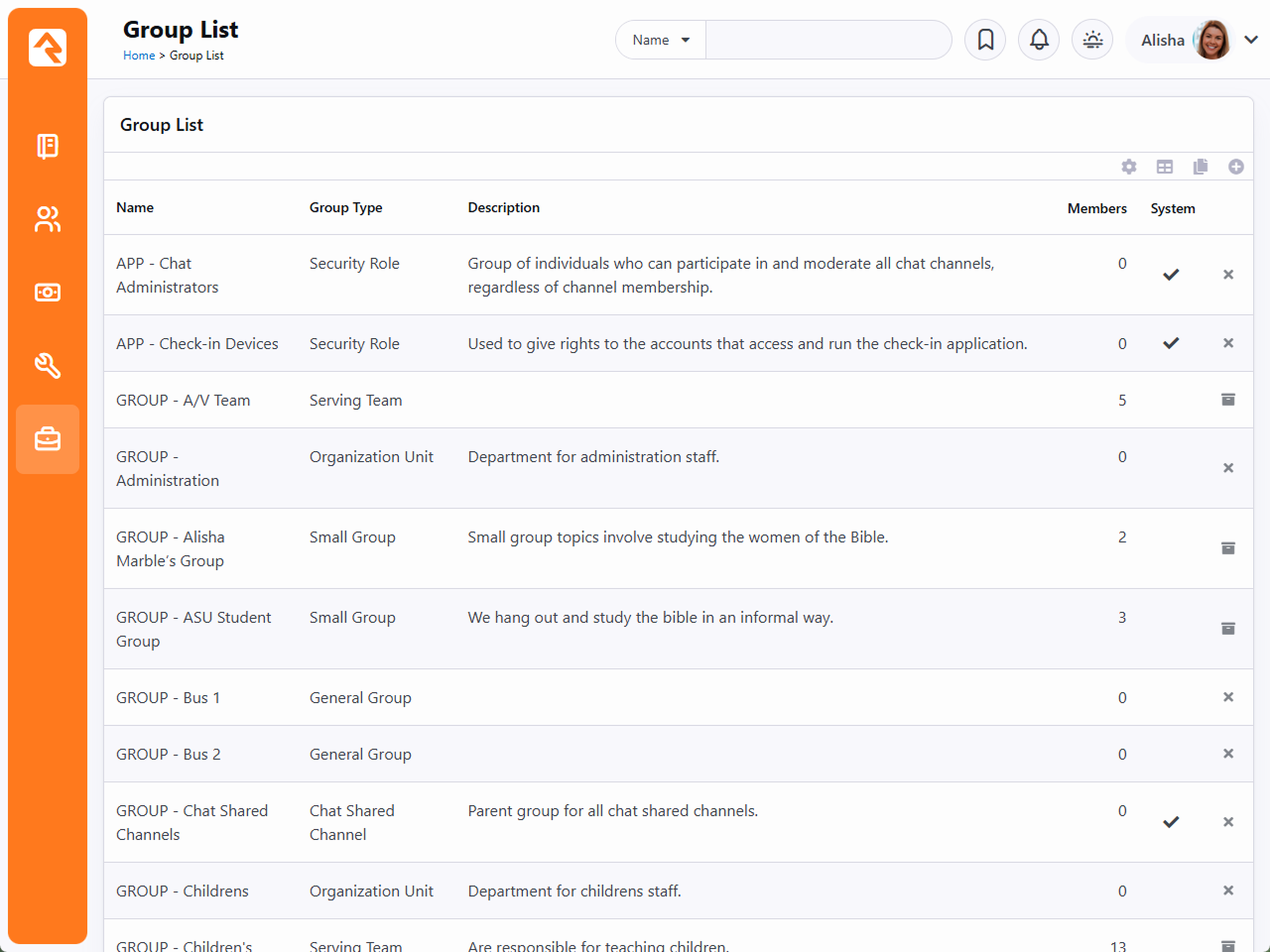 • Check-in Groups: Rock's check-in features use groups to store the locations where kids can check in, and to track attendance.