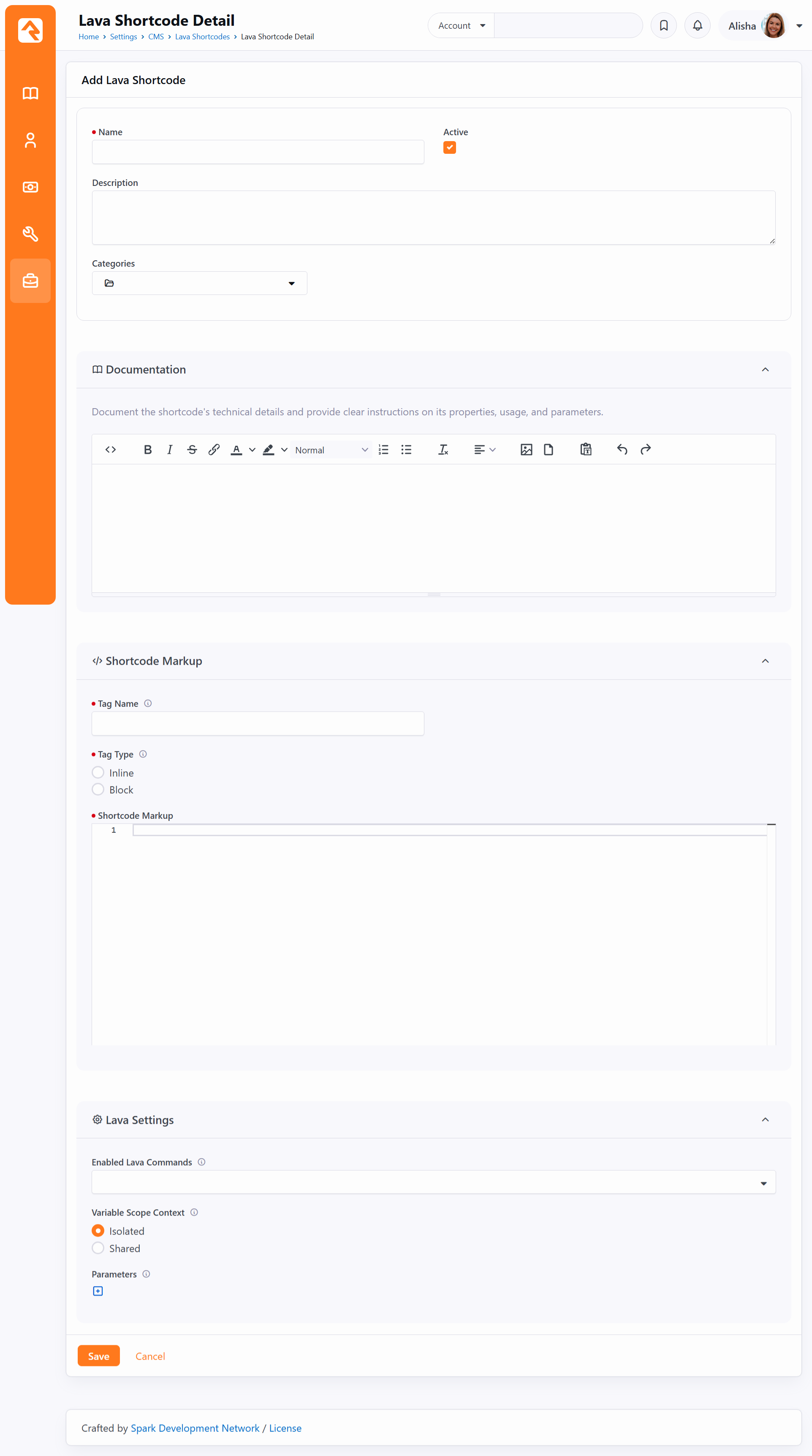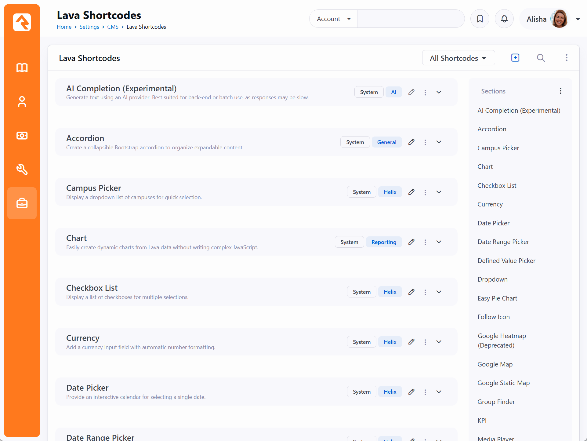 Authoring Shortcodes Writing shortcodes is simple. They're just Lava templates. Below are a few points to keep in mind as your write your own shortcodes. Select The Proper Shortcode Type As we already mentioned it's very important that you select the proper type of shortcode before you start using it. Changing it in the future means having to update all of your Lava templates that use it. The biggest factor in your decision of which type to use will be how much data your shortcode will pass and if any of the data has repeating sections. Let's consider a couple examples. The parallax shortcode needs to access a large amount of HTML to place inside the parallax section. While this could be passed through a standard parameter {[ parallax content:'... ]} this would be limiting in a number of ways. For example, the content could not have any line breaks and it would not be allowed to have any single quotes. Consider next the googlemap place holder. It allows you to enter a variable number of map points. Again, you could use a single inline parameter, but this would be very difficult for the person who wanted to use your shortcode. Finally, think about the youtube shortcode. In this example only a small amount of configuration is required, so an inline shortcode works great. It comes down to how much data is being passed by the shortcode. For larger amounts of data, use the block shortcode type. For lesser amounts, use inline. Configuring Parameters You can configure parameters when setting up your shortcodes. While you technically don't need to configure parameters, any parameter that another person adds to the shortcode will be passed to your Lava template. Configuring the parameters when you write your shortcode provides two advantages. Configuring the parameter guarantees that it will exist when it's passed to your Lava. This means you don't have to check for its existence. Instead, if you need to check if the parameter has a value, you can do a simple check to see if it's empty. Configuring a parameter allows you to provide a default value. Again, this simplifies your Lava and reduces the number of lines of code you'll need to write. The Lava you develop for your shortcode is passed in all of the parameters found on the shortcode tag as well as any parameters you defined as the author. Rock also provides an additional parameter 'uniqueid' which is a unique identifier for you to use for things like CSS id's and variables in your Javascript. It takes the form of 'id-4535a4a9-1b82-4d5b-9120-8c9c41eefcd6'. You don't need to use this identifier, it's just provided as a convenience to you. Note: Your parameter keys need to be all lowercase for them to work properly; this is typical practice in Lava but is enforced here. Keys with uppercase characters will always return the default value that you provide in the shortcode definition and will not be able to be set from the HTML block where you are calling the shortcode from. Enabled Lava Commands You can enable certain Lava commands to be able to run within your shortcode. These commands do not need to be configured in the source block to run. For instance, if your shortcode is being used on a web page and requires the RockEntity command, the HTML Block does not need to have the command enabled if you've configured access on your shortcode. Adding Lava Shortcodes in Rock Lava Shortcodes can be found at Admin Tools > CMS Configuration > Lava Shortcodes. Lava Shortcodes Pictured above, you can assign categories to your shortcodes. This lets you group shortcodes according to their function, and allows you to filter the list of shortcodes by category. A single shortcode can be assigned to multiple categories. The categories for a shortcode can be added from the Lava Shortcode Detail page, pictured below. We want to ensure the shortcode list is searchable in this manual. For this reason, we've listed below the shortcodes that are pictured above. Name Description AccordionAllows you to easily create a Bootstrap accordion control. AI Completion (Experimental)Processes a completion using a AI provider. Campus PickerDisplay a dropdown list of campuses for quick selection. ChartAdding dynamic charts to a page can be difficult. The chart shortcode allows anyone to create charts with just a few lines of Lava. CurrencyAdd a currency input field with automatic number formatting. Date PickerProvide an interactive calendar for selecting a single date. Date Range PickerLet users select a start and end date using a single control. Defined Value PickerDisplay a dropdown populated with defined values from Rock. DropdownCreate a standard dropdown menu for single-option selection. Easy Pie ChartLightweight plugin to render simple, animated and retina optimized pie charts. Follow IconAdd an icon with the ability to follow any entity with a click. Google HeatmapAdd an interactive visualization to depict the intensity of data at geographical points. Google MapAdd interactive maps to your site with just a bit of Lava. Google Static MapEasily allow you to add Google static maps without having to remember complex settings. KPICreate quick key performance indicators. Media PlayerMedia Player displays a single URL or a Media Element in a player. MemoDisplay a multi-line text area for longer input or notes. Network GraphDisplays a set of data as a diagram showing how different nodes are interconnected. PanelThe panel shortcode allows you to easily add a Bootstrap panel to your markup. ParallaxAdd a scrolling background to a section of your page. Radio Button ListDisplay a list of radio buttons for single-choice selection. Range SliderInclude an adjustable slider control to select numeric values or ranges. Sankey DiagramShow data flow between nodes using a Sankey diagram visualization. Scheduled ContentThe scheduled content shortcode will show/hide a block of content based on a provided Rock schedule. ScripturizeScripturize reads through text finding scripture references and con