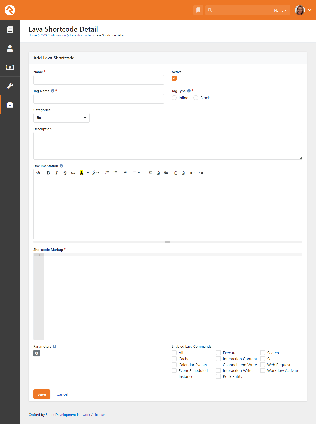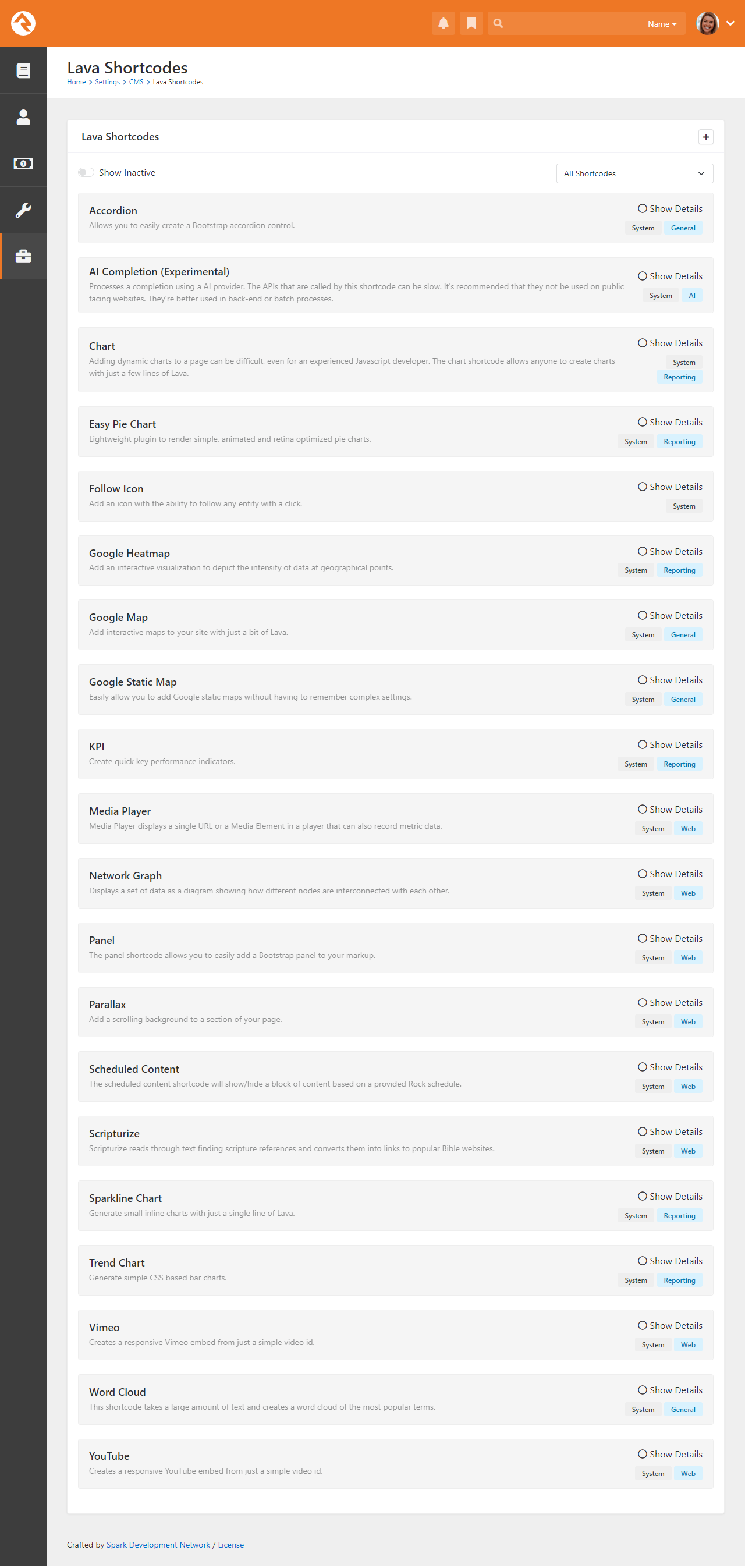 Writing shortcodes is simple. They're just Lava templates. Below are a few points to keep in mind as your write your own shortcodes. Select The Proper Shortcode Type As we already mentioned it's very important that you select the proper type of shortcode before you start using it. Changing it in the future means having to update all of your Lava templates that use it. The biggest factor in your decision of which type to use will be how much data your shortcode will pass and if any of the data has repeating sections. Let's consider a couple examples. The parallax shortcode needs to access a large amount of HTML to place inside the parallax section. While this could be passed through a standard parameter {[ parallax content:'... this would be limiting in a number of ways. For example, the content could not have any line breaks and it would not be allowed to have any single quotes. Consider next the googlemap place holder. It allows you to enter a variable number of map points. Again, you could use a single inline parameter, but this would be very difficult for the person who wanted to use your shortcode. Finally, think about the youtube shortcode. In this example only a small amount of configuration is required, so an inline shortcode works great. It comes down to how much data is being passed by the shortcode. For larger amounts of data, use the block shortcode type. For lesser amounts, use inline. Configuring Parameters You can configure parameters when setting up your shortcodes. While you technically don't need to configure parameters, any parameter that another person adds to the shortcode will be passed to your Lava template. Configuring the parameters when you write your shortcode provides two advantages. Configuring the parameter guarantees that it will exist when it's passed to your Lava. This means you don't have to check for its existence. Instead, if you need to check if the parameter has a value, you can do a simple check to see if it's empty.Configuring a parameter allows you to provide a default value. Again, this simplifies your Lava and reduces the number of lines of code you'll need to write. The Lava you develop for your shortcode is passed in all of the parameters found on the shortcode tag as well as any parameters you defined as the author. Rock also provides an additional parameter 'uniqueid' which is a unique identifier for you to use for things like CSS id's and variables in your Javascript. It takes the form of 'id-4535a4a9-1b82-4d5b-9120-8c9c41eefcd6'. You don't need to use this identifier, it's just provided as a convenience to you. NoteHeads Up! Your parameter keys need to be all lowercase for them to work properly; this is typical practice in Lava but is enforced here. Keys with uppercase characters will always return the default value that you provide in the shortcode definition and will not be able to be set from the HTML block where you are calling the shortcode from. Enabled Lava Commands You can enable certain Lava commands to be able to run within your shortcode. These commands do not need to be configured in the source block to run. For instance, if your shortcode is being used on a web page and requires the RockEntity command, the HTML Block does not need to have the command enabled if you've configured access on your shortcode. Adding Lava Shortcodes in Rock Lava Shortcodes can be found at Admin Tools > CMS Configuration > Lava Shortcodes. Lava Shortcodes Pictured above, you can assign categories to your shortcodes. This lets you group shortcodes according to their function, and allows you to filter the list of shortcodes by category. A single shortcode can be assigned to multiple categories. The categories for a shortcode can be added from the Lava Shortcode Detail page, pictured below. We want to ensure the shortcode list is searchable in this manual. For this reason, we've listed below the shortcodes that are pictured above. NameDescription AccordionAllows you to easily create a Bootstrap accordion control. AI Completion (Experimental)Processes a completion using a AI provider. The APIs that are called by this shortcode can be slow. It's recommended that they not be used on public facing websites. They're better used in back-end or batch processes. ChartAdding dynamic charts to a page can be difficult, even for an experienced JavaScript developer. The chart shortcode allows anyone to create charts with just a few lines of Lava. Easy Pie ChartLightweight plugin to render simple, animated and retina optimized pie charts. Follow IconAdd an icon with the ability to follow any entity with a click. Google HeatmapAdd an interactive visualization to depict the intensity of data at geographical points. Google MapAdd interactive maps to your site with just a bit of Lava. Google Static MapEasily allow you to add Google static maps without having to remember complex settings. KPICreate quick key performance indicators. Media PlayerMedia Player displays a single URL or a Media Element in a player that can also record metric data. Network GraphDisplays a set of data as a diagram showing how different nodes are interconnected with each other. PanelThe panel shortcode allows you to easily add a Bootstrap panel to your markup. ParallaxAdd a scrolling background to a section of your page. Scheduled ContentThe scheduled content shortcode will show/hide a block of content based on a provided Rock schedule. ScripturizeScripturize reads through text finding scripture references and converts them into links to popular Bible websites. Sparkline ChartGenerate small inline charts with just a single line of Lava. Trend ChartGenerate simple CSS based bar charts. VimeoCreates a responsive Vimeo embed from just a simple video id. Word CloudThis shortcode takes a large amount of text and creates a word cloud of the most popular terms. YouTubeCreates a responsive YouTube embed from just a simple video id. Click Show Details for any of the shortcodes to view its summary, code and 