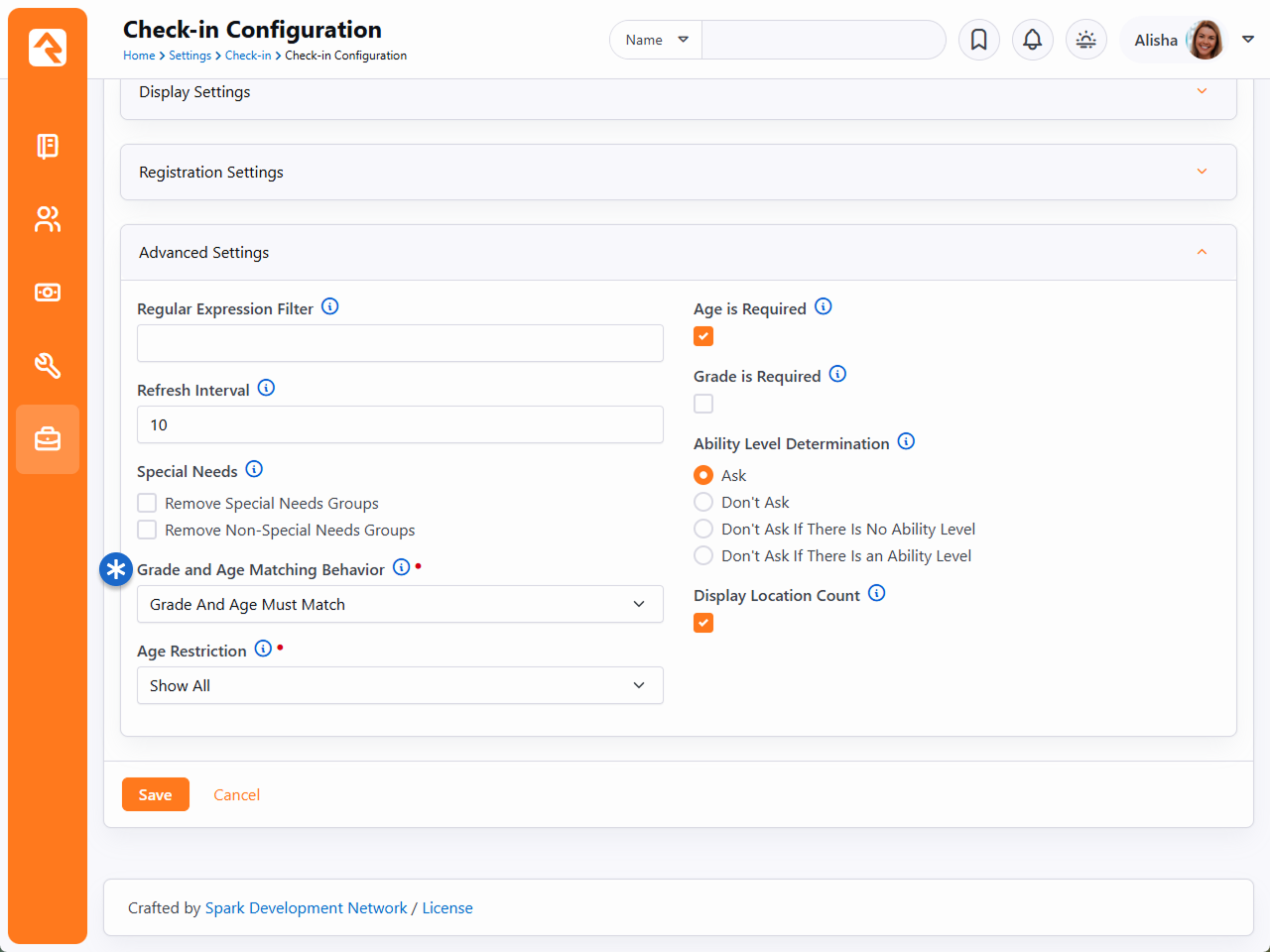 Every organization does check-in a bit differently and that applies to determining which groups a person is eligible to check into. To accommodate this, we've added a feature that provides fine-tuned control over group filtering. Let's walk through the options to clarify. Grade And Age Must Match: This is the typical, out-of-the-box behavior Rock uses for filtering. If a group has a Grade Range, Age Range, and Birthdate Range, the logic is: the grade must match, and either the age or birthdate must match.Age Match Not Required: With this option, if a grade match is possible (i.e., a grade range is specified and the person has a grade), then no age check is performed. For example, if Noah is 11 and in 6th grade, and group "A" specifies Grades 4–6 and Ages 12–14, then he will match the group. Conversely, if group "B" specifies Grades 2–3 and Ages 12–14, then he will not match the group because the grade check determined "no match" (as Noah is not in Grades 2–3).Prioritize Grade Over Age: The matching logic starts with the Age Match Not Required option; however, an additional step is performed -- any groups that did not match by grade are excluded. For instance, let's say you have a preschool room (age-based) and a kindergarten room (grade-based). Kindergartners who are also 4 or 5 years old would normally get a choice between the two rooms, even though they really shouldn't be in the preschool room. The Prioritize Grade Over Age option would check them into the kindergarten room.