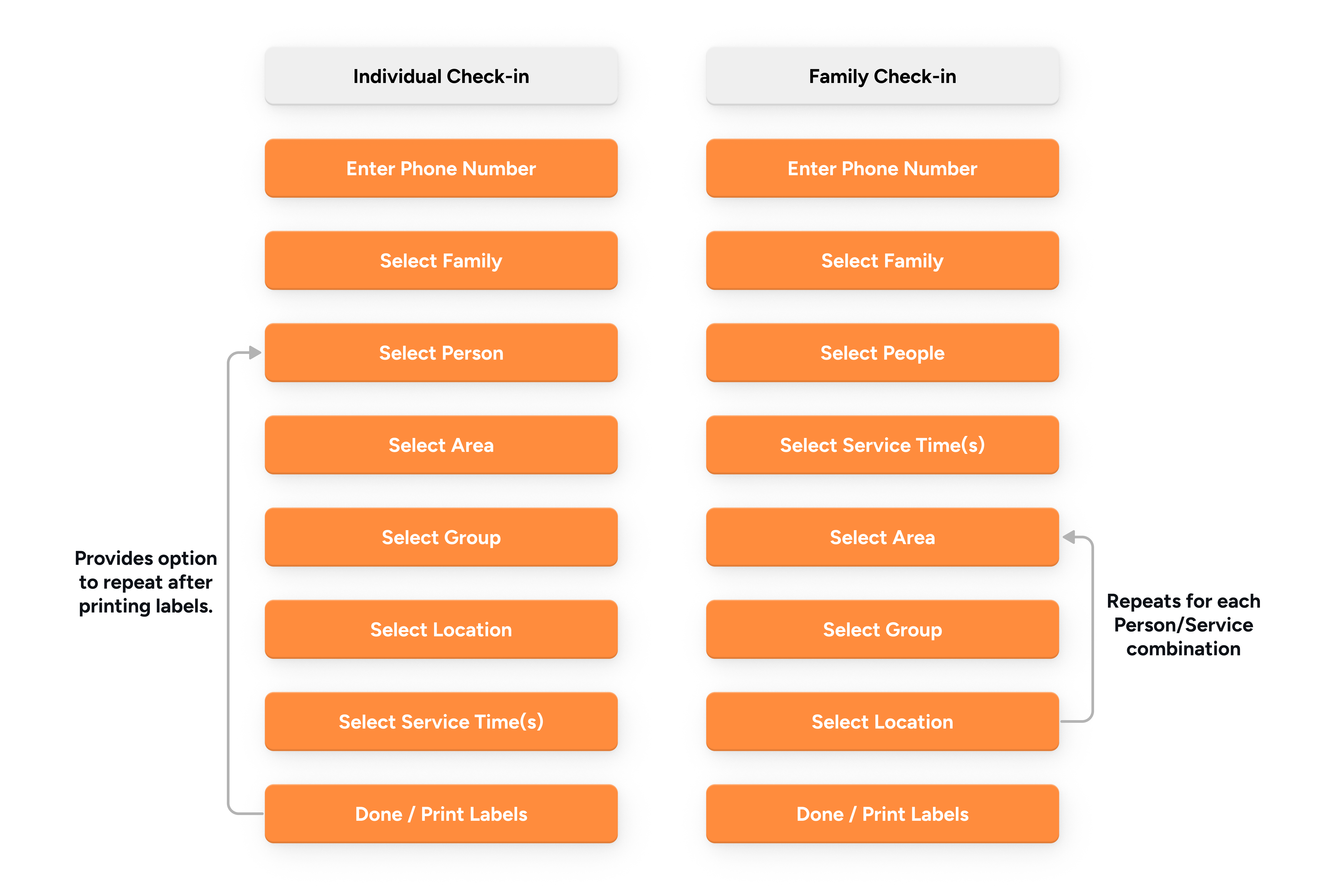 Before we get into the more technical aspects of configuration, let’s step back and take a general look at how individual and family check-in works in Rock. The specific screens the guest will be guided through are based on whether they’re checking in an individual or a family, as well as the check-in system settings set up by the administrator. But as you can see, the process is similar for both. Now let’s take a more specific look at the family check-in process. Here, Ted and Cindy Decker are checking in their children, Noah and Alex. Welcome - The Welcome screen is the waiting screen your guests will see when they walk up to the kiosk to check in. If no check-in locations are currently active, the guest will see a countdown for the opening time.Search - The Search By Phone screen allows guests to enter their phone number to begin the check-in process. By default, only four digits are needed to perform the search, but like most check-in features, this is configurable. Since entering the last four digits reduces check-in time, you may want to share this tip with your guests.Results from search - The Families screen lists the families that match the phone number entered.List of Check-in people - Rock displays a list of family members and others with a 'Can Check-in' relationship to the family (more on that when we get to the Administration screen). From here the guest can select all of the family members who are checking in.Select Times - The Select Time screen allows the guest to pick the times they are checking into, either a single time or more than one. If only one time is available, this screen will be skipped.Area Selection - The Area Selection screen lists the check-in areas that are available for the current time and individual. This screen will only display if the child’s age spans groups in multiple areas.Group Selection - The Group Selection screen lists the check-in groups that are valid for the current time and individual. If only one group is valid, this screen will be skipped.Room Location - The Location Selection screen will list all open locations for the group selected on the previous screen. If only one location is available, this screen will be skipped. There is also an optional Ability Level screen that is displayed if any areas or groups selected have an ability level requirement (e.g., crawling, walking, potty-trained, etc.). This screen is used to filter the available areas and/or groups. You can learn more about it in the Ability Levels chapter below. NotePrevious Check-InsBy default, when accessing the Family Selection screen, family members who have previously checked in within the last 10 days will already be selected. If 10 days is too short (or too long) a timespan, you can change this value in the Check-in Configuration area. See the Configure Check-in section below for more information. The process described above is practically the same for an individual, but the process is only done once rather than cycled through multiple family members. As you can see, many of the screens will be skipped over if there is only one selection. This means if a family only has one teen, for example, they will only have to enter the phone number and select their family. The rest of the screens will be skipped, and their label(s) will print. This makes check-in very quick and simple.