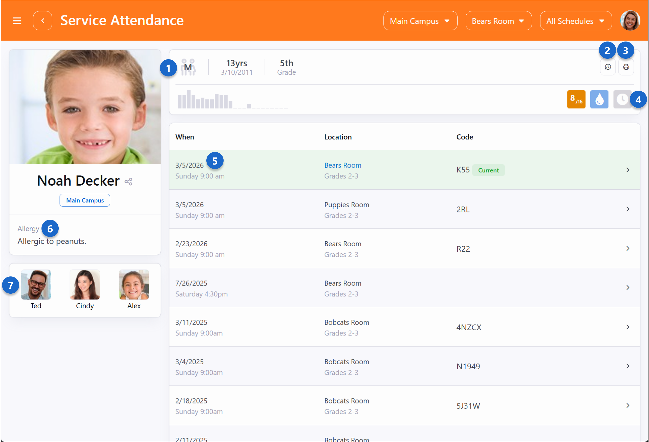 There are lots of ways you can get to the Check-in Manager Person Profile page. Whether you arrived here from a Search, from the Room Manager or from Live Metrics, there’s a lot to see and do on this page. Person Information - You can see the person's photo and campus to the left, as well as their gender, age and grade along the top of the page.Attendance History - Clicking this icon will take you to a page listing the changes that have been made to the person's check-in attendance data. For instance, you could use this page to track that the person switched rooms or had their attendance deleted.Reprint Labels - You won’t see this button if label reprinting is disabled. Otherwise, you can click here to reprint labels for the person. When you do, you’ll be asked to select which label(s) to print, and which printer should be used. See the Reprinting article for full details. Note that there is a "Reprint Labels" security option on the "Person Recent Attendances" block that allows for finer control over which roles can see the re-print label button.Badge Bar - By accessing the block settings for this page, you can select badges to display on either the left or right side of the bar. In this example we're showing attendance, baptism, and more that you can't see because they don't apply to Noah. This bar can tell you a lot about a person, quickly and easily.Check-in History - The center of the page shows the person's check-in history, including the Current check-in and past check-ins from other services. In this example, you can click on the Bears Room link in the Current row to access the Room Roster. Clicking the row itself reveals attendance details and allows for updates or deletion. When you edit the attendance record, you can update the person's check-in and check-out dates and times if enabled in the Attendance Detail's block settings.Person Attributes - If enabled in the block's settings, you can choose to display person attribute data for a given category. Separate categories can be selected for children and adults. You'll probably want to select the same person attribute category that is used on the Roster page (e.g., Check-in Manager Roster Attributes).Family Members - Each family member for the person being viewed is displayed here. Click on any family member to view the Check-in Manager profile for that person. You'll find there are more features for parents, as noted here. In this example there isn’t any contact information for the children, but phone numbers and emails for the parents will be displayed on their profile. In the person profile's block settings, there's an option to Share Person. If this feature is enabled, you'll see the share icon (ti ti-share) next to the person's name. Clicking the icon will generate a link that can be shared to edit that person's profile. This is great for situations where a room attendant needs to send the individual to a roaming staff person in order to quickly edit the person's record in Rock.