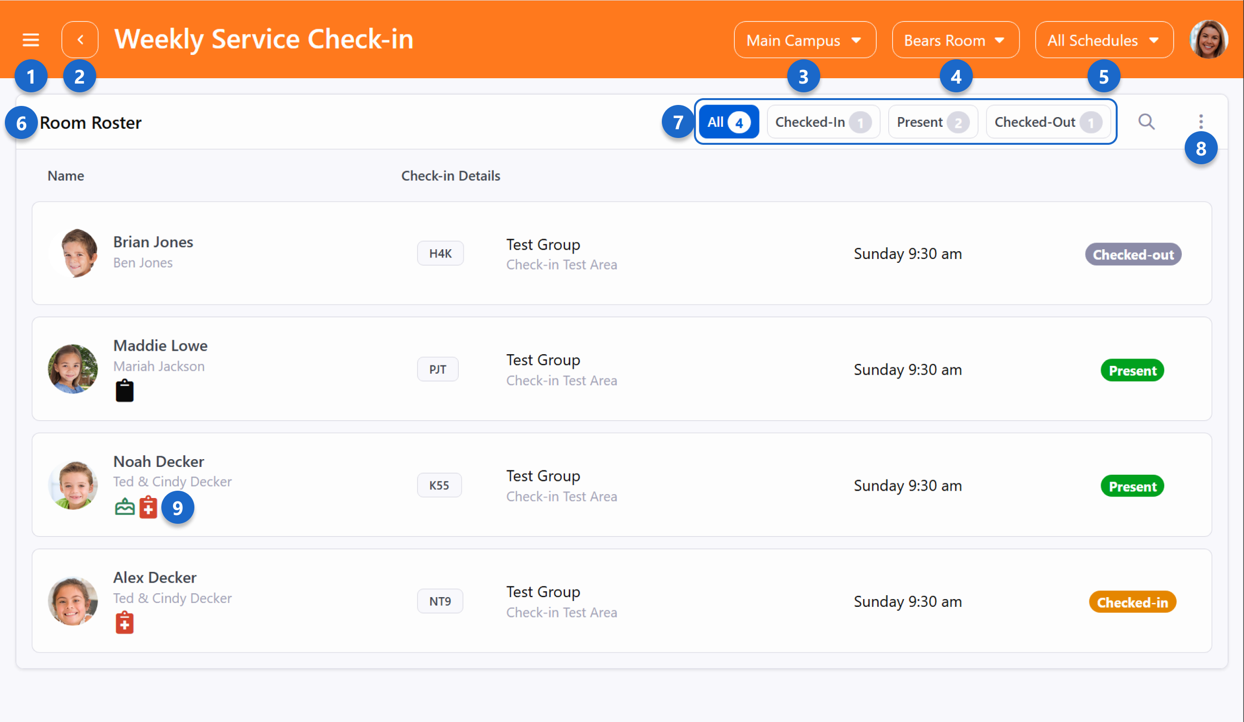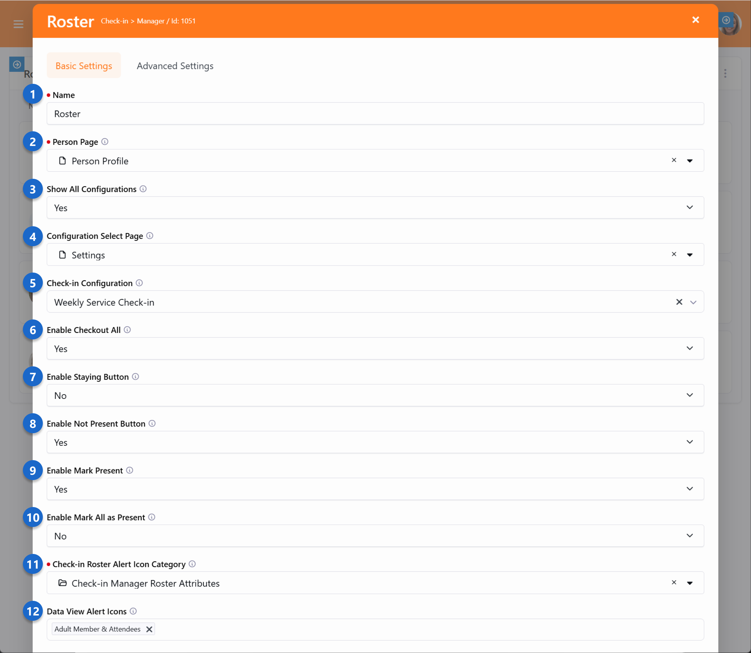 The check-in manager can be loaded from the address http://[your-rock-server]/checkinmanager. When you access this screen for the first time, you’ll be prompted to select a campus if you have more than one to choose from. Next, you’ll select a Location near the top-left to see the Room Roster for that Location. Let’s look at what we can do from there. NoteMobile FriendlyCheck-in Manager was designed with kiosk devices of all sizes in mind. That means the pages might look a little different from the below screenshots if you’re working with a smaller screen. For instance, the Check-in Details will collapse on smaller screens. Navigation Panel - Click the three horizontal lines (the icon) to open the navigation panel. From here you can access other areas of the Check-in Manager. We’ll cover those areas in more detail in the Navigate The Check-In Manager article.Back / Campus Selection - At the top of each page is a 'back' button you can use to navigate back to prior pages. Next to the back button is a drop-down to switch between your campuses, to show rosters for rooms at different campuses as applicable.Campus Selection - You can select or change the Location here. This will update the Roster being viewed.Room Selection - You can select the Room being viewed. This will update the Roster view.Schedule Selection - You can select or change the Schedule here. This will update the Roster to show only check-ins for the selected Schedule. The grid will look a little different when a specific schedule is selected, hiding the schedule column. All Schedules - When you’re viewing All Schedules, the Roster combines attendance records for each person, creating an easy-to-read list. In this view, you can sort the list by Name, and the quick search tool will focus on finding people by their name. Single Schedule - If you select a single schedule, you get even more detail. In this mode, the quick search looks through Names, Tags, Groups and Area names to help you find exactly who you’re looking for. Room Roster - The roster gives you a lot of information about each person, including check-in label codes and their check-in state. You can click on any row in the roster to view additional details about the person (see here). Room Roster Filter - You’ll notice that these buttons are always visible. Since the manager can show data from many different check-in configurations at once, it keeps these options ready just in case they're needed. This keeps the screen steady and predictable as new people arrive.All: Shows all the people who have checked in to the selected room. This is the view that is pictured in the screenshot above.Checked-In: This will show only people who have checked in, and who have not been Checked-out or marked as Present. This is also where staff will come to mark someone as Present when, for instance, the person physically arrives at the room.Present: This view will display only individuals who have been marked as Present. If Enable Presence is disabled for the Check-in Type, then everyone who checks in is automatically considered Present. From here, staff can Check-out individuals who have left the room or are otherwise not considered present if Enable Check-out in Manager is enabled in the Check-in Type configuration.Checked Out: Shows all the people who have been checked out from the selected room. Room Settings - Click here to access the Room Settings. From the settings, you can Close or Open the selected room. Person Information Icons - These give you a visual clue that the person has things like legal notes, allergies or an upcoming birthday. In this example both Alex Decker and Noah Decker have an allergy you might want to know about, Maddie Lowe has a legal note, and Noah has a birthday. You can change which attributes are displayed by adjusting the Check-in Roster Alert Icon Category block setting, or by adding attributes to the default Check-in Manager Roster Attributes category. For consistency, any attributes you use on the roster should have an Icon CSS Class and an Attribute Color. A single person can be checked into the same room for different services. In those cases, you'll see each service listed, and separate states (e.g., 'Present' or 'Checked In') if the person isn't in the same state for both rooms. NoteClosing a RoomWhen you close a room using the Check-in Manager it can take several seconds for the room to show closed on the kiosks, depending on the Refresh Interval setting of the current check-in configuration. If your kiosks aren't reacting fast enough to room closures, it could be that you have the Refresh Interval set too high. Before we move on from the roster, you'll want to take a look at its block settings. These settings can be used to enable a variety of features to align the roster's functions with your check-in processes. Name - The name of the block can be changed if needed. The name is only visible to admins.Person Page - The Check-in Manager has its own Person Profile page (see next section below) that people will be directed to when they click a person's row on the roster. You can use this setting to direct people to a different page instead. Typically, this won't be changed.Show All Configurations - This setting references check-in configurations (e.g., Weekly Service Check-in) and not check-in areas (e.g., Elementary Area). If set to Yes, then the roster will show check-ins from any configuration. If set to No, then the roster will only show check-ins according to the Check-in Area block setting described below.Configuration Select Page - Like the above setting, this references check-in configurations. If Show All Areas is disabled, and if a check-in area has not been configured or selected, this is the page that the person will be brought to. Typically, this setting will not change.Check-in Configuration - If Show All Areas is disabled, this is where you can set which check-in configuration the roster should use. Only check-ins fro