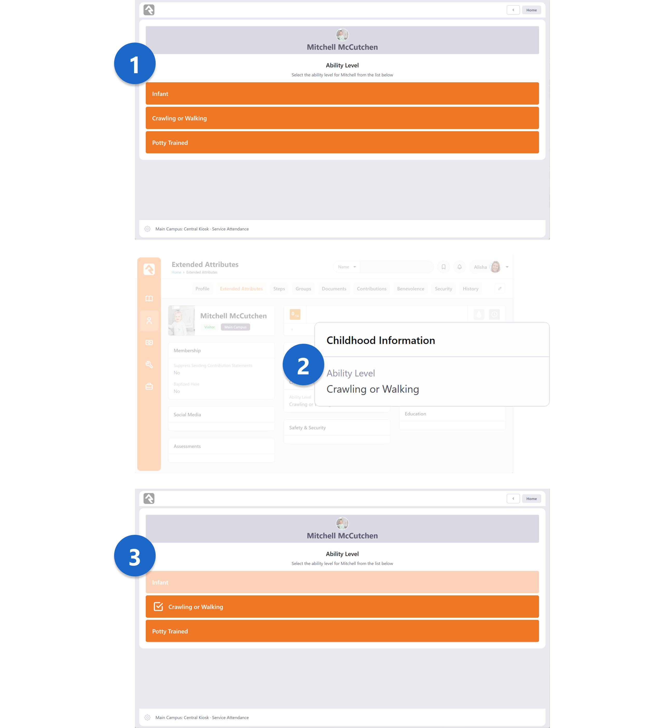 You may have seen that you can filter groups by age ranges and grades. There's one more criterion you can use: ability levels. It's common for infants and preschoolers to stay in certain rooms until they achieve a special milestone activity such as crawling or potty-training. Rock can help you track and select these levels within the check-in process. Let’s see how it works. Initial Level Set - The first time a child who matches the age range of ability levels checks in they will be asked which ability-level they meet.Ability Level Set - When the parent selects the ability level for their child it will be stored in the Ability Level person attribute on their Person Profile. Feel free to update their level here if needed in the future.Subsequent Check-Ins - Future check-ins will display their current ability and fade out previous levels. Parents can update the setting at any time. They can even select from the previous levels if needed. How Ability Levels Are Stored Ability levels are simply a person attribute that can be used as a filter to select a check-in group. If you go to the Extended Attributes tab of a Person Profile page, you’ll see the Ability Level attribute in the Childhood Information section. This is the attribute that will be considered when filtering groups. Rock comes with three ability levels configured: Infant, Crawling or Walking and Potty-Trained. You saw in the walkthrough above that an individual, or more likely their parents, could update this ability level during each check-in. You can also change the ability level behind the scenes on the Person Profile page. Configuring Ability Levels Not all check-in groups care about ability levels. Once you leave the preschool area, they aren't that useful. (Imagine the responses you'd get if you asked high school students if they were potty-trained!) To enable ability levels, first you need to set your check-in area (the default configuration is Nursery) to inherit from Check-in by Ability Level under Admin Tools > Check-in > Check-in Configuration > Areas and Groups. This will tell all the groups in this area that they can define an ability level. A key to ability levels is that you need to configure groups with overlapping age ranges. A child will only be able to check into the groups whose age criterion she meets, even though the parent will be presented with a list of all ability levels. Inherit From - Set the group's Inherit From property to Ability Level to enable the check-in for ability levels. Once an area has been configured to inherit from Check-in by Ability Level, you'll see that the groups assigned to that area now have an Ability Level setting. Ability Level - Select the group's ability level. This will be the filter that is used to present options to the individual during check-in. When Ability Levels Are Shown Due to the potential awkwardness of the ability level selection with older children you might be wondering when the selection screen is shown. This screen is only shown when the following criteria are met: The kiosk is configured to check-in for an area that inherits from Check-in Ability Levels.The individual being checked in matches the age ranges of the groups with ability levels. Adding Ability Levels Adding additional ability levels is a simple process. But you should refrain from adding too many levels because it can confuse your guests. To edit or add levels simply edit the Ability Level Defined Type Admin Tools > Check-in > Ability Levels. NoteThe order of the levels is very important. The order that they are shown in the Defined Type is the order they will be displayed on the check-in screens.
