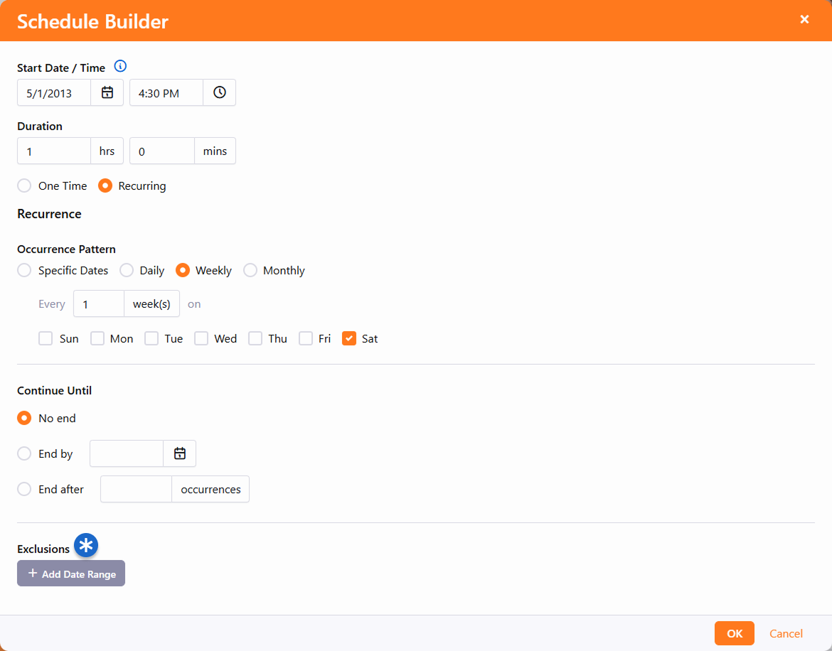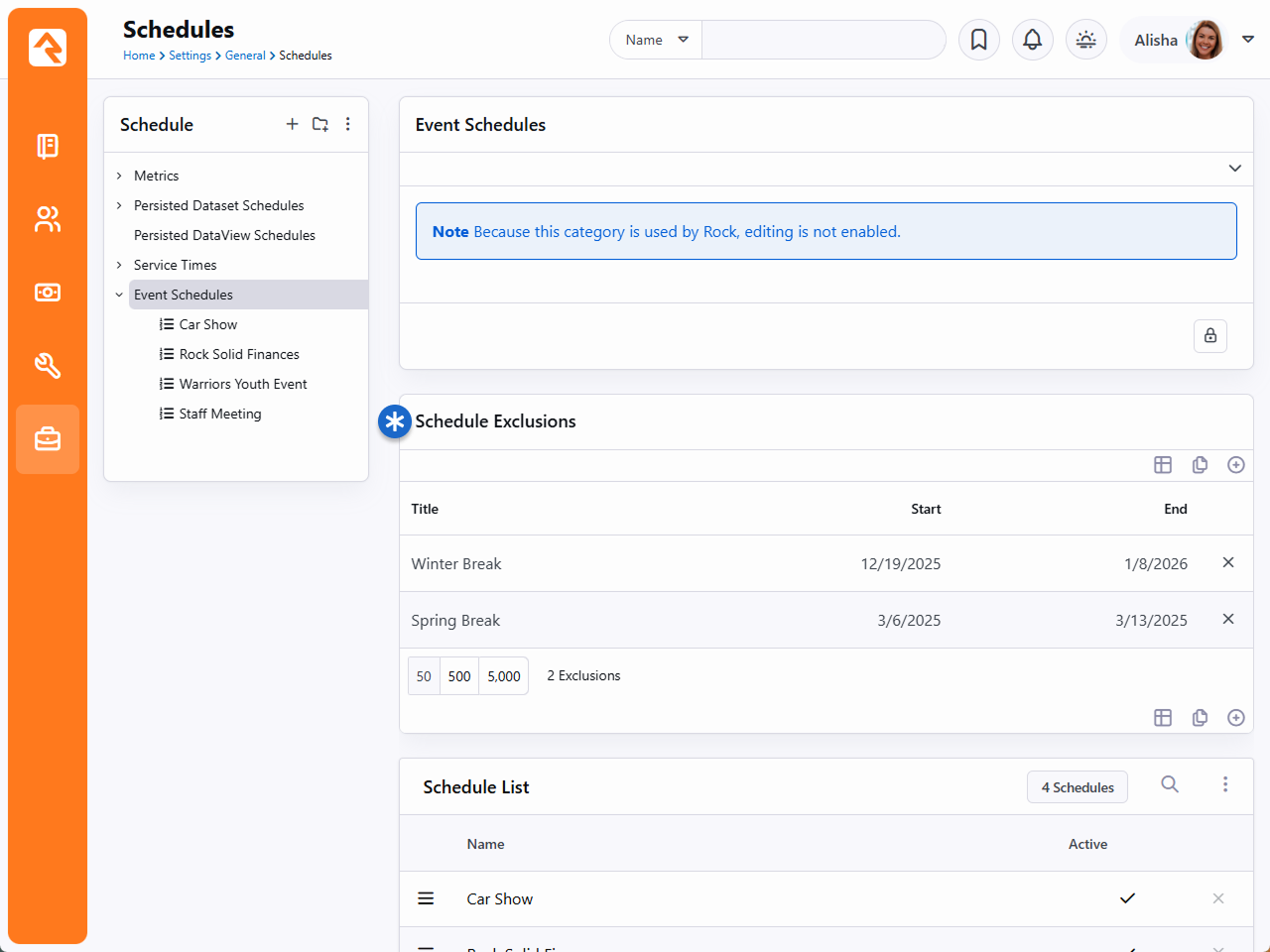 Of course, there will be times when your regularly-scheduled programming is interrupted by special events or holidays. For example, let's say there are no Saturday services on Easter weekend. You can tell Rock to ignore your regular schedule for that date. This is called an exclusion, and there are two ways to set it up. Let's check them out. The first way to set up an exclusion is at the schedule parent category level in the main Schedules page, found at Admin Tools > Check-In > Schedules. This is an easy way to inactivate all schedules in a category for specific date ranges. In the tree navigation, select the parent category for which you want to create an exclusion, such as "Event Schedule" as shown in the screenshot below. Click the ti ti-plus to name the exclusion and set the date parameters. The second way to set up an exclusion is at the schedule event (or child) level. From the Schedules page, drill down in the tree navigation to the specific event you want to create an exclusion for. Click the Edit button to display the schedule details for the event, then click Edit Schedule. In the Exclusions section of the Schedule Builder page, click Add Date Range to specify the exclusion parameters as pictured below.