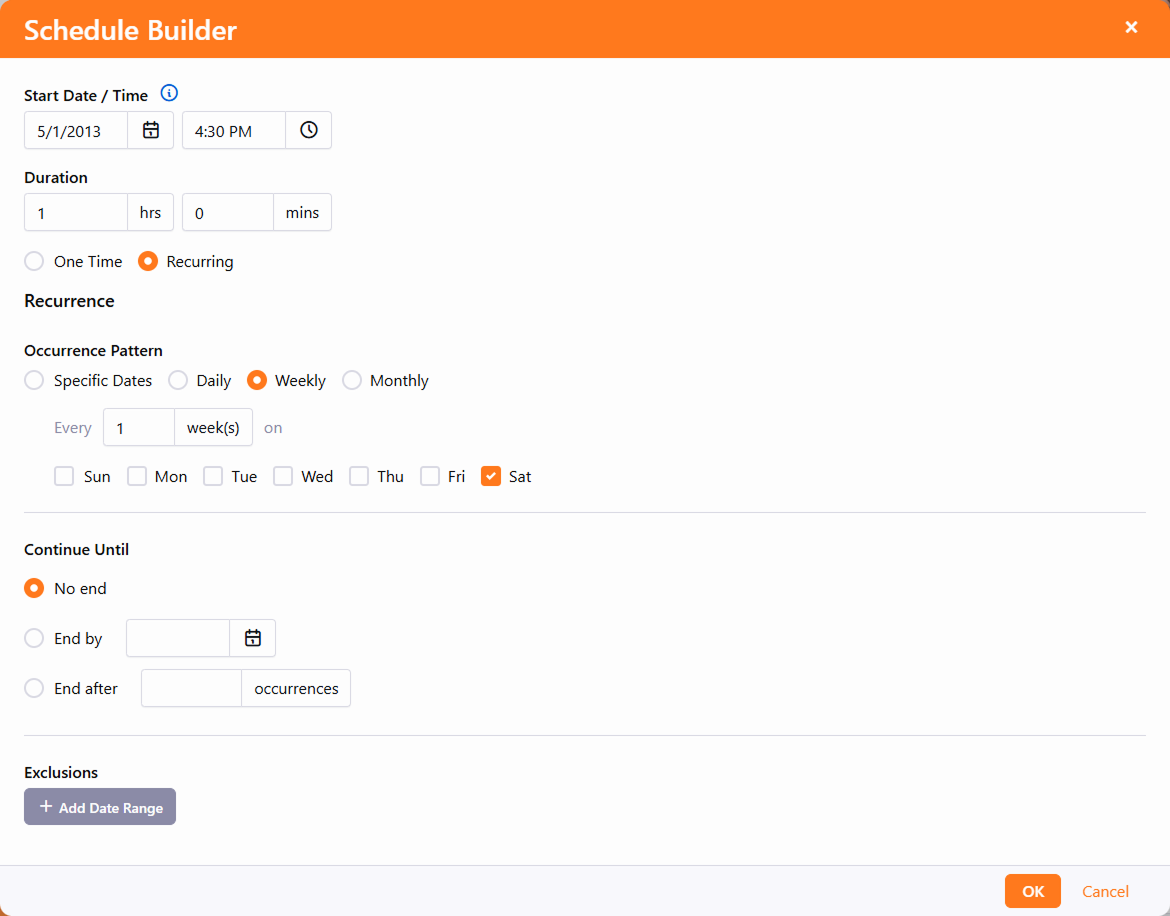 7. Inactivate Schedule When Complete - You'll probably leave this unchecked for your service times, but you might use it for event schedules. Checking this box will automatically set the schedule to Inactive if the schedule has no more occurrences.