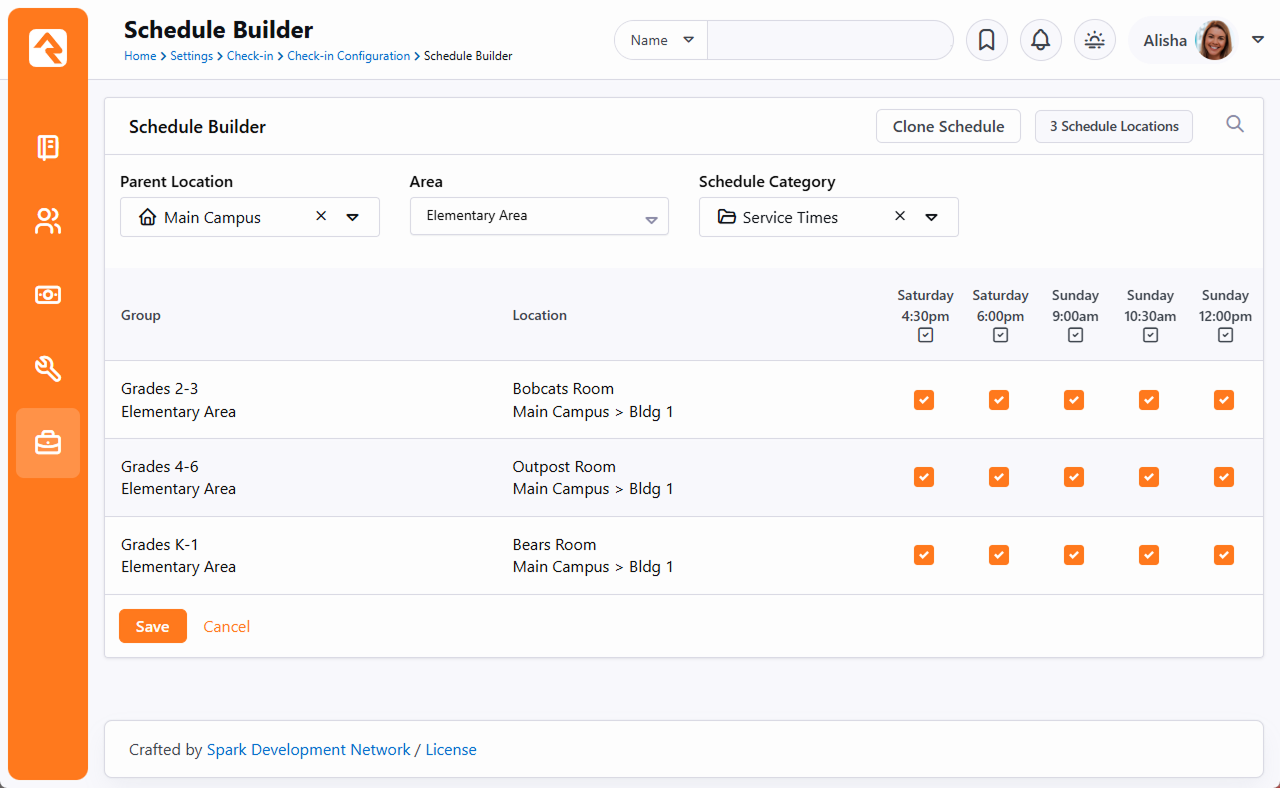 Now that we have many of the details covered, we can schedule the locations and their availability. This allows you to configure check-in to only allow certain rooms to be used at specific times. We'll do this from the Schedule Builder. First head to Admin Tools > Settings > Check-in Configuration.Select the Schedule button in the lower right corner of the check-in configuration screen.Now you'll see a large grid. Each combination of location/group will have a row, while each possible schedule time will have a column. To make configuration easier, you may wish to filter the locations by a specific campus or building, check-in area, or schedule.Check the check box for each schedule time when you wish to allow check-in for the specific location/group.Don’t forget to click the Save button at the bottom of the screen.