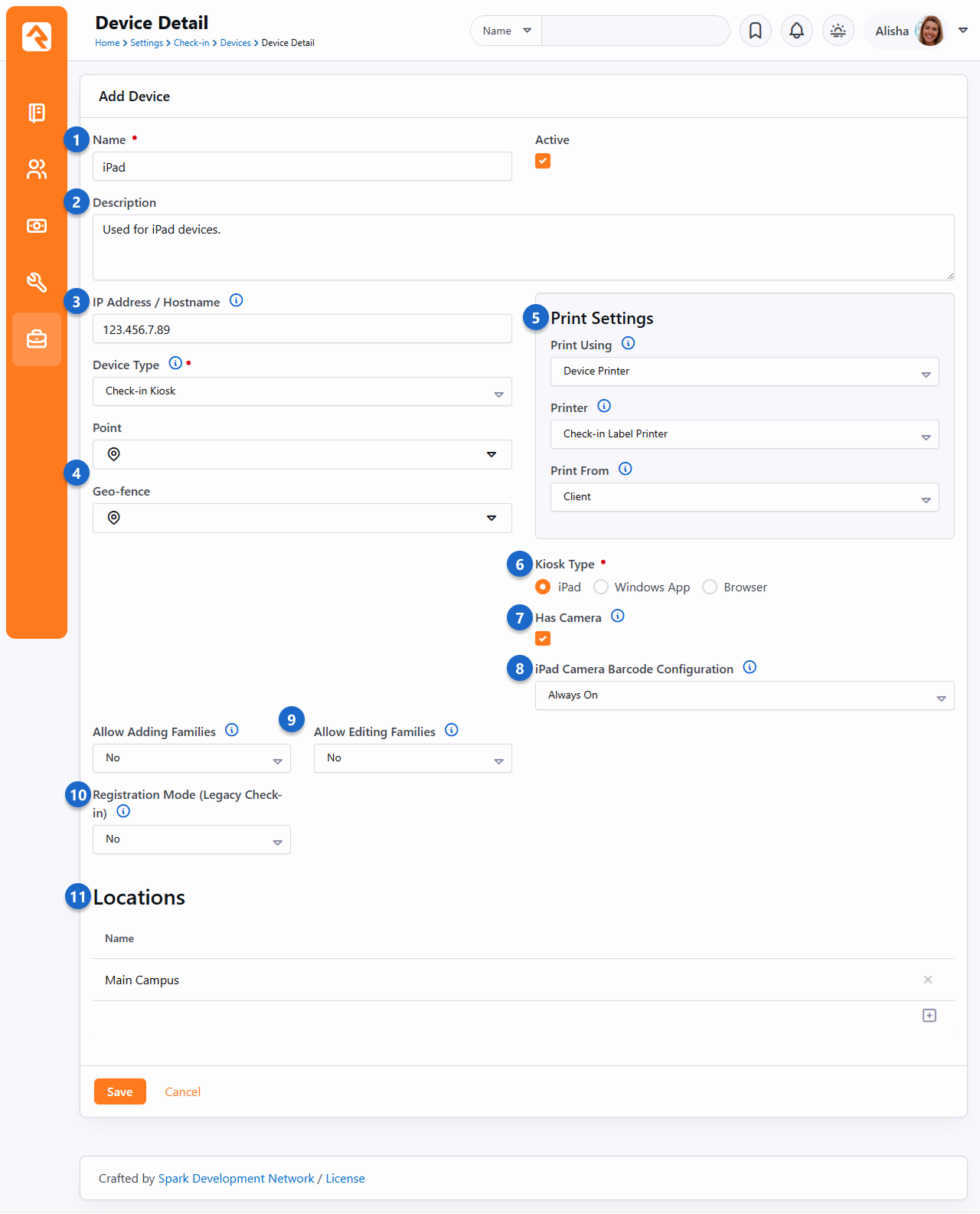 You can manage your check-in kiosks under Admin Tools > Check-in > Devices. Keep in mind that Rock supports multiple types of devices. Check-in kiosks are just one type. (Printers are also configured here.) When the check-in system starts up, it lists the kiosk devices so the attendant can select which kiosk configuration to use. It's also helpful to know that when you define a check-in kiosk configuration, it can be used on multiple physical machines at the same time. This means that when you define a check-in kiosk for use in your youth building, that definition can be used for each check-in computer or tablet in that area. Think of these configuration definitions as kiosk templates, not physical machines. Whether you are adding a new kiosk or editing an existing one, you'll use the screen below to manage the configuration. Name - The name is used at check-in startup to select the kiosk device to use for that session.Description - A brief description documents the details of the configuration.IP Address - Provide an IP address here if you want that address to be available for identification purposes. The Check-In Admin block checks for devices configured with the same IP address as the device being used for check-in. If it finds one, it automatically selects that device and all of the group types associated with it. Because this process is automatic, in this scenario the attendant would be taken directly to the Welcome screen, bypassing the Check-In Admin screen. On a related note, the Enable Kiosk Match By Name field in the Check-In Admin block settings searches for devices based on both IP address and hostname when looking for a matching kiosk.Point/Geo-fence - This allows you to define the latitude/longitude and geo-fence of the kiosk device. The geo-fence setting is used by [Classic] Mobile Check-in. The latitude/longitude settings will be used to support future applications.Print Settings - These three settings define how printing will work. Be sure to read more in the Printing section.Print Using: Tells the kiosk how to determine which printer to use.Device Printer: Uses the printer defined in the Printer setting belowLocation Printer: Uses the printer defined for the locationGroup Type: Uses the print logic defined by the group type Printer: If you selected Device Printer above, you will need to select a printer to print to.Print From: While the previous two settings helped define where to print to, this setting determines where to print from.Client: This is the best option, but it assumes that you will be using the iPad application or Windows application. If you are running check-in inside a web browser, you won’t be able to print from the client.Server: With this option, the printing will be done from the web server. This requires the web server to be on the same network as the printer. If you are hosting Rock on an external webhost, printing from the server requires Kiosk Type - Select the type of kiosk that will be used for check-in. This will depend on the type of device you're using. Each of the three Kiosk Types support QR code scanning to identify the person, provided the device has a camera. The QR code scanning feature requires using the Aero theme if you're checking in using the Windows App or a browser. Scanning of QR codes generated by [Classic] Mobile Check-in is still limited to iPads only.Has Camera - This option must be enabled to use a device's built-in camera for scanning barcodes or QR codes.Camera Barcode Configuration - Select the camera configuration setting that applies best to how the Device will be used. See the iPad Application section for a description of each Camera Barcode Configuration option. This setting only applies to iPads.Allow Adding/Editing Families - Add new families or update existing ones during check-in, including managing household members. To protect data quality, it’s usually used at volunteer kiosks, where trained helpers can make accurate updates. See the Check-in Registration chapter to learn more.Registration Mode (Legacy Check-in) - This setting allows you to turn the kiosk into a volunteer assisted, walk-up registration station where your volunteer can quickly add a person or guest to an existing family. See the chapter on Check-in Registration below for details. Note this mode is only used for legacy check-in.Locations - This setting allows you to define which locations the kiosk is serving. This will limit the location options that are displayed to the guest. For centralized check-in you will want to enable all locations. Since locations are hierarchical in nature (they have parent and child locations), you can select a parent location and all of its children will also be automatically selected. Next-Gen Kiosk Setup When setting up your kiosk you can save your choices, so you don’t have to provide the theme, configuration template, and area selections every time the kiosk starts. You can even have multiple saved configurations if the kiosk is used for different purposes. When the kiosk is turned on, simply tap the button for the desired configuration, and everything will immediately be ready to go. WarningThe ability to save kiosk configurations is only available with Next-Gen Check-in and requires Rock v16.7 or later. The saved configurations are simply Defined Values. If you need to delete one and start over, you can do so under the Saved Check-in Configurations Defined Type. For setup, you’ll use the following URLs: Setup Page: /nextgen-checkin/setupKiosk Page: /nextgen-checkin If you need to change your kiosk's settings often, point it to the setup page. Otherwise, you can set it to go directly to the kiosk page. The very first time you go to the kiosk page it will take you to the setup page. After that, it will remember your settings and go straight to the kiosk page.