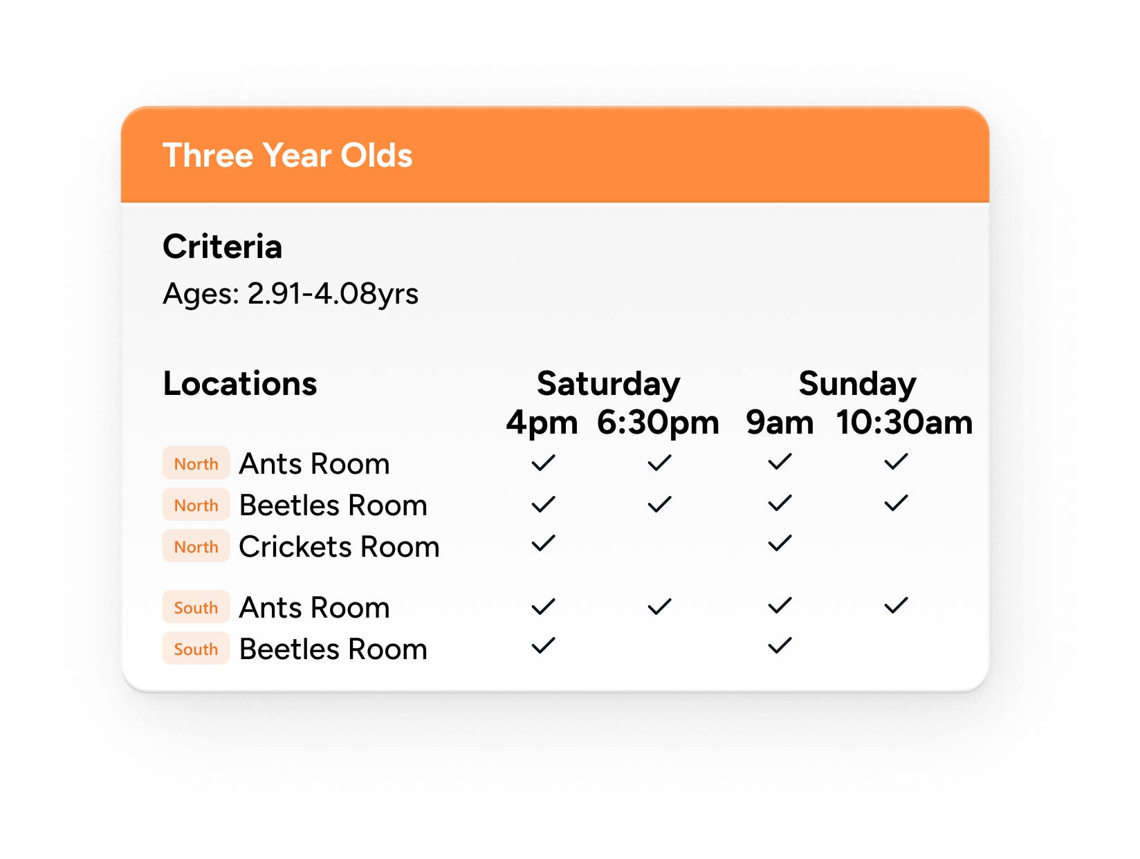 Locations decide where individuals can check in. Think of them like buildings or rooms for your check-in. Locations are tied to check-in groups and enabled through schedules. Let's take a look at an example to see how they work. The diagram above shows a configuration for a large church's Three Year Olds check-in group. As you can see, the church has two campuses it calls North and South and each of these campuses has multiple locations (aka, rooms) for their three-year-olds. Based on attendance patterns, all of these rooms are not needed during all services. In this configuration, the Crickets Room is not set up to be used during the second service of the day. Editing Locations Locations are edited under Admin Tools > Check-in > Named Locations. Locations are hierarchical in nature, so build them out to match the structure of your buildings. Scheduling Locations Group/Location pairs are matched to schedules at Admin Tools > Check-in > Check-in Configuration (click the Schedule button.) Opening / Closing Locations We've seen how you can enable or disable a location based on a schedule. Each location also has an open/closed state. Say for instance you want the Bears Room to be used for your 9:00 am service but need to be able to close it if it reaches capacity. Once it reaches capacity, you can close the room from the Check-in Manager or the Device Manager (more info on these below) and it will no longer be available as an option for check-in. Of course, you probably don’t want to keep the room closed forever. If you’ve closed the Bears Room for your 9:00 am service, you’ll want it open again for your 10:30 am service. You can manually open rooms the same way that they were manually closed, or you can configure the Auto Open Locations job to reopen them for you automatically at certain intervals. Location Thresholds In addition to simply closing rooms manually, you can also configure locations to have threshold limits for the number of people that can be checked into the location at once. These limits are evaluated during check-in and once they are reached, the location will automatically stop being available as an option for people to check into. Threshold: If this number is reached, check-in will not allow people to check into the location unless an attendant overrides the threshold.Threshold (Absolute): Once this number is reached, check-in will absolutely not allow people to check in to the location at all, ever… even if an attendant attempts to override the threshold.