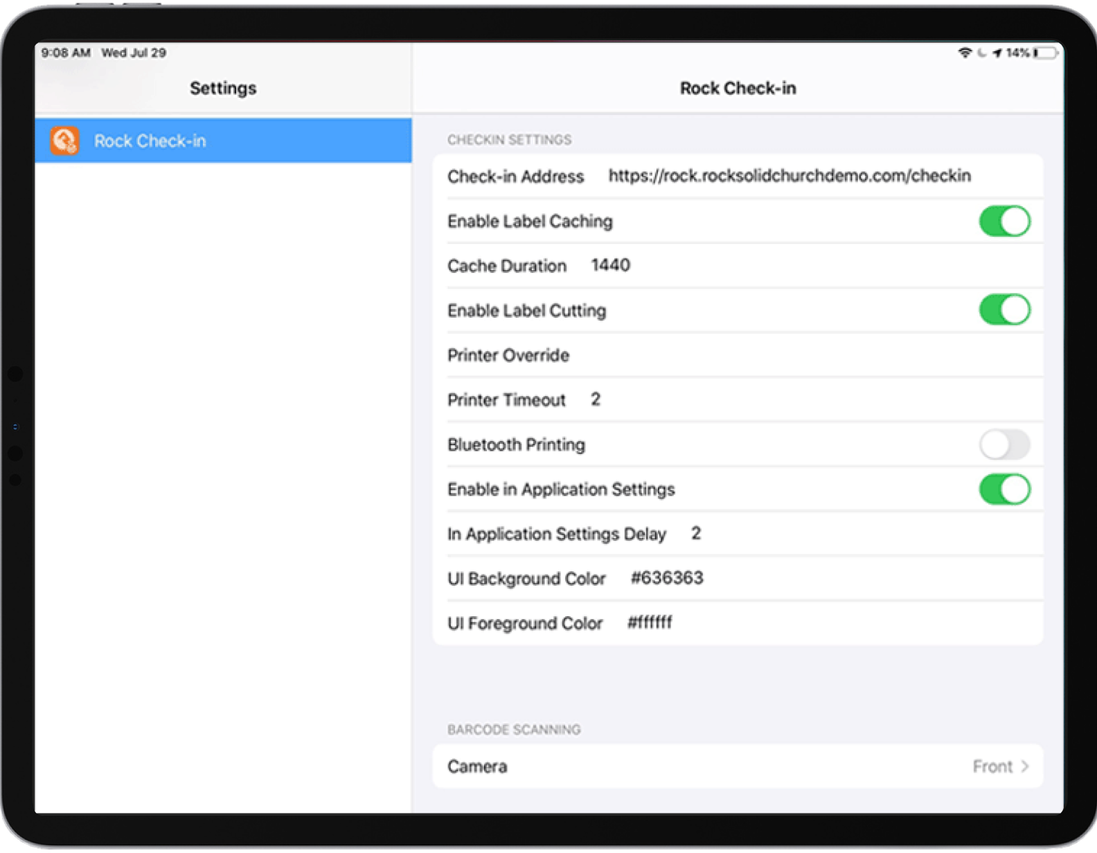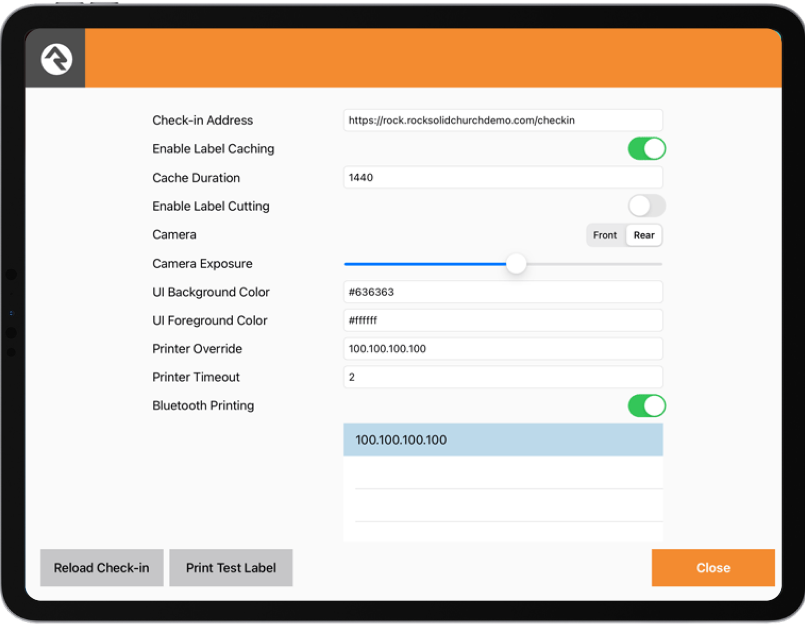 While the normal check-in screens run really well in mobile Safari, we have created a native iPad application to host the check-in experience. This application can be downloaded for free from the Apple App Store. The application displays the same Rock check-in screens as the browser but also adds the ability to print straight from the iPad to your network-connected printers. The application can also cache the labels, which increases check-in performance. NoteThe iPad app only runs on iOS 10 or newer, which means very old hardware like the iPad 2/3 and original iPad Mini will not work. Configuration After installing the application from the App Store and running it for the first time, you'll be prompted to enter the address of the check-in start page you want to use for the application. For most organizations this address will be https://[your-rock-server]/nextgen-checkin. NoteNavigating Complex ConfigurationsOrganizations with multiple check-in configurations might want to point to a simple navigation page that allows the individual to select the check-in configuration on load. Once you provide this address, all subsequent launches will load this address on startup. If you want to modify this address later, or access advanced configuration settings, you can select Settings on your iPad and scroll down to the Rock Check-in application settings. From there you can adjust the following settings. SettingDescription Check-in AddressThis is the initial page that will load when the application launches. Enable Label CachingThis setting will cache the loading of check-in labels, which keeps them from being downloaded on each check-in. Cache DurationThis determines how often the labels will be re-downloaded. The cache can also be expired by stopping the application and restarting. Enable Label CuttingIf your label printer has a cutter, enable this feature to automatically perform cuts at the end of each set of labels. See the Printing section above for more information. Printer OverrideThis setting has the effect of always printing from the iPad to the printer IP address you provide. Bluetooth PrintingDetermines if the Printer Override setting contains a Bluetooth printer name or an IP address for Wi-Fi printing. Enable in Application SettingsEnables or disables the 5-finger long press gesture to get to the in-app settings screen. You can also change how long a person needs to press before the settings screen appears. UI ColorsYou can easily customize the background and foreground colors of the interface by adjusting these settings. CameraSelect whether the iPad should use the front or the rear camera for scanning barcodes. You can also adjust the exposure if the image is too bright or too dark. See the iPad article below for details on enabling this feature. Bluetooth Printing The iPad Application supports Bluetooth Low Energy printing to supported Zebra printers. As of this writing, these are the ZQ300, ZQ500, ZD400, ZD600 and ZT600 series printers. Zebra also has some older “Bluetooth Classic” printers, but these are not supported. If you are thinking of buying Bluetooth printers, try just one first to make sure everything works before you buy them all. To configure the use of a Bluetooth printer you need to use the in-app settings screen. While you are in the Rock Check-in app, press five fingers on the screen for two seconds to access the settings screen pictured below. When you enable Bluetooth Printing, a list will appear that contains nearby Bluetooth devices. Select the name of the Bluetooth printer and it will auto-fill the Printer Override setting for you. You may have noticed the Print Test Label button pictured above near the bottom of the screen. This feature is enabled if you have a Bluetooth printer name or an IP address in the Printer Override field. Tapping this button will print a simple test label to verify the connection to your printer. NoteNote About iPad RestrictionsIt's not uncommon when using iPad kiosks to "lock down" the iPad as much as possible via the use of iPad Restrictions, to prevent individuals from changing the configuration or using it in a way that wasn't intended. We have discovered a minor issue in iOS 10 where restricting the use of Safari Browser prevents the Rock check-in app from working properly. (Check-in worked fine in iOS 9 and earlier.) So be aware that you won't be able to disable the use of Safari when running iOS 10 or newer if you want the Rock app to function. iPad Barcode Scanning You can use an iPad’s built-in camera to scan barcodes or QR codes for check-in. This speedy option is easy to set up and comes with a variety of customization options. To start, make sure that you have at least one Device set up with the camera feature enabled as shown below. See the Configuring Kiosks article for full details on setting up a Device. Remember, a single Device configuration can be used on multiple physical machines at the same time. Kiosk Type - In this case, be sure iPad is selected as the Kiosk Type.Has Camera - This option must be enabled to use a camera for scanning barcodes or QR codes with the selected Device.iPad Camera Barcode Configuration - Select the camera configuration setting that applies best to how it will be used:Off: If selected, the camera will be off and can’t be used for check-in.Available: This will add a button to the Welcome screen, allowing the person to choose between scanning a code or providing a phone number to proceed with check-in.Always On: Select this option to require scanning for every check-in. The camera feature will activate immediately when the Welcome screen is accessed.Passive: With this setting the camera is always on, but the camera view isn’t shown on the screen. In this case, the individual will have to know to place the barcode into the camera’s field of view. If a Camera Barcode Configuration option is not chosen in the Device settings, then the Welcome block’s settings will be used by def