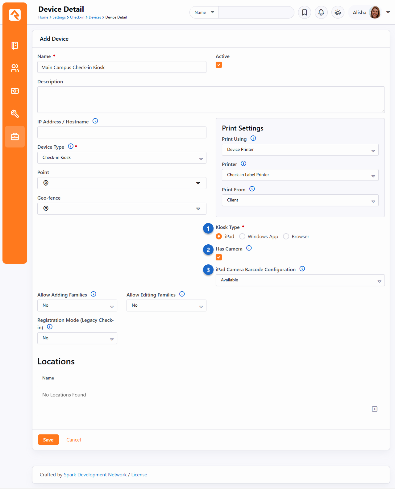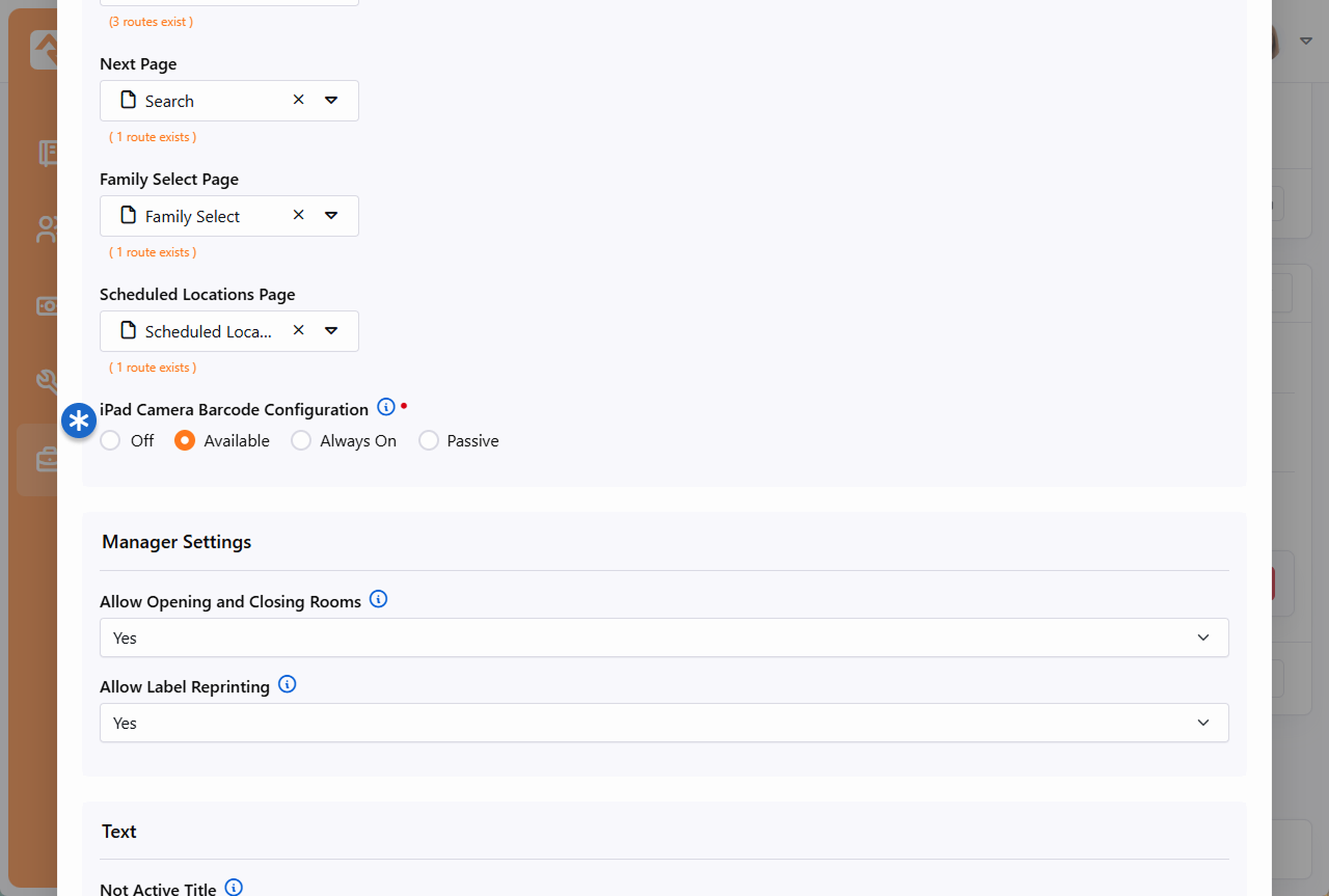 While the normal check-in screens run really well in mobile Safari, we have created a native iPad application to host the check-in experience. This application can be downloaded for free from the Apple App Store. The application displays the same Rock check-in screens as the browser but also adds the ability to print straight from the iPad to your network-connected printers. The application can also cache the labels, which increases check-in performance. NoteAs of Rock v9, the iPad app only runs on iOS 10 or newer, which means very old hardware like the iPad 2/3 and original iPad Mini will no longer work. Configuration After installing the application from the App Store and running it for the first time, you'll be prompted to enter the address of the check-in start page you want to use for the application. For most organizations this address will be https://[your-rock-server]/nextgen-checkin. NoteNavigating Complex ConfigurationsOrganizations with multiple check-in configurations might want to point to a simple navigation page that allows the individual to select the check-in configuration on load. Once you provide this address, all subsequent launches will load this address on startup. If you want to modify this address later, or access advanced configuration settings, you can select Settings on your iPad and scroll down to the Rock Check-in application settings. From there you can adjust the following settings. SettingDescription Check-in AddressThis is the initial page that will load when the application launches. Enable Label CachingThis setting will cache the loading of check-in labels, which keeps them from being downloaded on each check-in. Cache DurationThis determines how often the labels will be re-downloaded. The cache can also be expired by stopping the application and restarting. Enable Label CuttingIf your label printer has a cutter, enable this feature to automatically perform cuts at the end of each set of labels. See the Printing chapter above for more information. Printer OverrideThis setting has the effect of always printing from the iPad to the printer IP address you provide. Bluetooth PrintingDetermines if the Printer Override setting contains a Bluetooth printer name or an IP address for Wi-Fi printing. Enable in Application SettingsEnables or disables the 5-finger long press gesture to get to the in-app settings screen. You can also change how long a person needs to press before the settings screen appears. UI ColorsYou can easily customize the background and foreground colors of the interface by adjusting these settings. CameraSelect whether the iPad should use the front or the rear camera for scanning barcodes. You can also adjust the exposure if the image is too bright or too dark. See the iPad Barcode Scanning section below for details on enabling this feature. Bluetooth Printing The iPad Application supports Bluetooth Low Energy printing to supported Zebra printers. As of this writing, these are the ZQ300, ZQ500, ZD400, ZD600 and ZT600 series printers. Zebra also has some older “Bluetooth Classic” printers, but these are not supported. If you are thinking of buying Bluetooth printers, try just one first to make sure everything works before you buy them all. To configure the use of a Bluetooth printer you need to use the in-app settings screen. While you are in the Rock Check-in app, press five fingers on the screen for two seconds to access the settings screen pictured below. When you enable Bluetooth Printing, a list will appear that contains nearby Bluetooth devices. Select the name of the Bluetooth printer and it will auto-fill the Printer Override setting for you. You may have noticed the Print Test Label button pictured above near the bottom of the screen. This feature is enabled if you have a Bluetooth printer name or an IP address in the Printer Override field. Tapping this button will print a simple test label to verify the connection to your printer. NoteNote About iPad RestrictionsIt's not uncommon when using iPad kiosks to "lock down" the iPad as much as possible via the use of iPad Restrictions, to prevent individuals from changing the configuration or using it in a way that wasn't intended. We have discovered a minor issue in iOS 10 where restricting the use of Safari Browser prevents the Rock check-in app from working properly. (Check-in worked fine in iOS 9 and earlier.) So be aware that you won't be able to disable the use of Safari when running iOS 10 or newer if you want the Rock app to function. iPad Barcode Scanning You can use an iPad’s built-in camera to scan barcodes or QR codes for check-in. This speedy option is easy to set up and comes with a variety of customization options. To start, make sure that you have at least one Device set up with the camera feature enabled as shown below. See the Configuring Kiosks section for full details on setting up a Device. Remember, a single Device configuration can be used on multiple physical machines at the same time. Kiosk Type - In this case, be sure iPad is selected as the Kiosk Type.Has Camera - This option must be enabled to use a camera for scanning barcodes or QR codes with the selected Device.iPad Camera Barcode Configuration - Select the camera configuration setting that applies best to how it will be used:Off: If selected, the camera will be off and can’t be used for check-in.Available: This will add a button to the Welcome screen, allowing the person to choose between scanning a code or providing a phone number to proceed with check-in.Always On: Select this option to require scanning for every check-in. The camera feature will activate immediately when the Welcome screen is accessed.Passive: With this setting the camera is always on, but the camera view isn’t shown on the screen. In this case, the individual will have to know to place the barcode into the camera’s field of view. If a Camera Barcode Configuration option is not chosen in the Device settings, then the Welcome 