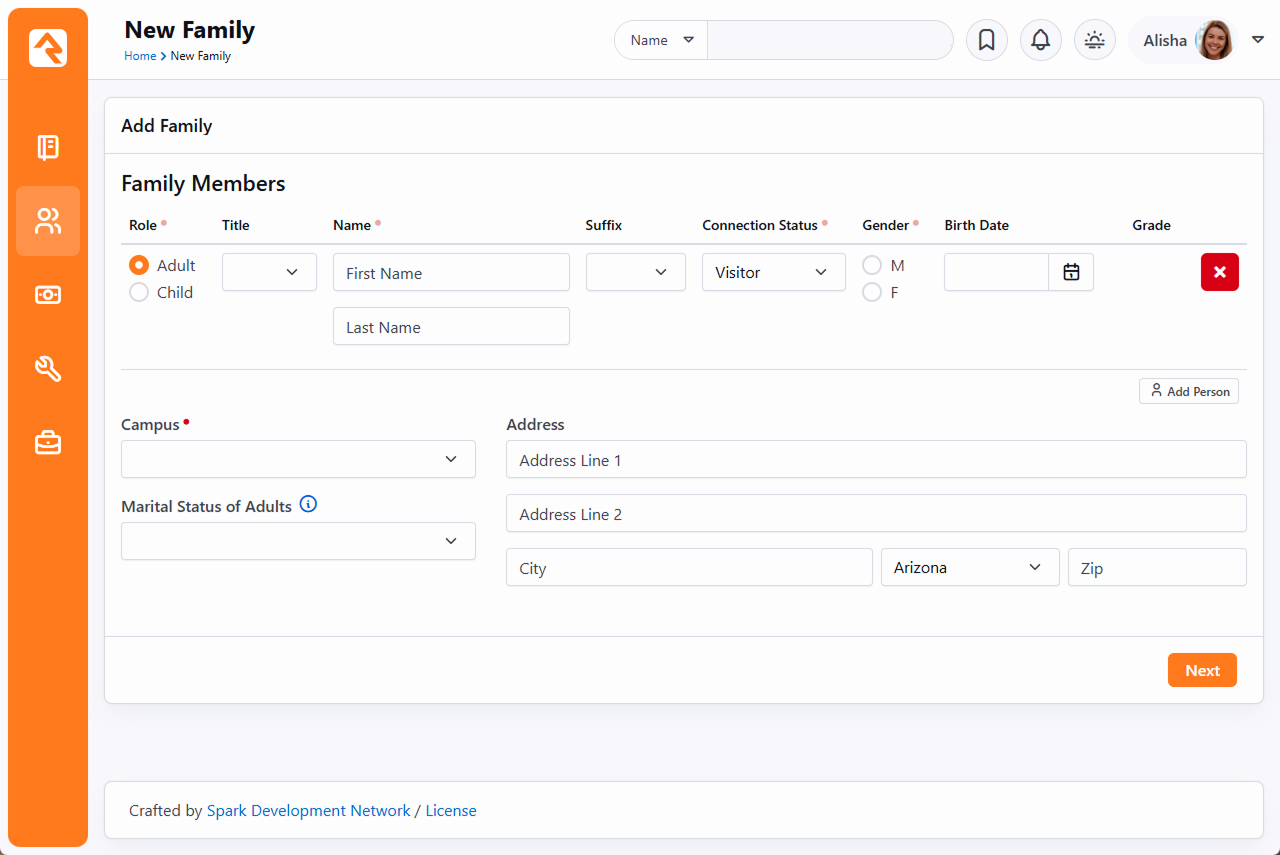 When new people show up for the first time, you'll need to enter them into the system before they can check in. The best way to enter these families is under People > New Family. If you are using a paper registration card and entering the data into the system, keep in mind you don't need to enter all of the data right away. You only need to enter these six key points to get started: Parents' namesChildren's namesChildren's birth datesChildren's grades (if in grade school)Phone numbersAllergies and legal notes You can enter other contact information like addresses and emails later. This really helps speed up the registration process for first time guests. WarningIt's critical that you enter a child's birthdate before the family attempts to check in. Without a birthdate none of the age filters will work. Also, if you've configured your check-in groups to filter on grade, it's highly recommended that you enter those right away. If you don't, it will fall back to using age, but the grade is usually a better (read: narrower) filter. TipSelf-Service Coming SoonThe New Family screen does not allow you to enter some fields, like allergy/legal notes. This must be done on the Person Profile screen. We hope to add specific registration screens soon to streamline the entry process and even allow a self-service capability. Stay tuned. Configure Family Pre-Registration The Family Pre-Registration block can be used by families to pre-register before attending a service for the first time. Registering ahead of time makes the check-in process faster and easier. By default, the Family Pre-Registration block is included in the external site on the Connect page. You can customize the Family Pre-Registration page by changing the block settings on the external site. There are a lot of settings here, so we're going to break it up into pieces. Show Campus - Select 'Yes' to display the Campus selection field.Default Campus - If the Campus selection field is displayed, you can designate a default campus to be displayed. Alternatively, the campus can be passed to this block (by Id or GUID) using a query string parameter in the URL.Require Campus - This setting simply determines whether a campus must be selected.Campus Type/Status - You can limit which campuses are available for selection with these filters. For instance, you may only want to show 'Physical' campuses that are 'Open'.Campus Schedule Attribute - Here you can provide a campus attribute of type Schedules that can be used to set the Planned Visit Date and Planned Visit Time. See the help text for additional information.Planned Visit Date - This field determines how the Planned Visit Date field will be displayed. Select 'Hide', 'Optional' or 'Required'. The Planned Visit Date value is not saved anywhere. It is only used if launching a workflow, or it can be used in the Lava to redirect the guest after they are done completing the screen. (Note: If both the Campus and Planned Visit Date fields are hidden, the entire Visit Information section will not be displayed.)Scheduled Days Ahead - If you're using a schedule configured for the campus, this setting limits how many days ahead the person can select their Planned Visit Date. If you're not using a campus schedule, then a date picker will be shown, and this setting does not apply.Family Attributes - Enter any family attributes you want displayed. The attributes will appear to the right of the Address field on the Family Registration screen. Any attributes that are configured as ‘required’ will require the guest to provide a value.Allow Updates - Select 'Yes' if you want the block to automatically assume the guest who is logged in is updating information for their own family. If 'Yes' is selected, when a guest is logged in, the current names of each family member will not be editable. If 'No' is selected, the block will automatically assume a new family is being entered, regardless of whether a guest is logged in or not.Auto Match - Select 'Yes' if you want the block to attempt to find a matching person in Rock when a new adult is being added, rather than creating a new person. Rock will identify a match if one (and only one) person with the same first/last name and email address matches the adult being added. This process is skipped and a new record will be created if the existing record's Account Protection Profile is configured to skip duplicate checking based on your Security Settings.Connection Status - Designate the connection status to use when creating a new person.Record Status - Designate the record status to use when creating a new person.Record Source - Discover where a new individual's info was entered into the system. In this case, select 'Family Registration' to categorize a new record's origin. Workflow Types - Select any optional workflows you want to launch after the guest has entered the information. For any workflows launched, the block will set the entity for the workflow to the family that is being created. It will also try to set any of the following workflow attribute values if they exist on the workflow type:ParentIds: A comma-delimited list of the person IDs for each adultChildIds: A comma-delimited list of the person IDs for each childPlannedVisitDate: The value entered in the Planned Visit Date fieldYou can also define a workflow to launch for each parent or each child using the Parent Workflow and Child Workflow fields. Redirect URL - Enter the URL you want to redirect the guest to after they are finished entering the family information. This field supports Lava, and the block will pass the following fields (in addition to common fields):Family: The family that is being created, including adults and childrenRelatedChildren: A collection of any children that are not included in the primary familyParentIds: A comma-delimited list of the person IDs for each adultChildIds: A comma-delimited list of the person IDs for each childPlannedVisitDate: The value entered in the Planned V