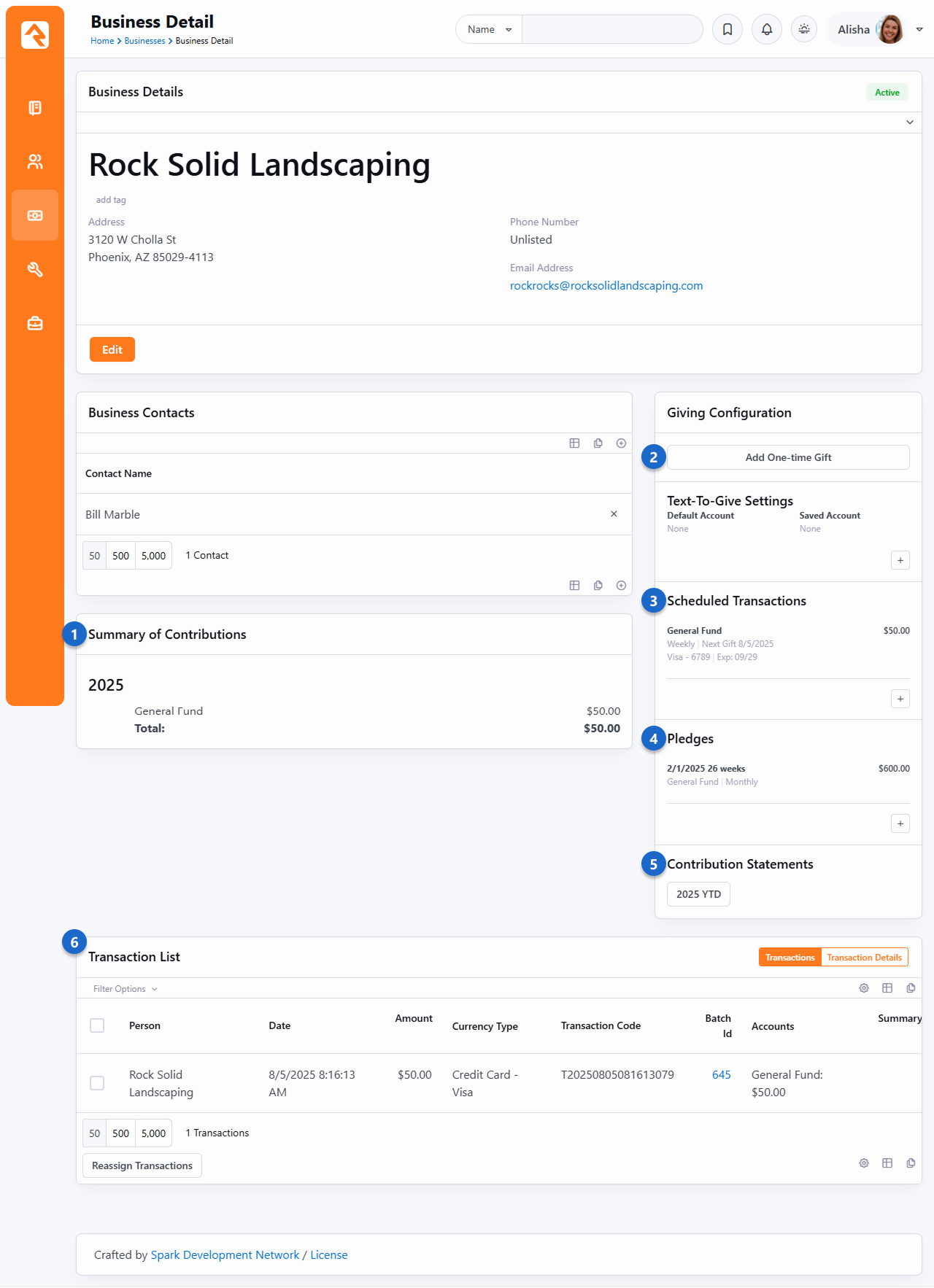 Just as you can view the giving information for a specific person, you can also view the giving information for a business. To do this, simply go to Finance > Businesses and select the business name from the Business List. Rock will display all of the information and contribution history for that business, including yearly contribution statements. Financial transactions can also be entered from the Business Detail screen. Options include either a one-time gift or a new scheduled transaction.