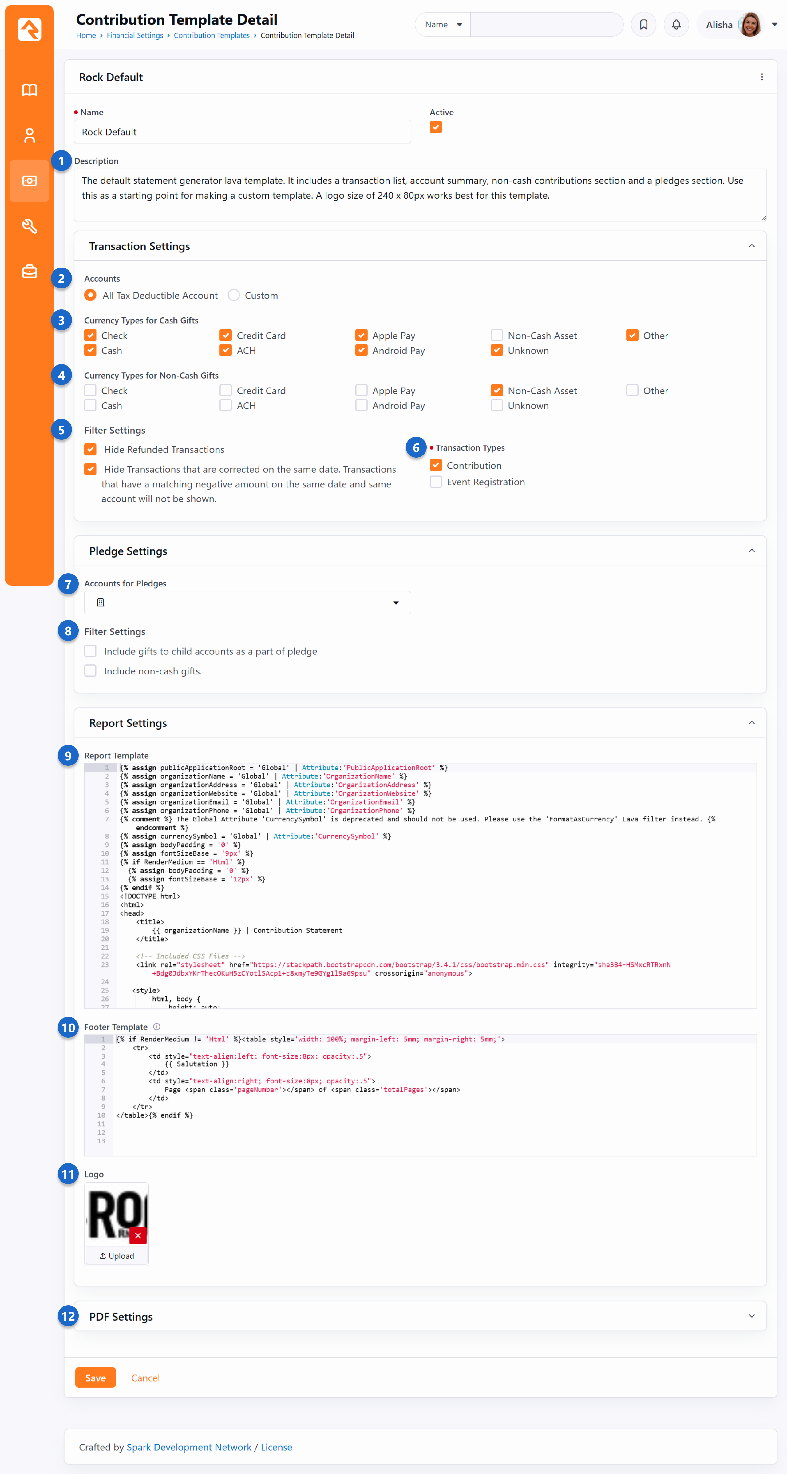 Rock ships with a default template that’s used by the Statement Generator to create statements. This template is also used by the web versions of the statements, like those accessed from the Person Profile page. The settings on the template drive what goes into the statement and how it looks. You can create a template of your own under Finance > Financial Settings > Contribution Templates to customize the statement to your needs. For instance, you’ll probably want to change the logo at a minimum. Name and Description - Each template you create should have a clear name and a description that indicates how it will be used. When you’re using the Statement Generator, only the Name of the template will be visible.Accounts - You can restrict which accounts get pulled into the statements by either selecting Currency Types for Cash Gifts - Here you’ll select which types of currency count as cash gifts. The default configuration is typically all you’ll need, but if you’ve added other currency types that should count as cash gifts you can select them here.Currency Types for Non-Cash Gifts - Select the types of currency that represent non-cash gifts, like vehicles or property. By default, these are grouped together under the Transaction Filter Settings - These settings let you filter out refunded transactions or transactions that were backed out on the same day they were applied. In most cases you’ll want to exclude these types of transactions from statements that get sent out to people, but you may want to see them for internal purposes.Transaction Types - By default, only contributions will be shown, but you can also include payments for events.Accounts for Pledges - Pledges are not shown on the contribution statement by default. If you want to show pledge information on the statement, select the accounts for pledges here.Pledge Filter Settings - These filter settings only apply to pledges. You can set whether or not gifts to child accounts of the selected accounts should count toward the pledge, and whether or not non-cash gifts should be included.Report Template - If you’re creating your own template, then you’ll most likely want to start by copying the default template that ships with Rock before making any changes. This is an advanced setting that lets you control exactly how the statement looks and what kind of information it displays.Footer Template - This is another advanced setting that lets you control the footer information of the contribution statement. By default, it includes the Logo - You’ll want to replace the default logo with your own. The logo size should be 240 x 80 pixels.PDF Settings - These settings let you control the margins and page size of the PDF documents that will be generated. You typically won’t need to change these. NoteCustomize Displayed Content With LavaWant your template content to change depending on whether it's viewed as a PDF or in a browser? Use the RenderMedium Lava merge field to control what appears based on the output format—like showing a salutation only in print or hiding links in a PDF. For example: