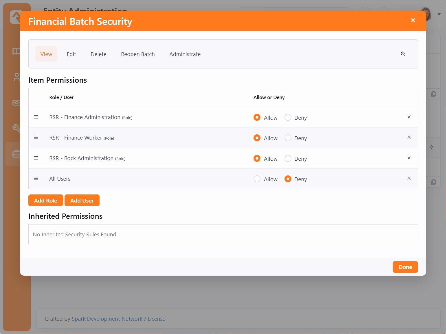 Transactions that occur in a similar date range are grouped together into batches. These batches help organize the transactions. They also play a key role in integrating to your General Ledger accounting system. Instead of re-entering every transaction into your General Ledger, you can enter the batch totals knowing that Rock will keep the historical details for you to reference later if you need them. In our example below a batch has been created for the weekly gifts for the Rock Solid Church. Batches can be viewed under Finance > Batches. Below is a figure showing the batch list screen with the various filters that are available. To manage your batches: Tap ti ti-search to search through your batches. Select ti ti-adjustments-horizontal to filter your batches.Press ti ti-square-plus to add a batch. Click ti ti-dots-vertical to perform actions to batches such as Open Selected Batches, Launch Workflow or Merge Template. Clicking on a batch from the list pictured above will bring you to the Financial Batch Detail screen pictured below. From here you can see all the details of a batch. Date Range - The date range of the batch.Transaction Amounts - The transaction total, control amount and the variance between the two.Transaction Items - The count of transactions, control count and the variance between the two.Accounting Code - This is used to store an optional reference number to the organization's primary accounting system.Notes - Batch notes, if any have been added, will be displayed here.Batch Attribute - Any additional batch attributes you create will be displayed here if they are set to show in the grid. For more information, see the Financial Batch Attributes note below.Edit - Access the Edit screen to open or close the batch or to adjust other settings as shown in the example pictured below.Account Totals - This list shows account totals for the accounts that the transactions are tied to.Currency Totals - This list shows account totals for each currency type.Match Transactions - Batches that have been created by the transaction scanner need to have each transaction linked to an individual. This button takes you to the screen that assists with this process.Audit Log - This button will take you to an audit screen that shows each change made to a batch or transaction in a batch.Transaction List - A list of the transactions contained in the batch. Clicking on one of these transactions will take you to the details screen for the transaction.Transactions / Transaction Details - If a single transaction goes to separate Accounts, selecting "Transaction Details" will provide separate rows in the grid for each Account.Options - Use the Options drop-down to set whether images (e.g., scanned checks) should be shown in the grid.Add Transaction - Assuming the batch is not closed, you can add new transactions to the batch by clicking the ti ti-circle-plus icon. NoteFinancial Batch AttributesSay you want to assign batches specific project codes, accounting codes, or another specific value. You can easily do this by creating an entity attribute with a Financial Batch entity type. Attributes are created in the Entity Attributes screen, located at Admin Tools > Settings > Entity Attributes. When you choose the Show in Grid option, the attribute values will be displayed in the Batch Detail screen. To learn more about Entity Attributes, see the System Settings article of the Core Concepts guide. There may be times when a closed batch needs to be reopened in order to make changes. Because reopening a batch can cause hiccups between your system and your financial clearing house, you only want people with a certain level of security to be able to perform this action. This security role is added and modified at the Entity level. To give a person the ability to reopen closed batches, follow these steps: Go to Admin Tools > Settings > Entity Administration.In the Entity List, locate "Rock.Model.FinancialBatch".Click ti ti-lock to open the Financial Batch Security window.Click the Reopen Batch button.Add roles and users to the Item Permissions, selecting whether to allow or deny each the ability to perform the action.Click Done. Once the security permission is set, you can reopen a batch simply by selecting the batch you want to reopen, clicking the Edit button to open the Edit Financial Batch screen, and choosing "Open" from the Status dropdown menu. Click Save when you’re done. Batch statuses serve a critical function in providing accountability for your accounting processes. Each status in the lifecycle of a batch has been developed to ensure accurate record keeping. Below, we will guide you through each status in the lifecycle of a batch, explaining how it should be used. Pending: When created using the check scanning app, batches start with a 'Pending' status, indicating that the scanning process is still ongoing.Open: When a batch is in the 'Open' status, it means that the scanning process is complete, but additional matching or audits are still being performed. It also indicates that the batch has not yet been entered into the general ledger.Closed: When a batch is in a 'Closed' state, it indicates that its amounts have been entered into the general ledger. To maintain the integrity of your accounting processes, Rock Security prevents closed batches from being re-opened without elevated permissions. Automated Batches There are times where you may be using a third-party system to create a batch and Rock is not in control of the process. For example, you may be using an outside giving service that downloads transactions into a batch. In this instance, while the batch is being created Rock will restrict the ability to edit or delete until the third-party software is done with its work. Third party systems can create automated batches using the Automated feature. These batches have an additional "Automated" label. While the transactions of an automated batch are downloading, the batch will have a "Pending