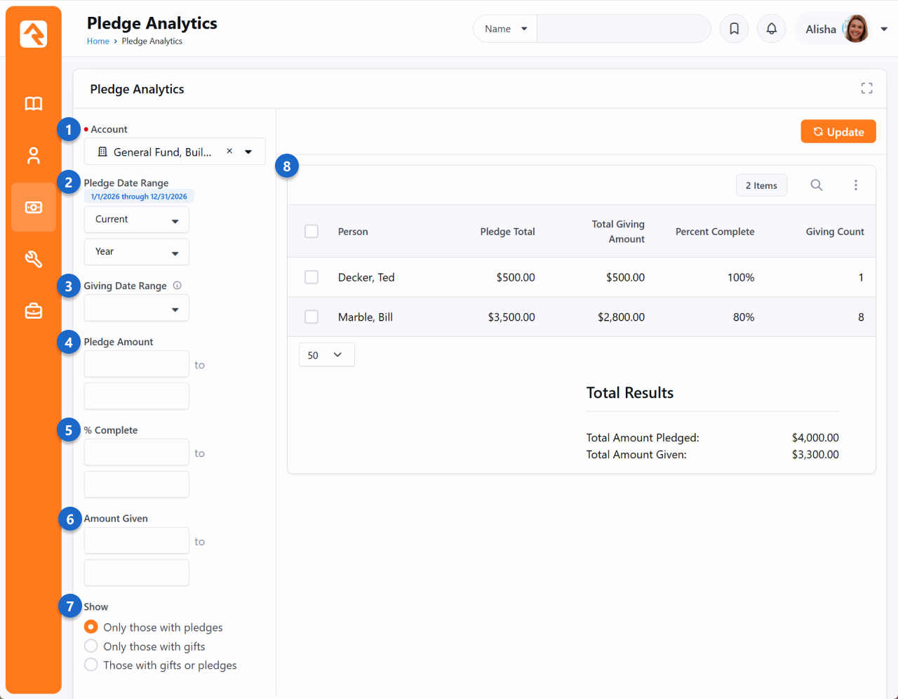 While most of Rock's financial tools are designed to be multi-purpose, the concept of pledges is closely tied to the nonprofit world of donations. Pledges allow your members and guests to commit to an amount that they will be giving over a stated period of time. Pledges predict the level of donations you can expect in a given timeframe. Some organizations use them to plan for their yearly budgets. Others use them to track what has been committed to a specific building or capital campaign. Either way, Rock can help you easily track these commitments. Manage Pledges Pledges are frequently given via paper commitment cards. When this occurs, someone within the organization will need to hand-enter the pledges into the system. This can be done under Finance > Pledges. From this screen you'll see a list of all pledges currently in the system. You can use the grid filters to help limit which pledges are shown. To see the 'Total Results' of pledges, edit the block settings and toggle Show Account Summary to 'Yes' TipReady for the SpotlightThe Pledge List block has several block settings to show/hide columns and filter settings. This makes it a powerful block for your external website. From this pledge list page, you can update or add new pledges. The figure below shows this screen with the various options available. Person - This is the person who is making the pledge. For families you'll want to pick the head of house. As with many of Rock's financial tools, pledges can be viewed from a family perspective when linked to any adult in the family.Account - The account that the pledge is for. Often times this will be a unique account for a capital campaign or building fund.Total Amount - This is the dollar amount that will be given over the duration of the pledge.Date Range - This defines the duration of the pledge.Payment Schedule - This determines how often gifts (financial transactions) will be given to meet the pledge amount.Pledge History - The Pledge History tracks any changes made to a person's pledge, including adjustments to the pledge amount, donation frequency, and time frame, along with details on who made each change and when. This provides transparency and accountability, ensuring that any updates are clearly documented. It also helps administrators manage donor relationships and resolve discrepancies efficiently. Pledges Self-Entry When possible, it's a great idea for members to enter their own pledges online. This not only allows you to reduce the amount of data entry, it also allows them to create a recurring giving profile to match their pledge. The sample external website that comes with Rock already has a pledge entry screen configured for you to use. You can find this page under Give > Pledge. This pledge block on the external site has several block settings to make it very flexible for you to use. Enable Smart Names - This feature will attempt to find a matching person record in Rock to link the pledge to. This match will occur if a record exists with an exact match on first name, last name and email address. There’s also some logic built in to handle cases when someone types in Ted and Cindy or Ted & Cindy in the first name field. When this happens only the value Ted will be used in the search. If an exact match does not occur a new person record will be created with the record status of pending, for future review by an Admin.Account - If you provide a specific account as a block setting, the guest won’t have to pick one, and their pledge will automatically be assigned to this account.New Connection Status - In the case where a new person record must be created this will be the connection status that will be assigned to the record.Record Source - Discover where a new individual's info was entered into the system. In this case it will be labeled as 'Pledge'.Pledge Date Range - This setting allows you to assign a date range for the pledge. If you provide both a start and end date, these values will be pre-populated behind the scenes, so the guest will not have to worry about entering them. In the Obsidian version of this block, if you provide an end date only, then when the person fills out the form that end date will be pre-populated for them and the start date will automatically be set to today's date.Show Pledge Frequency - Determines if thePledge Frequencyfield should be displayed. You may not want your guest to have to provide this information.Require Pledge Frequency - There may be times when you would like to show the pledge frequency but not require someone to enter one. In other cases, you might want to require this item. With this setting you can have it any way you'd like.Save Button Text - This setting allows you to customize the text of theSavebutton.Note Message - The block allows you to provide a note to your guests to help explain the pledge in more detail.Receipt Text - This is the message that will be displayed to your guest upon saving. This is a great place to celebrate their commitment. It comes out of the box configured to link them to set up a recurring donation to match the frequency they selected. If one was not selected, it will allow them to pick one. This field supports Lava, so you can personalize it.Confirmation Email Template - You can also select to send a template confirmation email after the save. This email template can use the same liquid merge objects from the Receipt Text field.Select Group Type - When you choose a group type here, the person will see a list of groups to which they belong that are of this type. The pledge will be associated with the group the person selects.Pledge Term - This will change the word "Pledge" in "Total Pledge Amount" to whatever term you provide. For instance, you might use "Donation" as your Pledge Term, which means the person would see "Total Donation Amount" on the self-service pledge screen.Phone Types - If you're using the Obsidian version of this block, you can select which phone types to make availabl