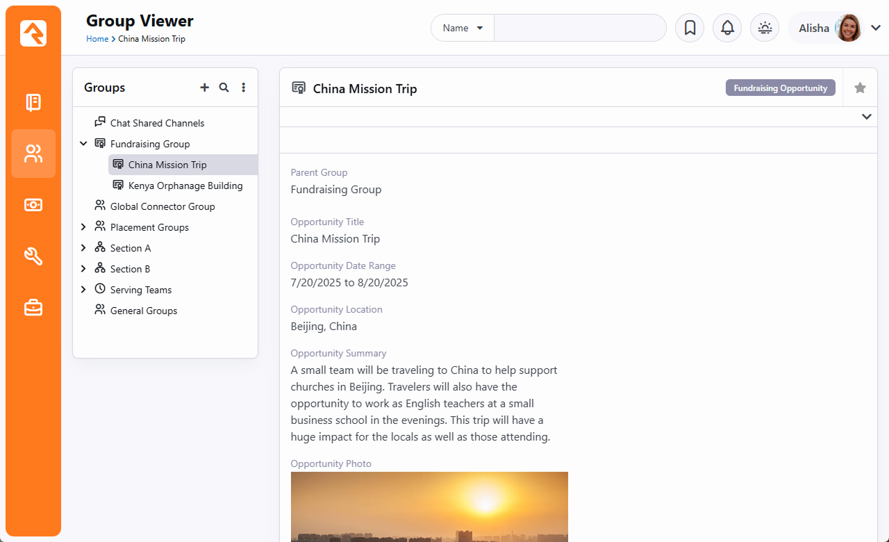 Keep in mind that each fundraising opportunity is a group. You'll manage the opportunities from the Group Viewer.