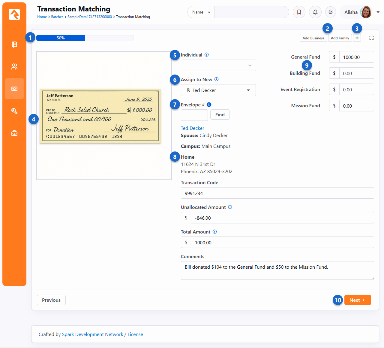 When you've used the check scanning software to add checks or scanned images of envelopes to a batch you must match them to individuals before you can close the batch. To start this process, open the batch you want to work on under Finance > Batches and then click the Match Transactions button. This will launch a screen to walk you through each check (or envelope) and allow you to tie them to an individual and enter the amounts into the proper accounts. Progress Indicator - This lets you know how far along you are in the process of matching all the scanned checks to people.Add Family/Business - You may find that the transaction is for someone who is not currently in the system. Using these buttons will pop up a new window where you can add them.Settings - Allows you to select which accounts you are entering amounts for.Check Images - The images of the scanned checks are shown here.Individual - Rock can match a person to the account and routing number of their checking account. If a person already matches the check's account information, you can pick them from the list.Assign to New - Assigns a new individual to the check’s account number.Envelope # - Allows you to search for an individual by their giving envelope number. This requires that the Enable Giving Envelope Number Global Attribute is enabled. See the Giving Envelopes chapter below for details.Person Details - The screen will present the currently matched person's address and contact information. This is a great way to not only ensure that you have matched to the current individual but also that their contact information has not changed.Account Split - Accounts are shown to allow you to split the check's total across multiple accounts based on notes in the memo field of the check or outside of the envelope.Navigation Buttons - Buttons at the bottom of the screen allow you to go to the next record or re-visit a previously completed record. NoteSaved Check MatchingOnce a person is matched to a check via the check's MICR information their name will be displayed in the 'Individual' dropdown shown in item #5 above. Multiple People Matching at the Same Time With large batches you might want multiple people to work on matching at the same time. Rock allows this by making sure that each person gets a different record to work on.