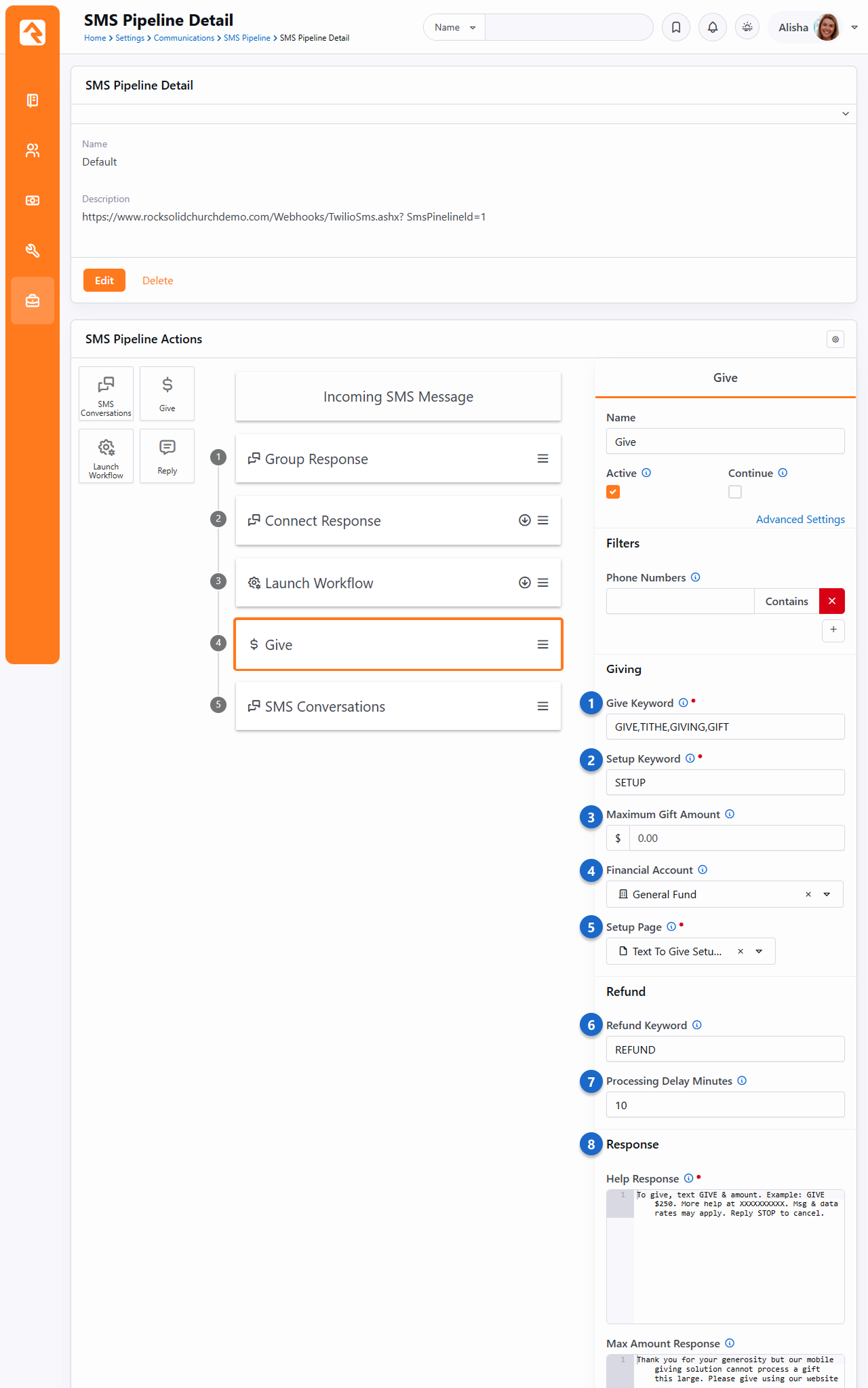 The next step in enabling Text Giving requires configuring your SMS Pipeline. There's a special Give action that is added to the pipeline to support Text Giving. For details on setting up and using the SMS Pipeline in general, see our Communicating Using Rock manual.