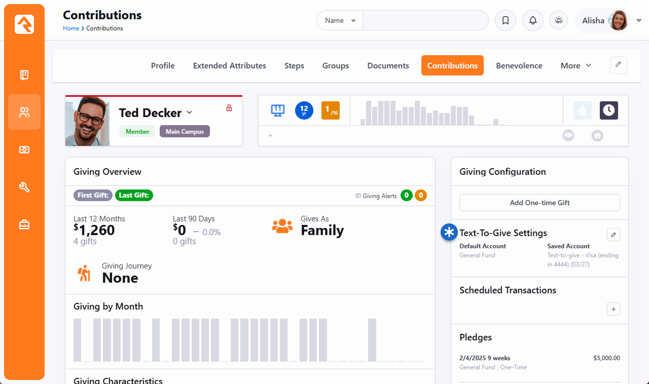 If the person uses Text Giving, you can see that information on the Person Profile page under the Contributions tab.