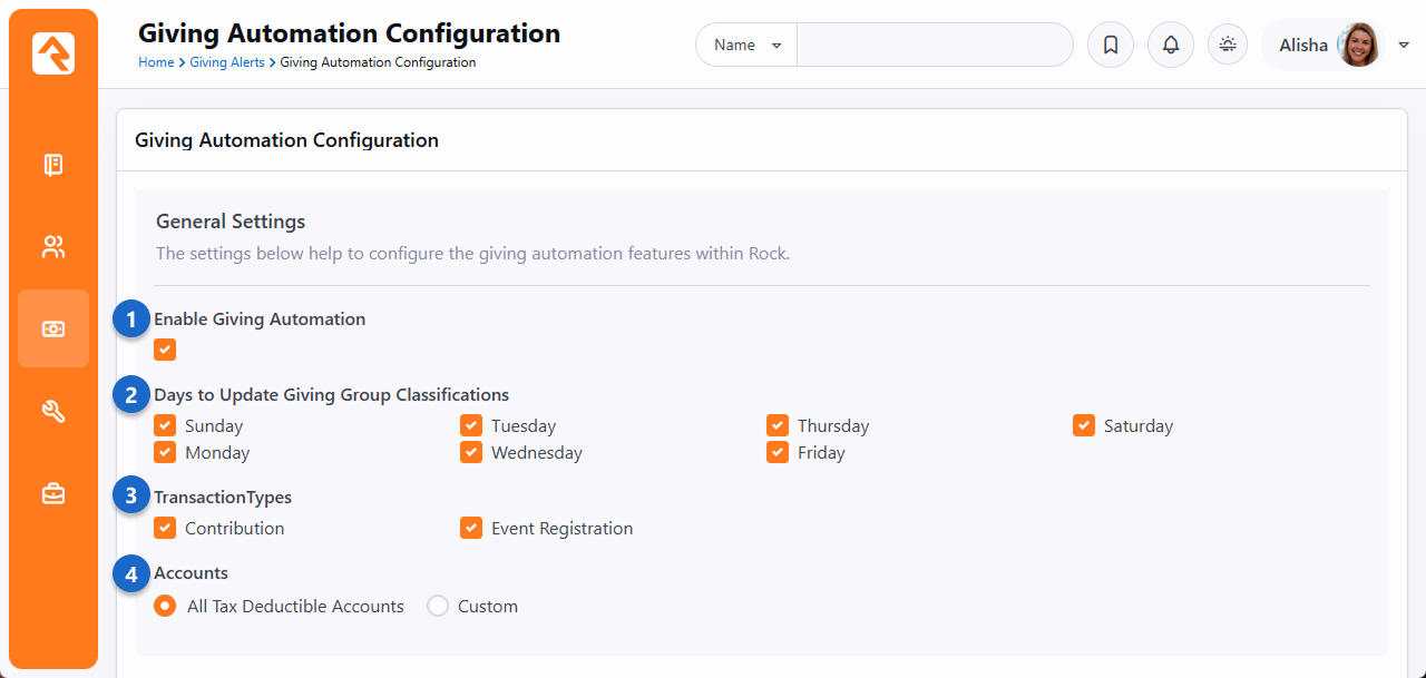 There are some general settings that control how giving automation features work at a high level. These settings drive much of what you see on the Giving Overview and are used by the Giving Automation job. This configuration can be accessed by clicking the ti ti-settings icon near the top right of the list of alerts under Finance > Giving Alerts. Typically, you won't make changes to these settings once they're in place. Enable Giving Automation - This needs to be enabled for the Giving Automation job to run, perform calculations and assign giving alerts. Even if you're not using alerts, you'll probably want to keep this enabled to ensure the giving information on the Person Profile page is up to date and accurate.Days to Update Giving Group Classifications - You might not need to update your giving data every day, or you only need the data updated weekly. For instance, Sunday giving is typically entered on Mondays, so you might choose to only run the update on Mondays. Choosing only certain days to update giving group classifications can help lighten the load on your system.Transaction Types - By default, the giving information described in the prior section comes only from contributions. However, you can choose to include payments for event registrations in the calculations. If you include event registrations, be sure to keep in mind that they do not apply to giving alerts.Accounts - Typically, you'll want the giving calculations to include gifts to any tax-deductible account. However, you can optionally provide a custom list of individual accounts if you want to limit where the giving data is coming from.