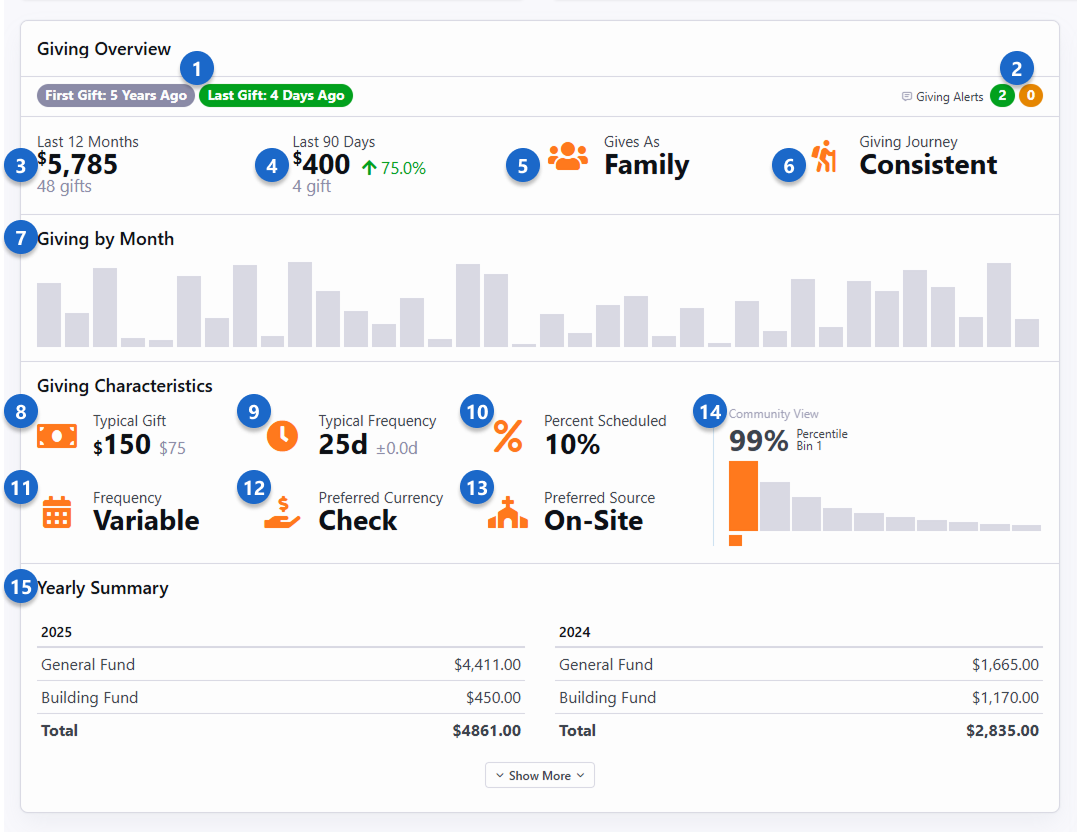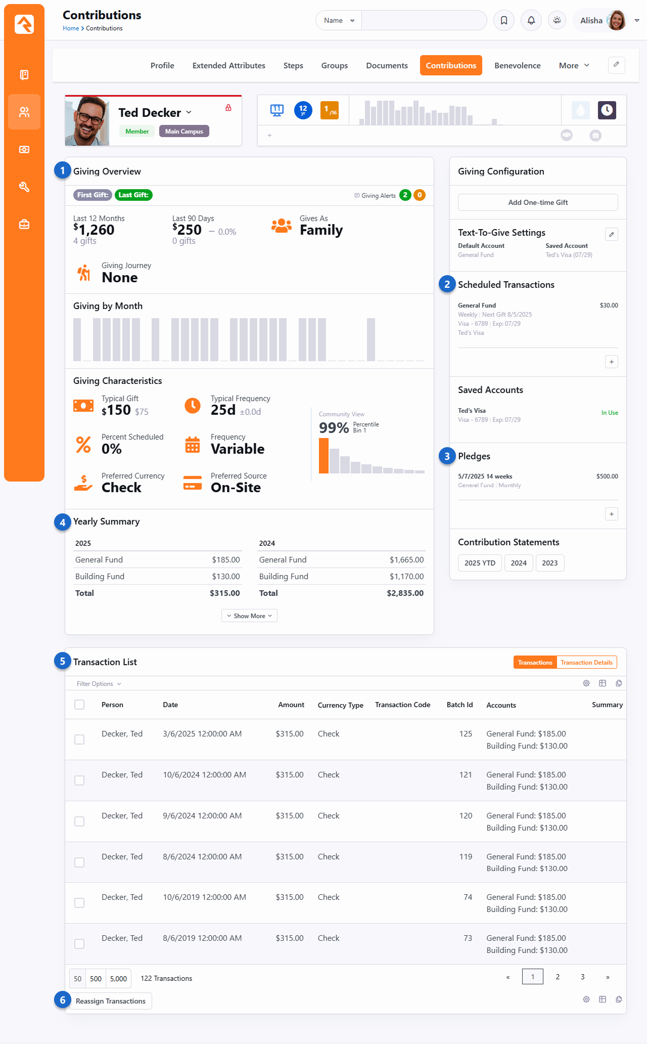If you're interested in the giving information for a specific person, you can visit their Person Profile page. There is a tab that allows you to view their giving information. This tab is configured to only be accessible by people in the following groups: RSR - Finance AdministrationRSR - Finance WorkerRSR - Rock Administration Giving Overview - The Giving Overview provides a lot of information about the person's giving. We have an entire section dedicated to this below. Scheduled Transactions - Scheduled transactions for the person are listed here, and more can be added.Pledges - A listing of any pledges the person has made, with the ability to add more.Yearly Summary - Summary of total contributions by year for the current person.Transaction List - Filterable list of transactions for the current person.Reassign Transactions - This lets you take the selected transactions and reassign them to a different person. You can also optionally reassign bank accounts. This may be needed in cases of divorce or if two spouses want separate giving statements. Person Profile Giving Overview Giving Overview information for a person can be viewed on the Contributions tab of the Person Profile page. There's a lot of important information packed into the Giving Overview that lets you see many details of a person's giving habits, and changes to those habits. For instance, you'll want to keep an eye on the Giving By Month chart, to look for bars that are unusually high or unusually low, as these can be good indicators that maybe something has changed in the person's life. Let's take a look at an example for Ted Decker. As you read through, keep in mind that each of these items is stored as a person attribute, making it easy to access this data in reporting, communications or workflows. First/Last Gift - This lets you know how long the person has been giving, and how long it's been since their last gift. This high-level information gives you insight into the person's giving history.Giving Alerts - Giving alerts are triggered when a person's gift meets certain criteria. We have a whole section on Giving Alerts below.Last 12 Months - The total amount given in the past 12 months, as well as the number of gifts during that time.Last 90 Days - This shows how much the person has given in the last 90 days, and the number of gifts. The change compared to the past 12 months is shown, so you can gauge changes to the person's giving and whether they're trending up or down.Gives As - Here you can easily see if the person gives as an individual or as a family.Giving Journey - A person's Giving Journey stage tells us more about their giving habits. In this example Ted is a Consistent giver. Others might be in a different stage in their journey. See the Giving Journeysection below for more details.Giving by Month - At a glance you can visualize patterns of giving, showing times when the person's giving has gone up or down compared to other months.Typical Gift - It's important to know what the typical gift looks like for a person, to allow us to identify when their giving changes from the norm so we can react appropriately. This statistic gives the median giving amount, and the typical amount by which that might vary.Typical Frequency - This is the average number of days between gifts. In this example Ted typically gives every eight days, but that can vary by as much as 3.5 days. This tells us that he probably gives weekly, but perhaps not every week.Percent Scheduled - Shows the percentage of the person's gifts that come from scheduled transactions. This helps you identify people who aren't giving as consistently as they could, so you can reach out to them.Frequency - This uses the typical frequency to calculate an overall frequency of giving for the person. Ted gives on a regular basis, so his frequency is classified as Weekly. Others might give on a bi-weekly, monthly, quarterly, erratic or variable basis.Preferred Currency - In this example we can see that Ted primarily gives by writing a check. Others might give using cash, credit cards or other methods.Preferred Source - Ted's preferred way to give is through on-site collection. Others might give through places like your website or mobile application.Community View - This shows you how the person's giving compares to others in the community. This isn't to classify people, but rather to show where this person's giving falls in a larger context. Each person is assigned a bin based on their giving, as detailed in the next section below.Yearly Summary - This area shows a total amount of giving by year for the person, broken up by account. This gives you insight into where the person is giving, in addition to how much. The Giving Characteristics area of the Giving Overview is calculated by the Giving Automation job. The other areas are calculated when the information is accessed. You might have noticed that we use two different methods to calculate the Typical Gift and Typical Frequency. A lot of time and effort went into ensuring that we use the right calculations the right way. As you continue to read this chapter, you'll find that anything related to a dollar amount (e.g. Typical Gift) uses a median and Interquartile Range (IQR) to show the typical giving amount and the amount by which it varies. On the other hand, anything related to giving frequency (e.g. Typical Frequency) uses mean (average) and standard deviation to provide the typical frequency and the length of time by which it varies. Calculating Community View The Community View is based on a typical yearly giving distribution. In the chart pictured below, the orange line represents giving amounts. The largest gifts are assigned to bin 1, while smaller gifts are assigned to bins 2, 3 and 4. Bin 1: Top 5% (+/- 1%) of gifts (e.g., $12,243 and above)Bin 2: Next top 15% (+/- 2%) of gifts (e.g., $4,000 to $12,242)Bin 3: Next top 20% (+/- 3%) of gifts (e.g., $1,364 to $4,499)Bin 4: Bottom 60% (+/- 5%) of gifts (e.g.