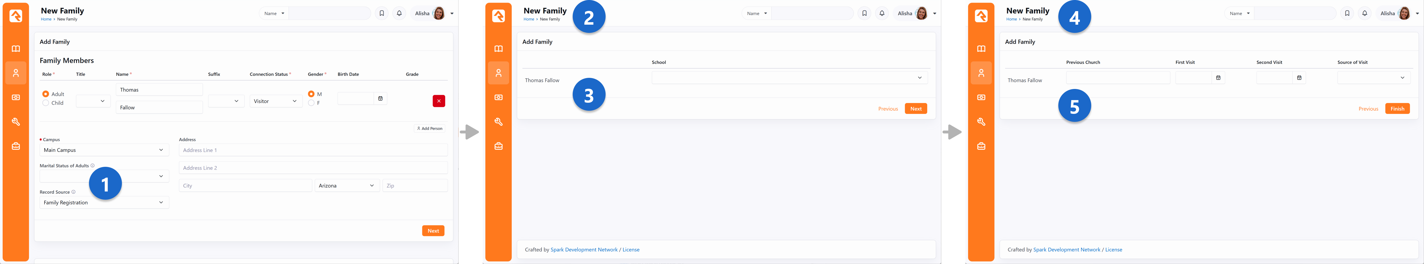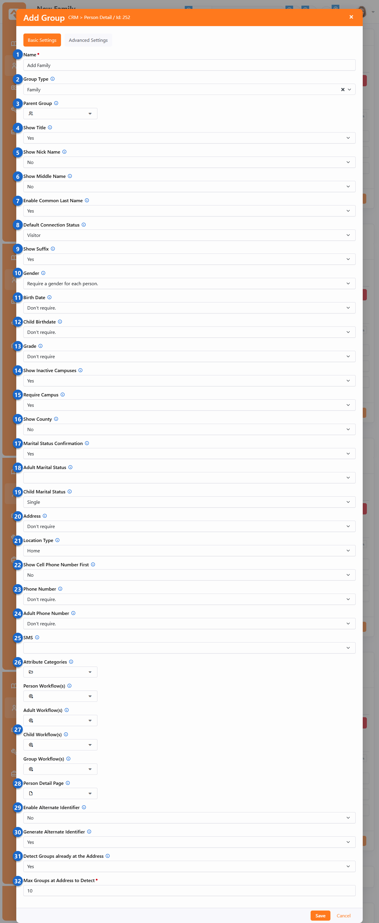 WarningBefore adding a new family be sure to search the database first. No matter how certain you are that they are new, you should always double check. To add a family to the database, click People > New Family from the main menu. Rock will display the New Family screen. Family Members First, add the individuals to the family. Completing this section should be fairly easy, but remember these points: Only use these fields to add individuals to the family who are not already in the database. If you know that one or more of the individuals are already in the system, just add those who are not. After the family is saved, you can then edit the family and add the existing members.Note the marital status selection below the list of family members. This allows you to set the marital relationship of the adults in the family. These options are Defined Values so you can rename them or add additional options. You can read more about editing Defined Values in the Rock Fundamentals guide. The Grade field will only be shown when you're adding a child.Additional addresses (work, previous) can be added after saving the family. Campus and Address The final step in adding a family is to select their campus and add their home address. Additional addresses can be added to the family after it has been saved. NoteThe Campus field will be hidden if there's only one campus set up in your system. If a campus value is required by your Add Family block settings (see next section) then the only available campus is automatically applied to the family's record behind the scenes. Add Family Block Settings You can customize which options you want to display in the Add Family block by customizing the block settings. Name - Enter the name you want to give the block. The default is 'Add Family'.Group Type - Select the group type to display groups for. The default is 'Family'.Parent Group - Select the parent group to add the new group to. The default is 'None'.Show Title - Select 'Yes' to display a dropdown menu of titles.Show Nick Name - Select 'Yes' to show an edit box for Nick Name.Show Middle Name - Select 'Yes' to display an edit box for Middle Name.Enable Common Last Name - Select 'Yes' to autofill the last name field when adding a new group member with the last name of the first group member. Remember, families are groups, and the individuals in the family are group members.Default Connection Status - Select the default connection status. If this is not set, the new family member will inherit the same status as the family member who is adding them.Show Suffix - Select 'Yes' to display the person suffix field.Gender - Select whether gender should be required for each person added.Birth Date - Select whether a birth date should be required for each person added.Child Birthdate - Select whether a birth date should be required for each child added.Grade - Select whether a grade should be required for each child added when the group type is Family.Show Inactive Campuses - Select whether inactive campuses should be shown.Require Campus - Select 'Yes' to make a campus required.Show County - Select 'Yes' to provide a County field in the address.Marital Status Confirmation - Select whether a confirmation message should be displayed when saving an adult without a marital status and the group type is Family.Adult Marital Status - Select the default marital status for adults when the group type is Family.Child Marital Status - Select the default marital status for children when the group type is Family.Address - Select whether to require an address for the family.Location Type - Select the type of location that should be used for the address.Show Cell Phone Number First - Select whether the cell phone number should be listed first before the home phone number.Phone Number - Select whether a phone number should be required for at least one person in the family.Adult Phone Number - Select whether a phone number should be required for each adult added.SMS - Select whether SMS should be enabled for cell phone numbers by default.Attribute Categories - Select the Person Attribute Categories to display attributes from. The next section below talks about how this setting is used.Workflows - Which workflows to launch when a family is added.Person Detail Page - Select the page to navigate to after the family has been added. {GroupId} and {PersonId} can be included in the route. Leave blank to go to the default page of ~/Person/{PersonId}.Enable Alternate Identifier - If set to "Yes" you can manually enter a custom identifier for each person when adding the family.Generate Alternate Identifier - When this is set to "Yes" an alternate identifier will be generated automatically for each person.Detect Groups already at the Address - If there is already a family (i.e., group) at the address provided, then you can have the system detect it and alert you. You will then be able to use an existing group instead of creating a new one.Max Groups at Address to Detect - Use this feature to reduce the number of existing groups you'll be presented with when adding a new family to an address in use by other groups. Select which options and default settings you want to display and click Save. WarningDefault Connection StatusAs noted above, if a Default Connection Status has not been set, then the new family member will be assigned the same status as the family member who is adding them. For instance, a new child will be added with a status of 'Member' if the parent's status is 'Member'. If you have requirements for certain statuses, be sure to set a Default Connection Status to ensure people aren't assigned statuses for which they do not qualify. Want Even More Info? For many, the family entry screen will be just what the doctor ordered. Some organizations, however, may want to capture additional information about the family. The good news is you can have both! The block settings of the Family Entry block include a setting for configuring attribute categ
