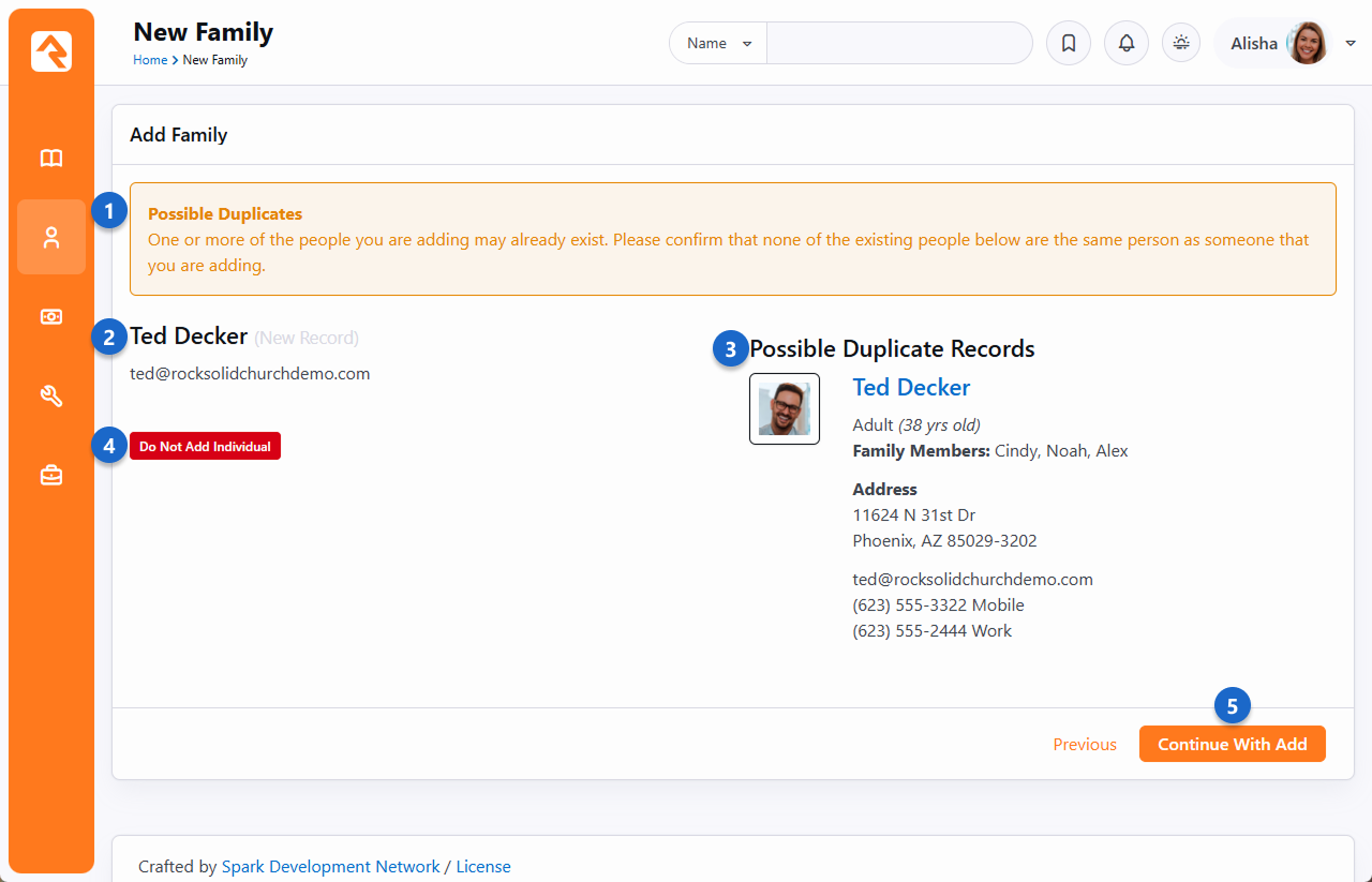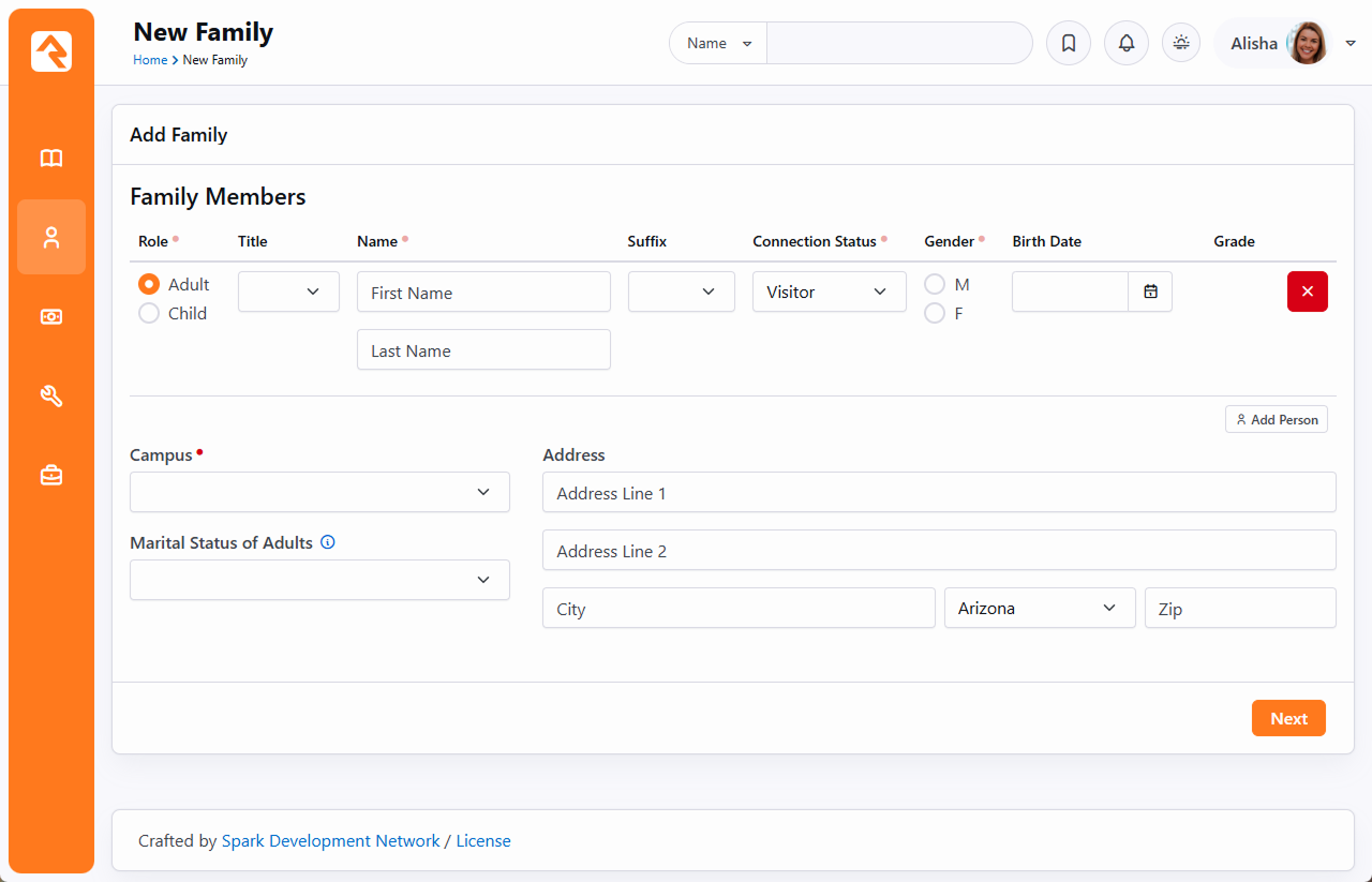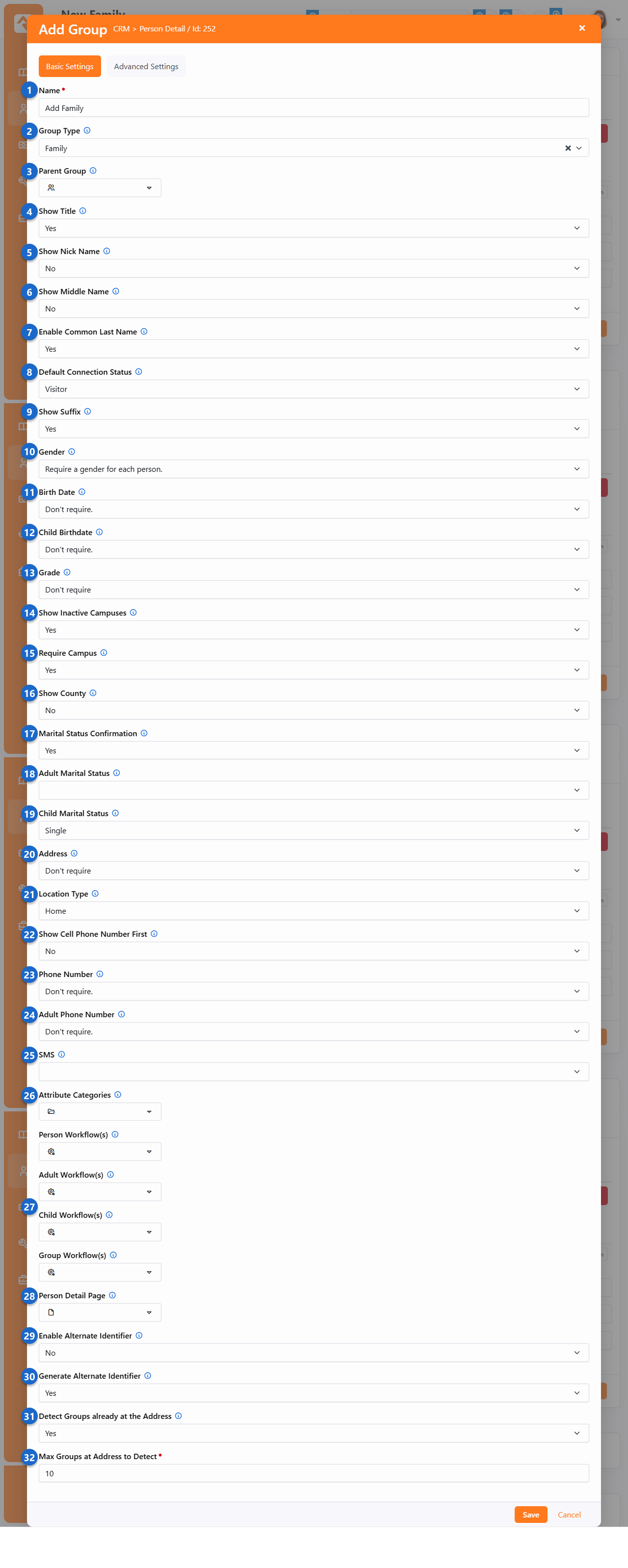 WarningBefore adding a new family be sure to search the database first. No matter how certain you are that they are new, you should always double check. To add a family to the database, click People > New Family from the main menu. Rock will display the New Family screen. Family Members First, add the individuals to the family. Completing this section should be fairly easy, but remember these points: Only use these fields to add individuals to the family who are not already in the database. If you know that one or more of the individuals are already in the system, just add those who are not. After the family is saved, you can then edit the family and add the existing members.Note the marital status selection below the list of family members. This allows you to set the marital relationship of the adults in the family. These options are Defined Values so you can rename them or add additional options. You can read more about editing Defined Values in the Rock Admin Hero Guide. The Grade field will only be shown when you're adding a child.Additional addresses (work, previous) can be added after saving the family. Campus and Address The final step in adding a family is to select their campus and add their home address. Additional addresses can be added to the family after it has been saved. NoteThe Campus field will be hidden if there's only one campus set up in your system. If a campus value is required by your Add Family block settings (see next section) then the only available campus is automatically applied to the family's record behind the scenes. Add Family Block Settings You can customize which options you want to display in the Add Family block by customizing the block settings. Name - Enter the name you want to give the block. The default is 'Add Family'.Group Type - Select the group type to display groups for. The default is 'Family'.Parent Group - Select the parent group to add the new group to. The default is 'None'.Show Title - Select 'Yes' to display a dropdown menu of titles.Show Nick Name - Select 'Yes' to show an edit box for Nick Name.Show Middle Name - Select 'Yes' to display an edit box for Middle Name.Enable Common Last Name - Select 'Yes' to autofill the last name field when adding a new group member with the last name of the first group member. Remember, families are groups, and the individuals in the family are group members.Default Connection Status - Select the default connection status. If this is not set, the new family member will inherit the same status as the family member who is adding them.Show Suffix - Select 'Yes' to display the person suffix field.Gender - Select whether gender should be required for each person added.Birth Date - Select whether a birth date should be required for each person added.Child Birthdate - Select whether a birth date should be required for each child added.Grade - Select whether a grade should be required for each child added when the group type is Family.Show Inactive Campuses - Select whether inactive campuses should be shown.Require Campus - Select 'Yes' to make a campus required.Show County - Select 'Yes' to provide a County field in the address.Marital Status Confirmation - Select whether a confirmation message should be displayed when saving an adult without a marital status and the group type is Family.Adult Marital Status - Select the default marital status for adults when the group type is Family.Child Marital Status - Select the default marital status for children when the group type is Family.Address - Select whether to require an address for the family.Location Type - Select the type of location that should be used for the address.Show Cell Phone Number First - Select whether the cell phone number should be listed first before the home phone number.Phone Number - Select whether a phone number should be required for at least one person in the family.Adult Phone Number - Select whether a phone number should be required for each adult added.SMS - Select whether SMS should be enabled for cell phone numbers by default.Attribute Categories - Select the Person Attribute Categories to display attributes from. The next section below talks about how this setting is used.Workflows - Which workflows to launch when a family is added.Person Detail Page - Select the page to navigate to after the family has been added. {GroupId} and {PersonId} can be included in the route. Leave blank to go to the default page of ~/Person/{PersonId}.Enable Alternate Identifier - If set to "Yes" you can manually enter a custom identifier for each person when adding the family.Generate Alternate Identifier - When this is set to "Yes" an alternate identifier will be generated automatically for each person.Detect Groups already at the Address - If there is already a family (i.e., group) at the address provided, then you can have the system detect it and alert you. You will then be able to use an existing group instead of creating a new one.Max Groups at Address to Detect - Use this feature to reduce the number of existing groups you'll be presented with when adding a new family to an address in use by other groups. Select which options and default settings you want to display and click Save. WarningDefault Connection StatusAs noted above, if a Default Connection Status has not been set, then the new family member will be assigned the same status as the family member who is adding them. For instance, a new child will be added with a status of 'Member' if the parent's status is 'Member'. If you have requirements for certain statuses, be sure to set a Default Connection Status to ensure people aren't assigned statuses for which they do not qualify. Want Even More Info? For many, the family entry screen will be just what the doctor ordered. Some organizations, however, may want to capture additional information about the family. The good news is you can have both! The block settings of the Family Entry block include a setting for configuring attribute categor