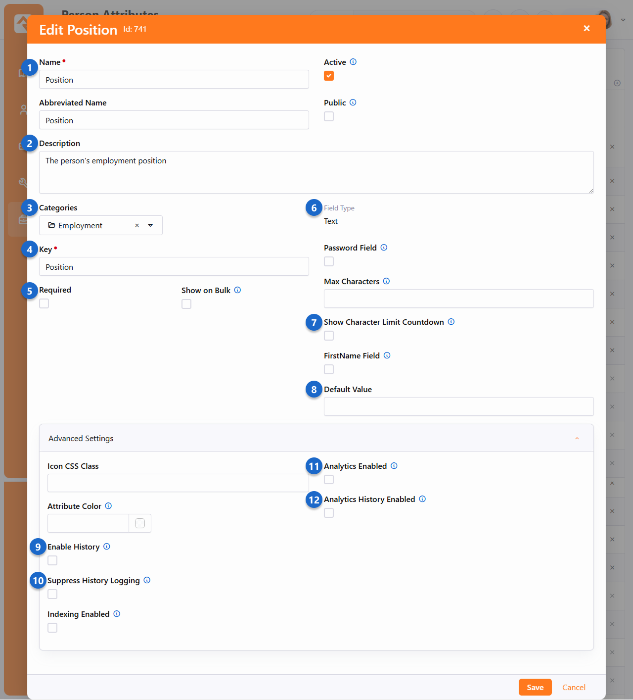 11. Analytics Enabled -This one applies to Business Intelligence (BI) reporting, which we cover in the Business Intelligence manual. If it's enabled, this attribute and its value will be tracked on Person Analytics tables (aka BI models). Specifically, tables like AnalyticsDimPersonCurrent and AnalyticsDimPersonHistorical will store the attribute's value. If you're not reporting from BI tables, this setting can be ignored.