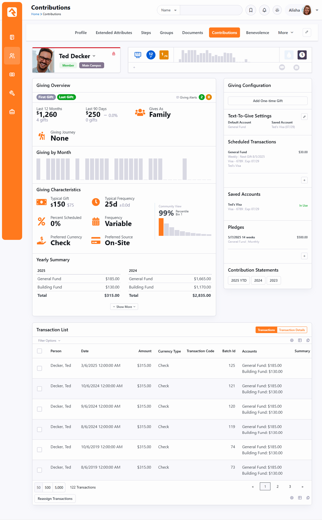 This subsection shows the contributions made by the individual (or family, if combined as a family) and any repeating giving profiles that they have. Staff members can be granted access to create new recurring giving profiles or edit existing ones from this page. The Giving Overview section provides details and analysis of the person's giving.