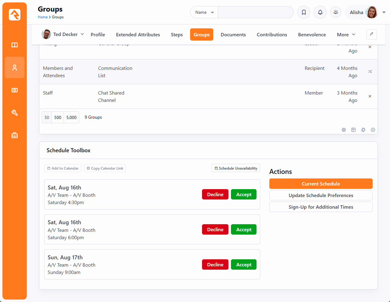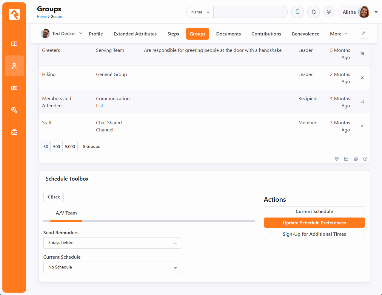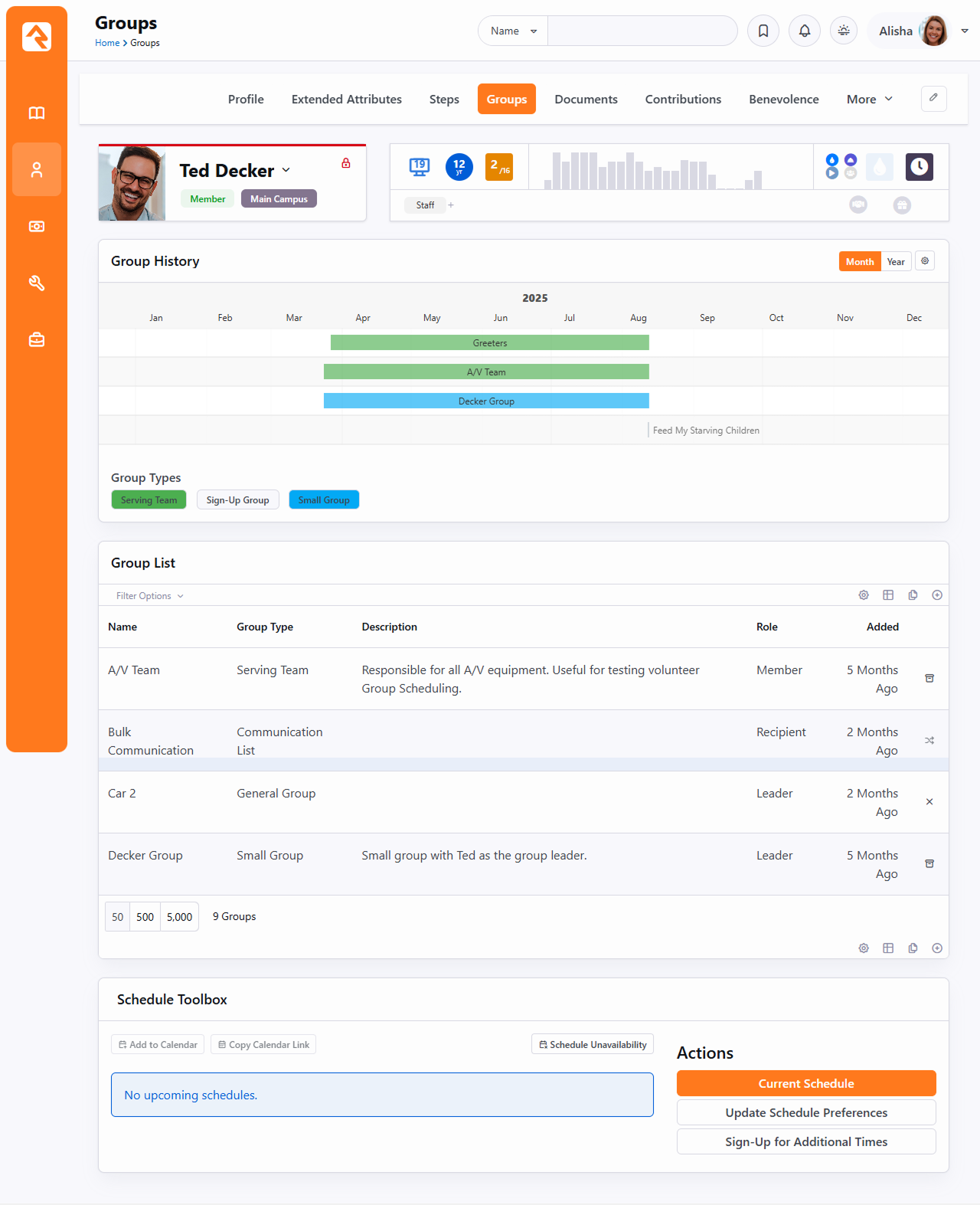 The Groups subsection displays a timeline of the person's history with groups, as well as a grid view of all the groups the person is involved with. The grid lists important facts like the type of group, the individual's role in the group and the date they were added to the group. Schedule Toolbox The schedule toolbox is used to update and display information that intertwines with the group scheduler. Each person will have their confirmed and requested schedule, their preferences and a sign up button. This area shows the person's confirmed and requested schedule. This same information can also be seen if that person is signed in on the external site under My Account > Schedule Toolbox. An internal staff member can set a person’s schedule preferences, or the person can set their own preferences and sign up for events using the Sign Up tab from the external website. Learn more about the group schedule toolbox and group scheduling in the Rock Your Groups guide.