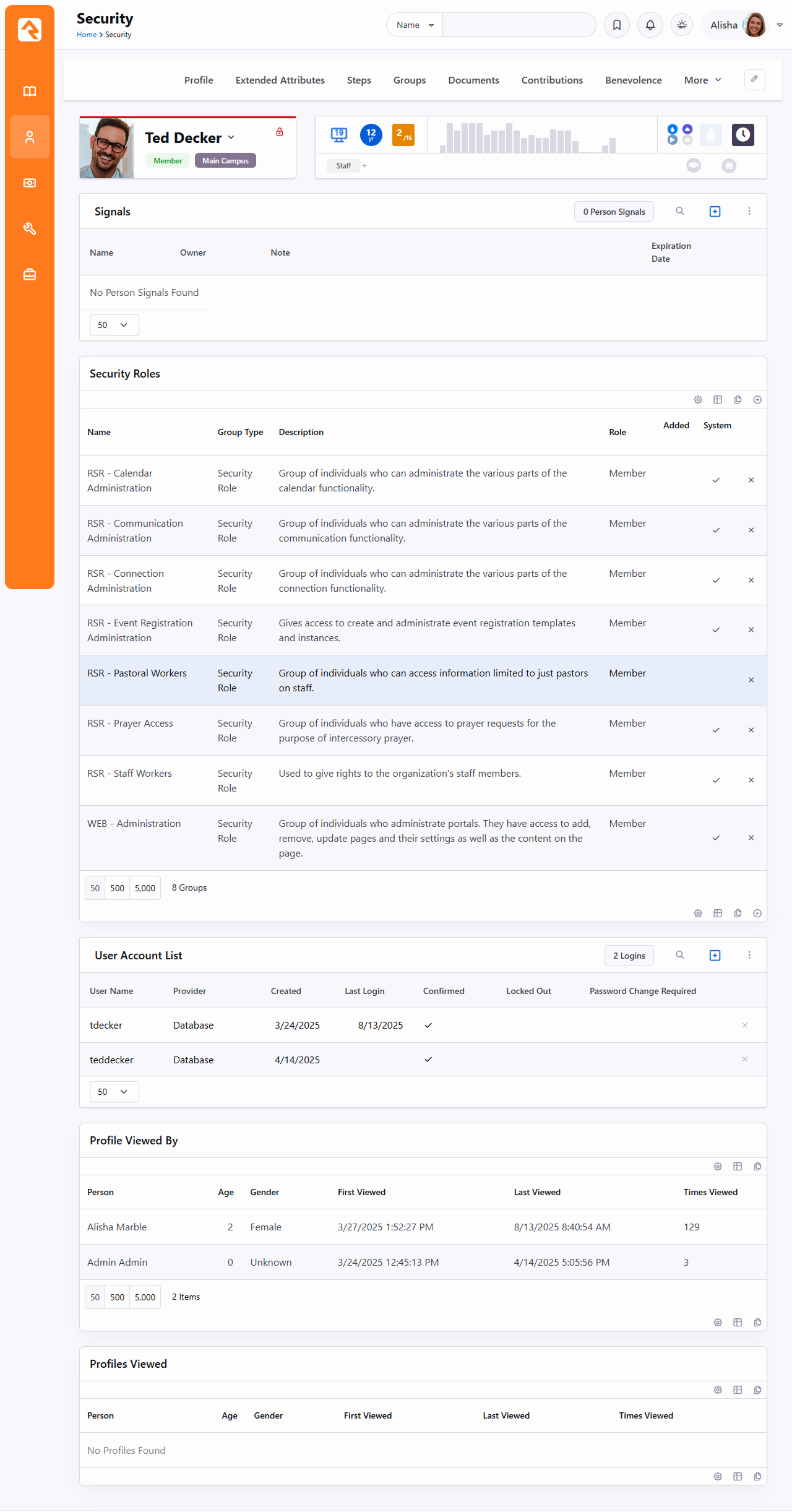 Rock takes security very seriously and offers several ways to protect both information and people. The Security tab is one location where you can view and access Rock's security settings and data. Signals Signals are discreet flags that can be assigned to a person to bring attention to something. They can be used to flag anything from security concerns to high-level lay leads and everything in between. Click the ti ti-plus button to add a new signal. Click the ti ti-x button to delete an existing one. Security Roles In the Security Roles section, you can view, add and delete the person’s security roles. The Rock Admin Hero Guide has all the details you’ll need for understanding these roles and their meanings. User Account List Each account (i.e., username) associated with a person is listed here. Over time a person can obtain multiple accounts if they forget one and re-register on the website. You can manage accounts in this section. For more information on user accounts and logging in, check out the Rock Admin Hero Guide. Profile Viewed By The Profile Viewed By section contains a record of people who have viewed this person's profile. The information in this section can't be modified, but it can be exported into an Excel report if needed. Profiles Viewed The Profiles Viewed section contains a record of the profiles this person has viewed. The information in this section can't be modified, but it can be exported into an Excel report if needed.