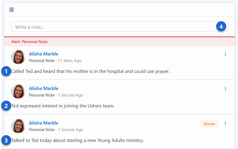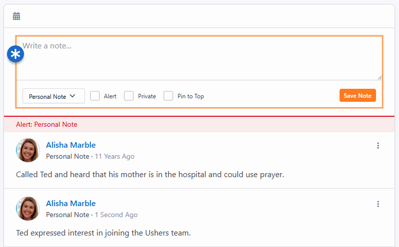 You just can’t take too many notes! Documenting key conversations and important details is vital to the success of your organization. Here are some examples: Information on life events like hospitalization of a loved oneInterest in a specific serving areaLikes or dislikes (i.e., preferences related to your organization)Time and date of phone calls These notes help the staff to be on the same page and help make an organization of any size feel small and caring. There are different types of notes: Alert Note - Used to alert viewers of very important topics. These note types will always remain at the top of the list.Normal Note - These are the default note type. They are viewable by anyone who has been given access to them.Private Notes - These notes are viewable only by the person who entered them.Add Note - Click in this area and start typing to add a new note. Sometimes you might want to enter a note that only you can see. There are a couple of ways to do this. The first, and easiest, is to make the note private. When you do this, you’ll be the only one who can view it. If you would like to share the note with a limited group of people (like Pastoral Staff), click the ti ti-lock button and enable viewing for only the Pastoral Staff group. NoteBecause we can't add security to an item before it's been created, the security icon will only be visible after the note is saved. Editor Window - This is where you can enter notes and mark them as Alert or Private. If neither Alert nor Private are checked, the note can be seen by anyone with security to view person notes. You can also select Pin to Top to keep the note at the top of the list. Sometimes a note is very important, and you want everyone to see it. Checking the Alert checkbox will keep the note at the top of the list and highlight it in red. These types of notes can be used to warn staff of a potential issue. WarningIf you’re creating an alert note, then it’s probably related to unpleasant or sensitive circumstances. As you consider your wording for an alert, try to be as discreet as possible while still getting your point across. We mentioned above that Alert notes will stay at the top of the list of notes. Below the Alert notes will be notes marked as Pin to Top. If there are multiple Alert, Pin to Top, or regular notes, then the most recent notes will be displayed first. Security for Notes It's important to understand who will be able to see or edit notes. We touched briefly on note security above, but here is a full breakdown of what you can expect. Private: Private notes are only viewable by the creator. No one else, no matter what their permissions are, can see them.Approve: The Approve security verb lets you approve notes. You can view any notes for which you have Approve permission.View: You can view a note if you have View security to the note itself. You can also view notes you have created or modified in the past. Lastly, you can view a note if you have rights based off of the Note Type.Edit: Edit access gives you rights to add a new note and to edit notes that you have created. Edit access DOES NOT give you rights to edit notes that were created by someone else.Administrate: Administrate permission will let you edit notes, including notes you did not create.