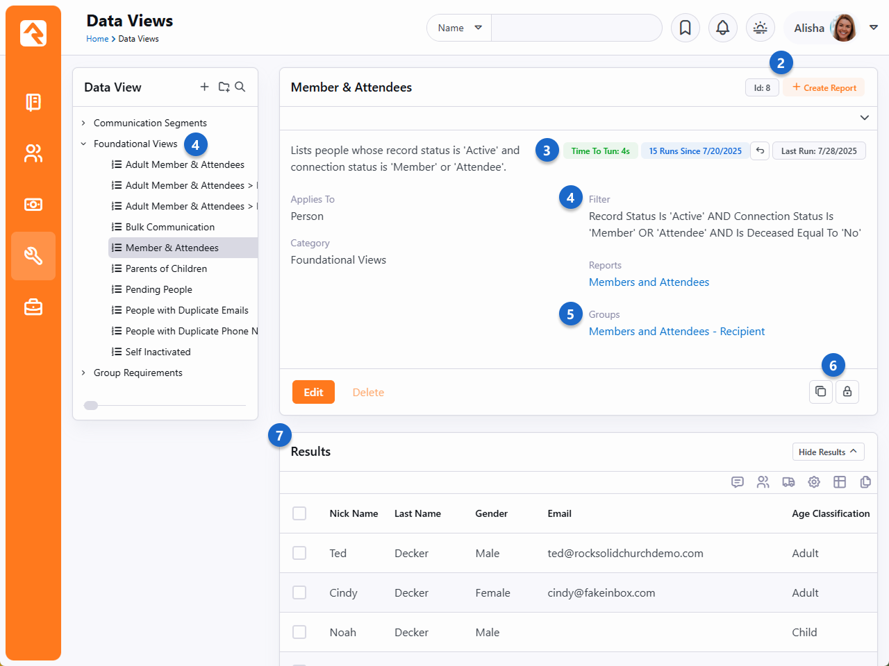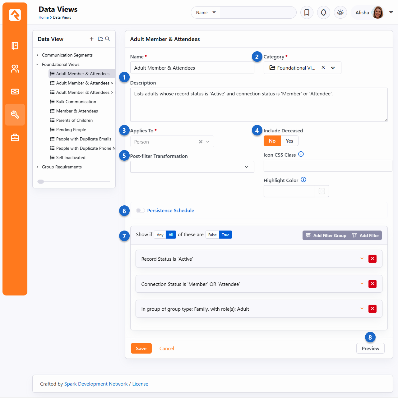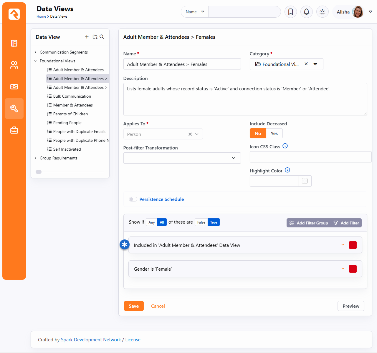 Let's start by looking at a couple of the Data Views that come out-of-the-box. Data Views are configured under Tools > Data Views. Below is a figure of the default list of data views. Over time you'll collect plenty of data views. To help you organize them we allow you to create a hierarchical directory of categories. The use of categories again becomes a part of your reporting strategy. What good is a reusable data view if you can't find it when you need it? Categories - Data views are organized into hierarchical categories. Categories help you sort and organize your data views.Id and Create Report - The Id of the data view is displayed here for reference. You can also click the Create Report button to start creating a report using the data view. We'll explain creating reports in the next chapter below.Run Details - How this area looks will change depending on the activity, or lack of activity, associated with a data view. In this example we can see:Time to Run - This label shows how long it took to retrieve the data. This is a great way to identify potential performance issues.Runs Since - Here you can see how many times the data view has been run since the displayed date. This is an easy way to get a sense of how frequently the data view is used.Reset - Click the ti ti-arrow-back-up button to reset the Runs Since field. This will set the count of runs back to zero, as of today's date. Last Run - This displays the most recent date that the data view was run. If the date is very far in the past, you might examine if the data view is needed anymore. Removing unused data views may help system performance but will also ensure a tidy system in general. Data View Filter Summary - This is an automatically generated summary of the filters used in this data view. We'll talk more about these filters below.Data Views / Reports - In this area you can easily see which other data views, reports or group syncs are using this data view. If you make any changes to the data view, these items will be impacted.Copy / Security - The ti ti-copy icon will create a new data view that is a copy of this one. You can also click the ti ti-lock icon to change security permissions for this data view.Results - These are the actual results of your data view configuration, according to the filters you've added. We'll go over filters in more detail below. Note that the results are in their own block, so you can do things like launch workflows for the items listed. Now let's drill into the first data view called Adult Members & Attendees. As you probably guessed, this view filters adults who have the connection status of Member or Attendee. It also only returns only active records. Click the Edit button to see how this data view is configured. Name / Description - The name and description of the data view. We highly recommend writing a detailed description for your data view. Be sure to include how you intend the data view to be used. These details may not seem important now, but your future self will be thanking you.Category - A category should already be assigned when you first create the data view, but you can change it here if needed.Applies To - Technically, this field is where you specify the entity the data view is referencing. This tells Rock what filter options you have, which we'll discuss below. Most of the time you'll probably use either 'Person' or 'Group', but you're not limited to those.Include Deceased - This field will appear for data views that apply to people. If this is enabled, people who are marked as deceased in Rock will be included in the data view's results. In most cases this will be disabled.Post-filter Transformation - This is where you can optionally select one of the following post-filter transformations:Allowed Check-InAllowed Check-In ChildrenChildrenFamily MembersFatherGiving LeaderGrandchildGrandparentHead of HouseholdMotherParentsSpouse Speed Settings - Here you can choose to set a Persistence Schedule. To learn more about these settings, see the Persisting Data Views section below.Filters - This is where you create the filters that are used to define your criteria for limiting records. We'll dive into how the filter area is used in later sections below.Preview - To help check your work you can select the Preview button. This will show only the first 15 rows of data returned by your filters. Next, let's look at the Adult Members & Attendees > Females Data View. Initially you might expect to see a lot of the same criteria as the previous Adult Members & Attendees data view, with the addition of the female gender filter. Clicking the Edit button, you’ll see the data view strategy at work. Notice how the first criterion is Included in Data View: Adult Members & Attendees? That says, "Take all of the filter criteria from the Adult Members & Attendees data view and apply it here." Since that logic was already built, all we needed to do here was add the gender filter. Now, let's say in the future you'd like to enhance the definition of Adult Members & Attendees by ensuring that the age of the individual is over 18. You can add this to the base view, and it will dynamically apply to all subsequent views that use it. Age Classifications Speaking of the ages of individuals...Rock allows for simple and quick filtering on whether an individual is an Adult or a Child using the Age Classification property. This property is available as a Person filter type when creating Data Views and as a Field Type when creating Reports (more on that in the next chapter). In Rock, an adult is anyone over the age of 18 or marked as an adult in one or more families. A child is anyone less than 18 or a child in all families. If neither of these conditions are met, the individual is marked as Unknown. Rock calculates age each time a person is saved and re-calculates it every time the Rock Cleanup job is run. Any vs All At the top of the filter group, you’ll notice a setting that says Show if Any/All of these are