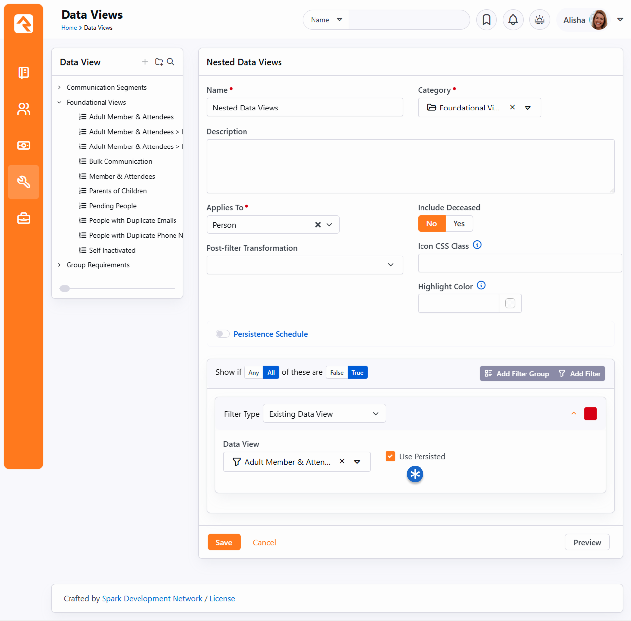 Sometimes when you have an extremely large or complex Data View, it can take a long time for Rock to filter down to just the records you're interested in. This can be critical when you're relying on the information in the data view for reports, for workflow actions (using Lava) and just to keep the load on your server as low as possible. This is especially true when you have data views referencing several other data views. Persisted Data Views to the rescue! If Persistence is enabled, Rock will only calculate the records in the list as frequently as you specify. That means that when you click on the data view, Rock already knows what records are in the list and can provide them extremely quickly. (Calculating the contents of persisted data views is what the Update Persisted Dataviews job does, in case you were wondering). When you persist a Data View, keep in mind that the statistical data (Time to Run, Runs Since, and Last Run) may not update as frequently as you'd expect. These values usually change only when the Data View's results are updated, not when the persisted results are being used. In other words, retrieving data from a persisted Data View doesn’t require it to be re-run, so the run statistics aren't always updated. Most of the time, the Data View will only be truly re-run when the job recalculates its contents, and that’s when you can generally expect the statistics to change. Since Rock isn't calculating the contents of these Data Views every time you load it, that does mean that the list might be out of date by up to the interval you specify. For instance, let's say that you have a very involved data view that, among other requirements, requires that the people in it are members of a certain group. But it's such an involved data view that it takes quite some time to load, so you set a Persistence Interval of "2 Hours". If Ted Decker matches all of the filters, then he will show up in the Data View when it's calculated, as expected (along with anyone else who matches all the filters). Now, if Ted leaves the group that you have to be a member of to be included in that Data View, it's possible that he will continue showing up in that Data View for up to two hours; the next time that persisted Data View will be re-evaluated. Usually, it's not extremely important that your Data Views be absolutely accurate up to the second, so that might not be a big deal. But if you're relying on a data view for something that needs to truly reflect the absolute latest data, then you should leave the Enable Persistence setting disabled. Nested Persisted Data Views Now, let's look deeper at nested Data Views and how it works when they're persisted. Let's say that we make "Adult Member & Attendees" a Persisted Data View - it's going to be calculated every two hours. Let's also say that we have another Data View that has a filter that specifies that the people must also be in the "Adult Member & Attendees" Data View. (Usually, you'd have other filters as well, naturally). It would look something like this: Since "Adult Member & Attendees" is now persisted and only calculated every two hours, then whenever you load a Data View that references it (with "Use Persisted" selected as shown) the list of Adult Members and Attendees might be as much as two hours old. Hopefully nobody stopped being a member/attendee that quickly, but if they did, they could continue showing up in this Data View until the next time the nested Data View is calculated. Put another way: if a Data View has persisted child data views, it will use the persisted version of the child data view if "Use Persisted" is enabled. In general, it would be much faster to persist a data view if "Use Persisted" is enabled on its child data views. However, its accuracy is limited to the child data view that had the longest "Persistence Interval".