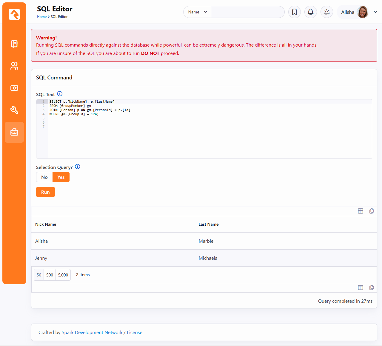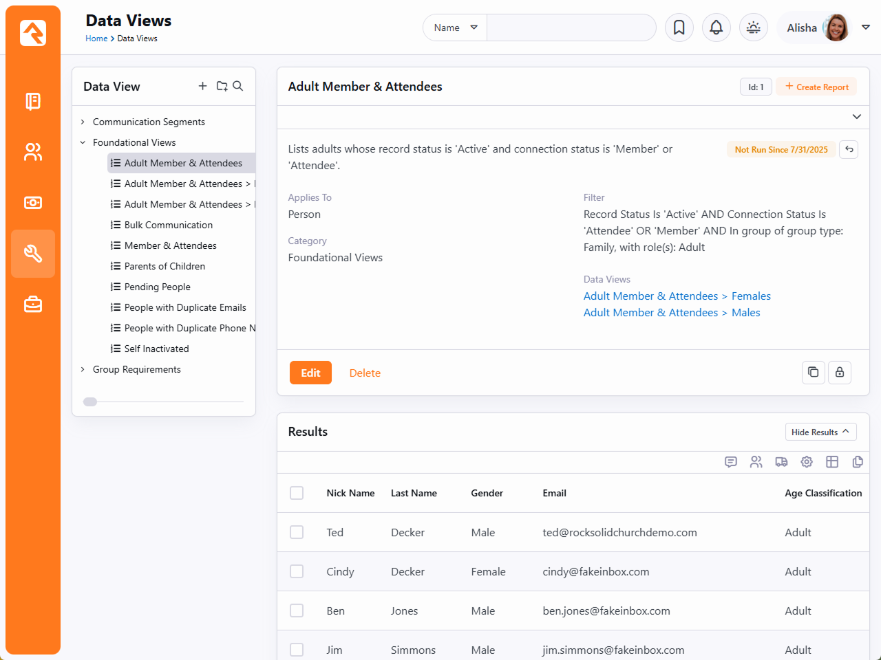 There's no use putting data into a system if you can't get it back out. In fact, the tools to report and display your data are much more important than the entry tools. Rock's reporting and analytics tools were some of the first features to hit the drawing board. We based them on years of real-world experiences – previous successes and lessons learned. We hope that you'll take the time to not only learn how to drive the tools, but more importantly, how to build a successful reporting strategy that provides consistent and reliable results. Let's get started. If You're Only Going to Read One Chapter OK, now that we have your attention... Before diving into the tools let's start with a discussion on strategy. It's tempting to want to start writing your first report. But trust us - this chapter will save you countless hours and the embarrassment that comes from delivering conflicting and incorrect reports. The usual workflow for application reporting goes something like this: Get a request for a report.Write the report per the request. Seems pretty logical, right? This is actually a great strategy if you only get one report for the lifecycle of the application. Well, that's never going to happen! We all know you'll need to write hundreds of reports over the lifetime of the application. The problem is that many of these reports will have lots of similar requirements, with just small differences. Eventually, you'll end up wasting a good amount of time writing almost the same reports. If you're not careful, some of them might even conflict with each other. So why not slow down and create a strategy of re-usable reporting components? Ok, that sounds like a plan! When designing Rock, we resisted the urge to rush and make a traditional ad-hoc reporting tool. We looked back at the years of lessons learned (embarrassingly enough there are many of them) and designed an architecture that allows you to build a reporting strategy. What Makes Up a Report? There are two facets to any report: filter and display criteria. Consider this example. Your organization's leader walks in your door and asks for a list of attendees over the age of 18 who began attending within the last two years. They would like to have the names, contact information and the number of times they have attended. Using this example, let's look at each of the facets of reporting. Filter Criteria: These are the criteria that limit the results to display. They answer the "Who" part of the request. In the case of the example, the criteria would be:AttendeesGreater than 18 years of ageBegan attending in the last two years Display Criteria: Once the results are filtered you must display them, with the necessary attributes, to the person using the report. In the case of our example, these attributes might be:NamePhoneEmailAddressNumber of Times Attended Once you create your handy report for your leader, it's very likely they'll be back asking for further changes. Perhaps now they want another report with the same logic but only showing females. In most systems you'll have to start over and make a copy with the addition of the new criteria. Now you have two very similar reports to maintain. With Rock, we have deliberately chosen to split the filter and display activities in reporting. You create your filters by defining Data Views. You then create your display by creating Reports that use the Data Views. Reporting Strategy The strategy part of reporting comes from the definition of your Data Views. It will be tempting to quick-write a very specific data view for each report. Consider, though, that data views can extend and build off of each other. For instance, you might create a data view that filters Adult Members & Attendees and then create a new data view that uses this view and adds the criteria of female gender. You’ve now created two views that can be used for the report at-hand AND in future reports. What’s more, if you ever need to redefine what makes an Adult Member & Attendee, you can change it in one place and all reports that are built off of that view will get the new definition. These two data views are available out-of-the-box with Rock. Consider the results of these views on the Rock sample data in the figure below. Before starting any report, you should ask yourself: What, if any, criteria filter in this report might be reusable in future reports?What data views have I already defined that I can start with for this report? WarningYou can take the concept of reusable data views too far. Be sure to strike a balance between what is reusable and being overly complex. Don't worry - we've only scratched the surface of Rock's tools. Now let's get our hands dirty learning about creating data views and reports as well as learning about Rock's other reporting tools. SQL Editor While not technically a reporting tool, the SQL Editor page (Admin Tools > SQL Editor) allows you to execute a SQL statement right in the browser. This makes it possible for administrators and developers to perform many tasks without requiring software like SQL Server Management Studio. Warning Special Care should be taken with this tool, since it does permit UPDATES to your database. Since it is possible to quickly wipe out swaths of data, access to this page/block should be minimized to people with something to lose in return.