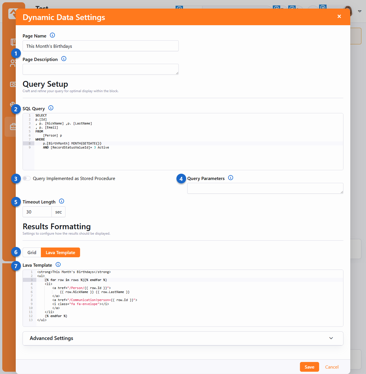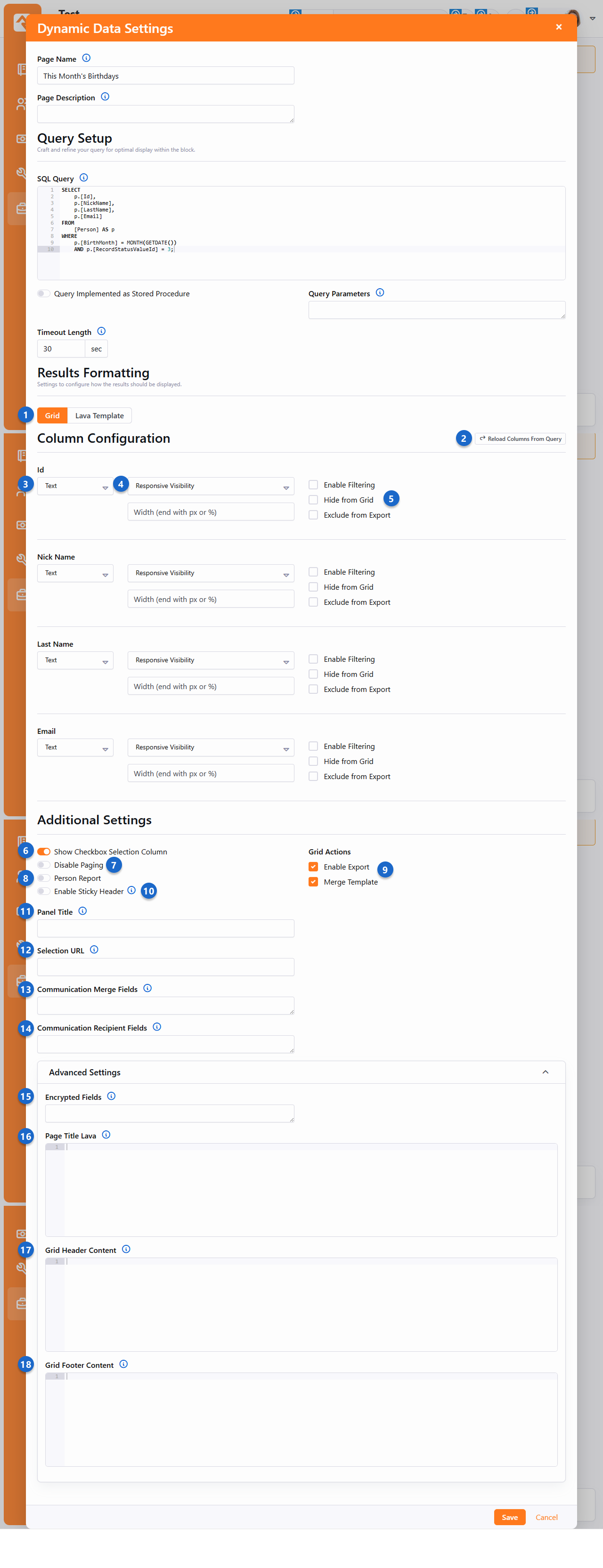 Most of your reporting needs can be met using Data Views and Reports. However, if you have unique requirements that can't be addressed with these tools—or if you want a more customized experience—the Dynamic Data Block provides a flexible solution. You should be able to use data views and reports to meet most of your reporting requirements. If you have a special requirement that can’t be met, or you prefer a different user experience than what reports provide, there is the Dynamic Data block. When you add a Dynamic Data block to a page (see the Designing and Building Websites Using Rock guide for details on adding blocks to pages), you have the ability to craft the display of filtered data. Let's walk through the various options of this block. Some settings depend on whether you're using Grid or a Lava Template for Results Formatting. We'll start with the Lava Template option which covers the first six common settings. Page Name/Description - This allows you to reset the title and description of the page from within the block. The ability to do this is controlled by the Update Page block setting discussed later.SQL Query - This is the SQL query or stored procedure call (more on procedures below) for defining the data to be displayed. SQL is a standard reporting language used by most databases. There are plenty of resources online for learning its syntax.Query is a Stored Procedure - This setting tells Rock that you will be calling a stored procedure, as opposed to using a straight SQL statement. This allows Rock to configure any parameters needed for the stored procedure.Query Parameters - When using stored procedures, you can pass in parameters to create dynamic filters. More on this feature is covered below in the Extra Power from Stored Procedures section.Timeout Length - As a safeguard against queries that take too long to run, you can specify a timeout period (in seconds). If the query exceeds this limit, it will stop running.Results Formatting: Lava Template - By default, the query will be shown as a grid on the page. If you'd prefer, you can select Lava Template and provide a template that will be used to transform the query results into your own custom layout. This is incredibly powerful because you can start to create your own mini-applications using these dynamic data blocks for displaying data. The Column Configuration section will only display if Grid is selected. Grid is covered in the next example.Lava Template - This is where you put your custom Lava template that will be used to format the query results output. This version of the Dynamic Data block makes it easy to tap into the power of Rock's new grid system, allowing you to create a great viewing experience when using the Grid Results Formatting option. Results Formatting: Grid - Selecting this option displays query results in a grid format. When using the Grid, the Column Configuration section appears, enabling you to customize how columns behave.Reload Columns From Query - When you first supply a SQL Query, the Column Configuration section will be empty. Click this button to read your query to set up configuration options for each column. Use this button again whenever you modify the SELECT columns in your query to refresh the available configuration settings.Column Type - This setting controls how each column in your SQL query is displayed and behaves. Think of it as a way to tell Rock what kind of data is in each column — like numbers, dates, or text — so it can properly format the data and make it easier to work with.Text: Displays values as plain text, perfect for names, descriptions, or labels.Boolean: Shows values as "True" or "False," useful for yes/no or on/off data.Currency: Formats values as monetary amounts, adding the appropriate currency symbol and decimal places.Date: Displays only the date, such as "01/03/2025," for when the time portion does not exist or is unimportant.DateTime: Displays both the date and time, such as "01/03/2025 2:30 PM," for more precise records.HTML: Supports custom HTML formatting, ideal for rich text, links, or content you've styled in your SELECT.Number: Formats values as numbers, making them sortable and usable for calculations.Person: Beautifully formats the value as a person record, making it easy for you to 'wow' your staff members. Response Visibility - This field controls whether a column is shown or hidden based on the size of the viewer's web browser window. It allows you to optimize reports for different screen sizes, ensuring that important information is always visible, while less critical details appear only on larger screens. Width: For even more control, you can specify a custom width for a column using either pixels (px) or percentages (%). For example, use 200px for a fixed width of 200 pixels, or 50% to make the column take up half the available space. Extra-Small: Always visible, even on very small screens, such as mobile devices.Small: Shown on slightly larger screens, like small tablets.Medium: Displays on medium-sized screens, such as larger tablets or small desktops.Large: Visible only on larger screens, like standard desktops or laptops.Extra-Large: Shown on very wide screens, such as large monitors. Column Options - These dynamic options depend on the Column Type selected earlier. The most common options are:Enable Filtering: Controls whether or not the column should include an appropriate filter.Hide from Grid: By default, all the columns returned by the SQL query or stored procedure will be displayed. This is helpful if your SQL defines columns that you want to be displayed when exporting to Excel or CSV, but not displayed on the page.Exclude from Export: Prevents the column from being included in exports. Show Checkbox Selection Column - Adds a checkbox to each row for use with Grid Actions, such as exporting or launching workflows for a subset of results.Disable Paging - By default, the grid shows the first 50 results and provides paging op