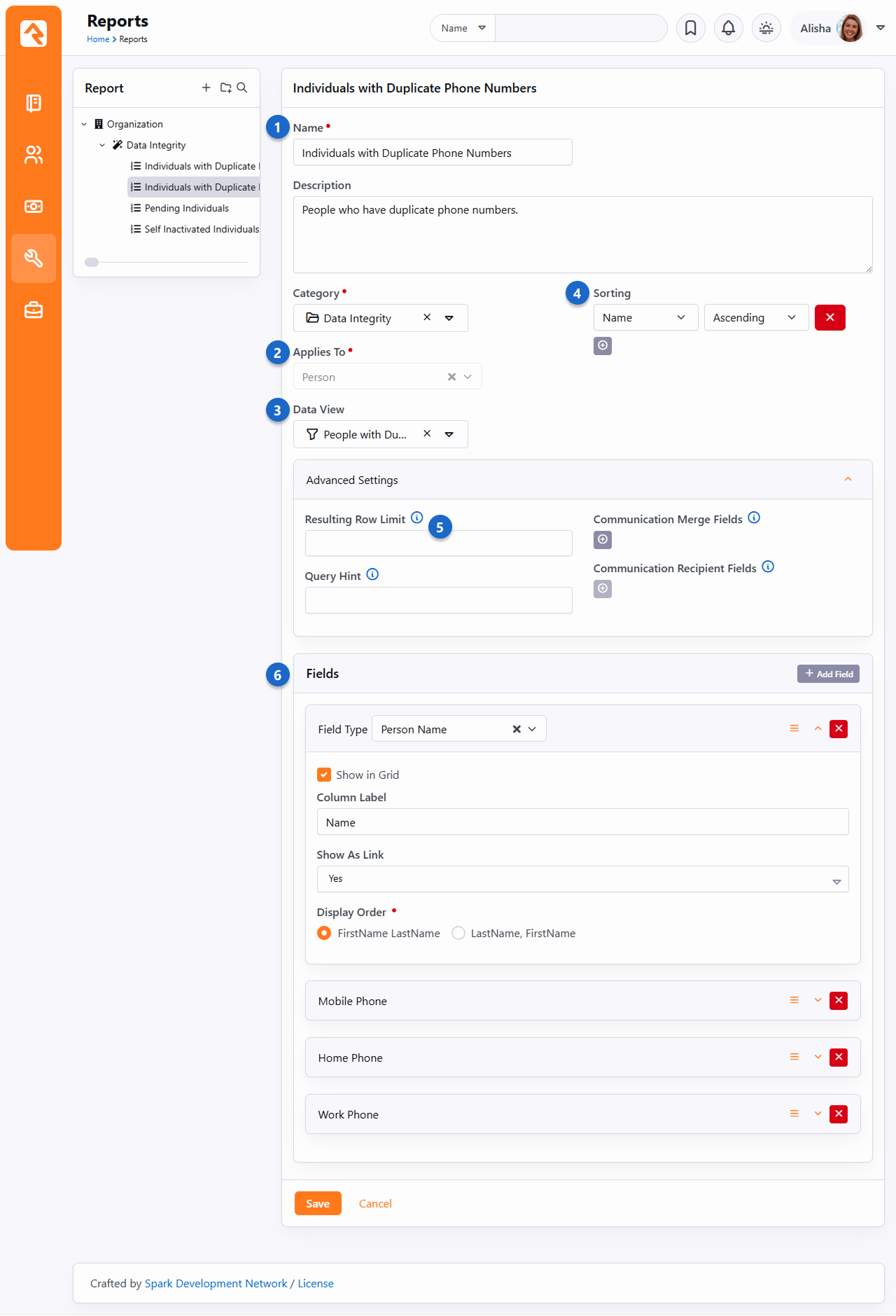 Let's jump right in and take a look at a report. For our example, we'll look at a report that gives the name and phone numbers of individuals with duplicate phone numbers. The figure below shows what this report would look like. The callouts for the figure explain the various steps used in the creation of our report. Name / Description - First, we give our report a name and description. We highly recommend that you spend some time writing a clear description that tells what the report does and how it should be used.Applies To - Next, select what type of entity you are writing a report for. In most cases this will be Person but, like Data Views, you can report on anything.Data View - Now that you have selected the entity, you'll see a list of Data Views you can use as the source for your report.Sorting - You can sort your report by any field you add in either ascending or descending order. You can even choose to sort on more than one field at a time.Resulting Row Limit - If needed, you can limit the number of records that are displayed on your report.Fields - Finally, you'll add the fields you want to display on your report. You can determine for each field whether or not you want it to display in the grid. You might be thinking, "If it's not on the grid where else would I see it?" If you don't check this button, the field will still be available when you export the report to Excel from the bottom of the grid. This is helpful for supporting information that is not needed very often.