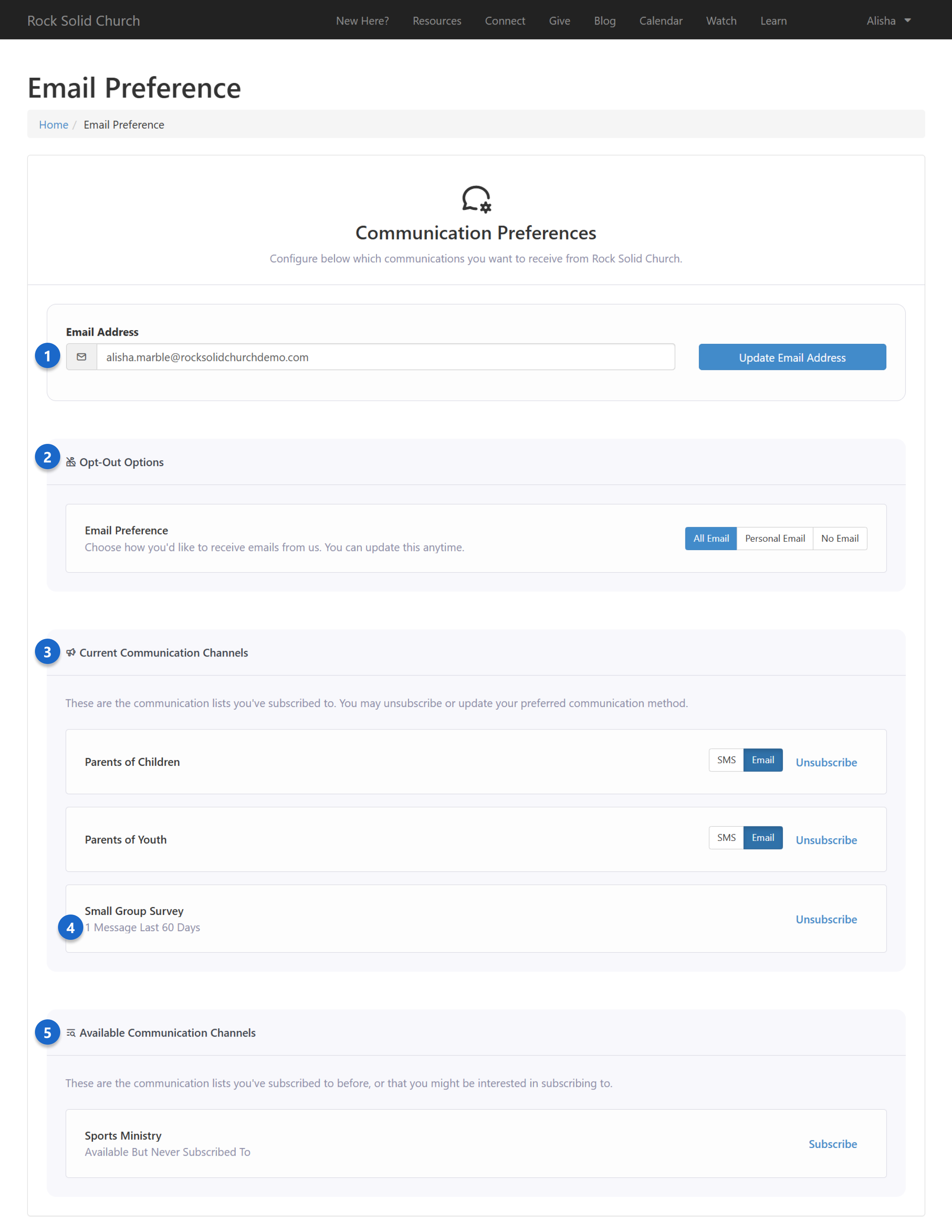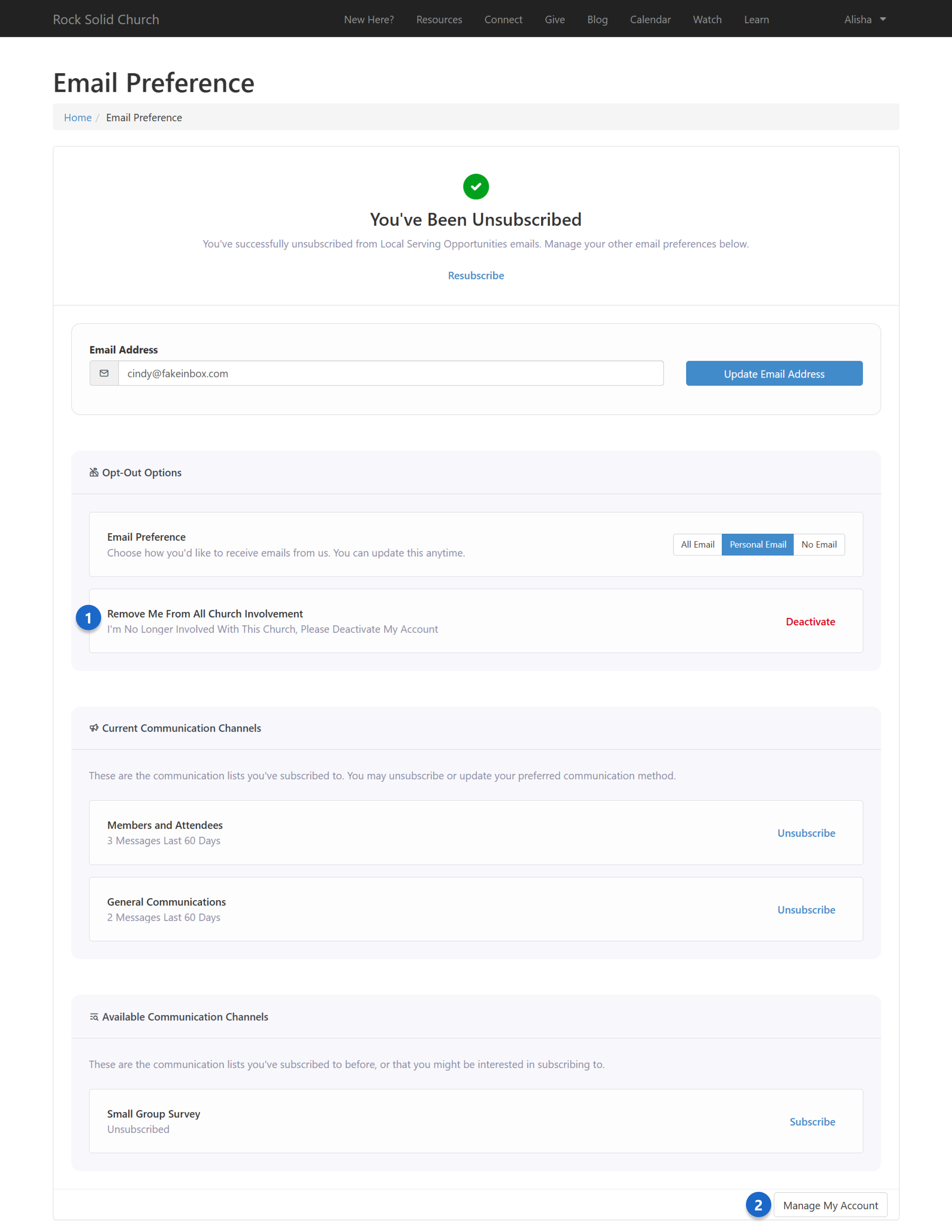 Configuring email in Rock involves more than just sending messages; it's about about balancing access to your people's inbox while maintaining a positive sender reputation. Why? Because when your emails are unsubscribed from, it can harm your reputation and impact whether your messages reach their intended recipients. Consider this: even if someone signed up for your emails, they might still report them as spam if they can't easily find the unsubscribe option. Or worse, they might start to unsubscribe but then resort to marking your emails as spam if the process isn't straightforward. That's why it's crucial to make unsubscribing as effortless as possible. This is especially true for Gmail accounts. Gmail specifies that everyone must “make it easy for recipients to unsubscribe” and “if you send more than 5,000 messages per day, your marketing and subscribed messages must support one-click unsubscribe.” Gmail also indicates that if your unsubscribe method involves sending an email, the request to unsubscribe must be processed within two days. Why all the focus on Gmail? Well, with over 1.5 billion active accounts, it’s probably used by many in your target audience, so we want to ensure we're sticking to their guidelines. TipLearn MoreTo read more about Gmail’s spam requirements, with links to additional resources, check out our blog post on the topic. We also look to Gmail's rules because they will help cover you from a legal perspective. Gmail policies are more stringent than the US CAN-SPAM Act, which also has requirements related to unsubscribing. Adherence to the CAN-SPAM Act is crucial. Otherwise you expose your organization to potential legal action and hefty fines from the FTC. Now, let's talk about how Rock can help you comply with these requirements. We've designed features to streamline the unsubscribing process. For more details on these settings, see the Communication Mediums section above. Bulk Email Threshold - Automatically categorizes emails as bulk if the recipient list exceeds this threshold, ensuring unsubscribe links. This hides the bulk option for new communications.Request Unsubscribe Email - Generates an email for unsubscribing, which must be processed within two days. If Enable One-Click Unsubscribe is set to “Yes” (which we recommend) this email address should never be used.Enable One-Click Unsubscribe - Our recommended default setting of “Yes” is in line with Gmail's requirements.Unsubscribe URL - Provides an alternative to one-click unsubscribing, directing recipients to a specified URL. TipNot Gmail-CompliantIf Enable One-Click Unsubscribe is set to "No" and if the Unsubscribe URL is blank, nothing will be added to the header of the email. With the above configuration in place, your emails will have an “Unsubscribe” option as pictured below. Header Unsubscribe - Supports one-click unsubscribe functionality, though it’s not universally supported by all email clients.Unsubscribe Link - Directs recipients to the Rock Unsubscribe page on the external site. Some clients support one-click unsubscribe functionality, though it’s not universally supported by all email clients. Set Subscription Preferences The Email Preferences page is the single place to go to manage Communication Preferences and List Subscriptions. When someone clicks an unsubscribe link, they’re taken to this page, which uses the Communication Preference block. This block lets recipients choose cherry pick which communications they want to receive and which to stop. It can operate in two modes: Communication Preferences Mode - A page where people can navigate to update their email preferences.Unsubscribe Mode - Accessed through an email link when someone chooses to unsubscribe. Communication Preferences Mode Email Address - Shows current Email Address. You can enter a new address then select Update Email Address. Global Opt-Out Options - All Email - Receive all emails, including personal emails and mass emails.Personal Email - When clicked, this person is removed from all Communication Lists or Campaigns, but may receive individual emails. This will mark the person's “Email Preference” to “No Mass Emails” on their profile. No Email - No emails will be sent to this email. Current Communication Channels - Lists a person’s currently subscribed Communication Lists, and any Communication Flows they have been added to. Communication Lists show their Medium Preference if enabled. Select Unsubscribe to leave a list.Message Count - Shows how many messages were sent for each Communication Flow or List. You can configure the time window in the settings.Available Communication Channels - Subscribe to opt in.Communication Lists a person can join. People can select Subscribe to join a new list. All changes to Email Preferences are logged in the Person History section of the Person Profile. For more control over what actions can be taken from the Email Preference block, head to the block settings. Communication Configuration Options - Select which actions the page offers: Update Email Address - Recipients can change their profile's email address.Manage Channel Subscriptions - Offer recipients an opportunity to opt out or into different channels.Remove Involvement (Unsubscribe Mode only) - Recipients can remove themselves from all communications and deactivate their account. Show Header Icon - Show a default icon beside the header title. Exclude Communication Flows - Hide flows from the Current and Available sections. Filter Communication Lists by Campus Context - Filter lists by the page’s campus context. Lists with no campus always show. Always Include Subscribed Communication Lists - When campus filtering is on, still show lists the person already receives. Category filters still apply. Message Count Window (In Days) - Set lookback days for message counts shown under Channel names (e.g., "1 Message Last 30 Days"). Set to 0 to disable. Manage My Account Page - Choose the pa