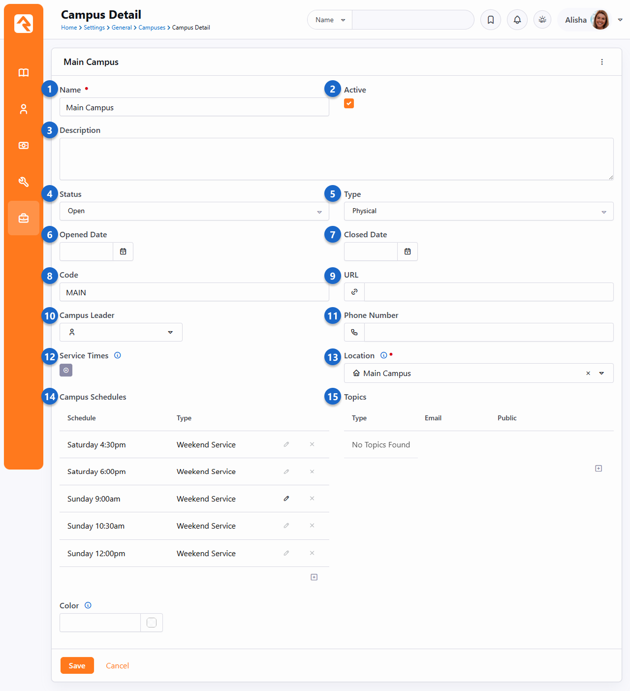 You can create or maintain campuses from Admin Tools > Settings > Campuses. There you'll see a list of campuses that you can manage or add to. Selecting a campus will bring up the campus details screen. NoteLocationsBefore adding a new campus, you must first add its address under Admin Tools > Settings > Named Locations. Name - Even if you only have one campus, choose a name that will still make sense if you ever expand. A simple name like "Main" or "West" typically works well.Active - As you bring new campuses online, you may want to add them as inactive until you have time to configure them and prepare for the announcement.Description - You can use this field to provide a description for your campus. This might be something you display to your website guests.Status - Sometimes there are pending campuses that are not yet open that you want to begin configuring, or which are now closed but important to keep for record-keeping. Campus statuses use the Type - You may want to easily differentiate between different types of campuses – whether Physical, Online or some other type. Campus types use the Campus Status defined type. Opened Date - The date this campus went live.Closed Date - The date this campus closed, if applicable.Code - When you grow beyond two or three sites, it's common to develop a shorter naming convention to help you refer to a campus. For example, if your campus is named “Main Campus” then you might choose “MAIN” as a short code.URL - The web address for the campus.Campus Leader - Here you can optionally indicate the person who's in charge of running the campus.Phone Number - If the campus has its own phone number, you can provide it here.Service Times - Here you can list the days and times that this campus offers services.Location - Select a Campus location. This is defined in Campus Schedules - Here you can associate Schedules directly with the campus. This can be done for reference, but also can be used by blocks like Service Metrics Entry.Campus Topics - Here you can associate an email address with a campus topic. The Topic Type is a defined value. This can be used to send notifications of Rock Campus Status & Campus Type A lot of the setup for Campuses is pretty straightforward, but there are some important points you'll want to keep in mind about the Status and Type fields. Rock ships with three Campus Status values (Closed, Open and Pending) and two Campus Type values (Physical and Online). These are ready for you to use out of the box as Defined Types. However, these values can't be deleted through Rock and shouldn't be deleted by other means. That said, how you use them is entirely up to you. If needed, you can add new values to the Defined Types lists or change the names of the existing values. NoteEven if the Type is "Online" you're still required to have a Location value. As with any campus, the Location Type assigned to the Location you choose must be "Campus". If you’re not sure what Location to use for an online campus, best practice is to choose the one most closely associated with the website. TipUpgrading Rock?If you’re upgrading Rock from an older version that doesn't have Status and Type configuration, then your existing campuses will have these values automatically assigned. Any active campus will get a Status of Open and an inactive campus will get a Status of Pending. The assigned Type will be Physical for all campuses, except Online will be assigned if the name of the campus has "online" or "on-line" in it.